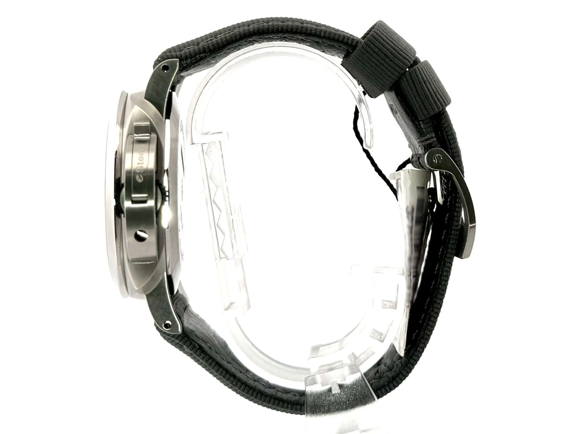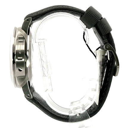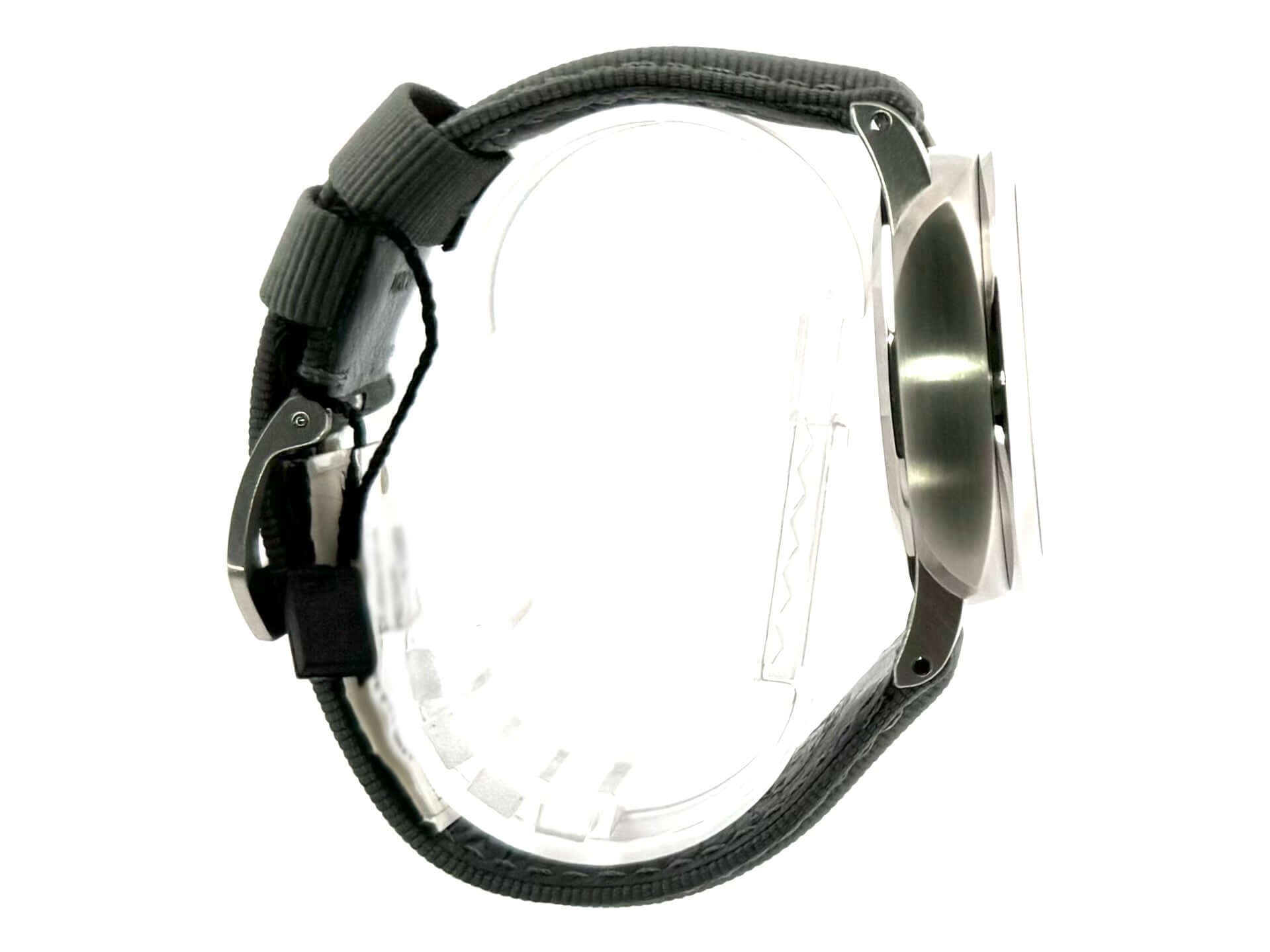 Gehäuse aus Edelstahl satiniert, Gehäusedurchmesser 44 mm, Edelstahl Lünette poliert, graues Zifferblatt mit fluoreszierenden arabischen Ziffern, graues Textilband mit Dornschließe aus satiniertem Edelstahl, Automatikuhrwerk, exclusive Panerai Eigenfertigung, Kaliber Panerai P.9010, 31 Steine, Schwingung 28.800 A/h, 72 Stunden Gangreserve, Glucydur-Unruh, Incabloc-Stoßsicherung, Datumsanzeige, kleine Sekunde, Gehäuseboden mit transparentem Saphirglas, Wasserdicht bis zu 30 bar.