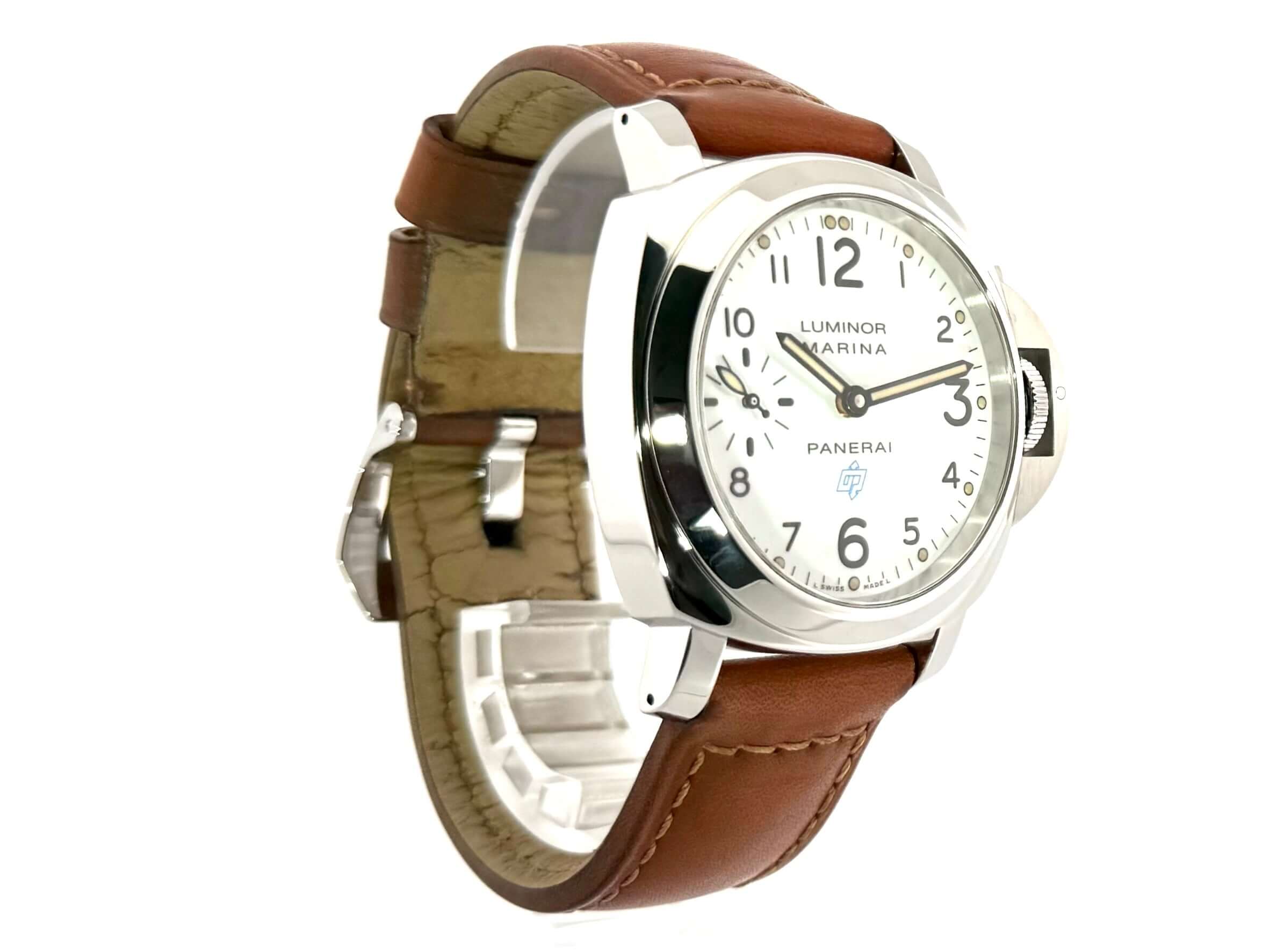 Gehäuse aus Edelstahl poliert, Gehäusedurchmesser 44 mm, Edelstahl Lünette poliert, braunes Lederarmband mit Dornschließe aus poliertem Edelstahl, weißes Zifferblatt mit arabischen Ziffern und Leuchtpunkten, Uhrwerk mit Handaufzug, Kaliber Panerai OP II, 17 Steine, 21.600 A/h., Gangreserve 56 Stunden, kleine Sekunde, Saphirglas aus Korund, Kronenschutzbrücke, Gehäuseboden aus Edelstahl, Wasserdicht bis zu 10 bar.