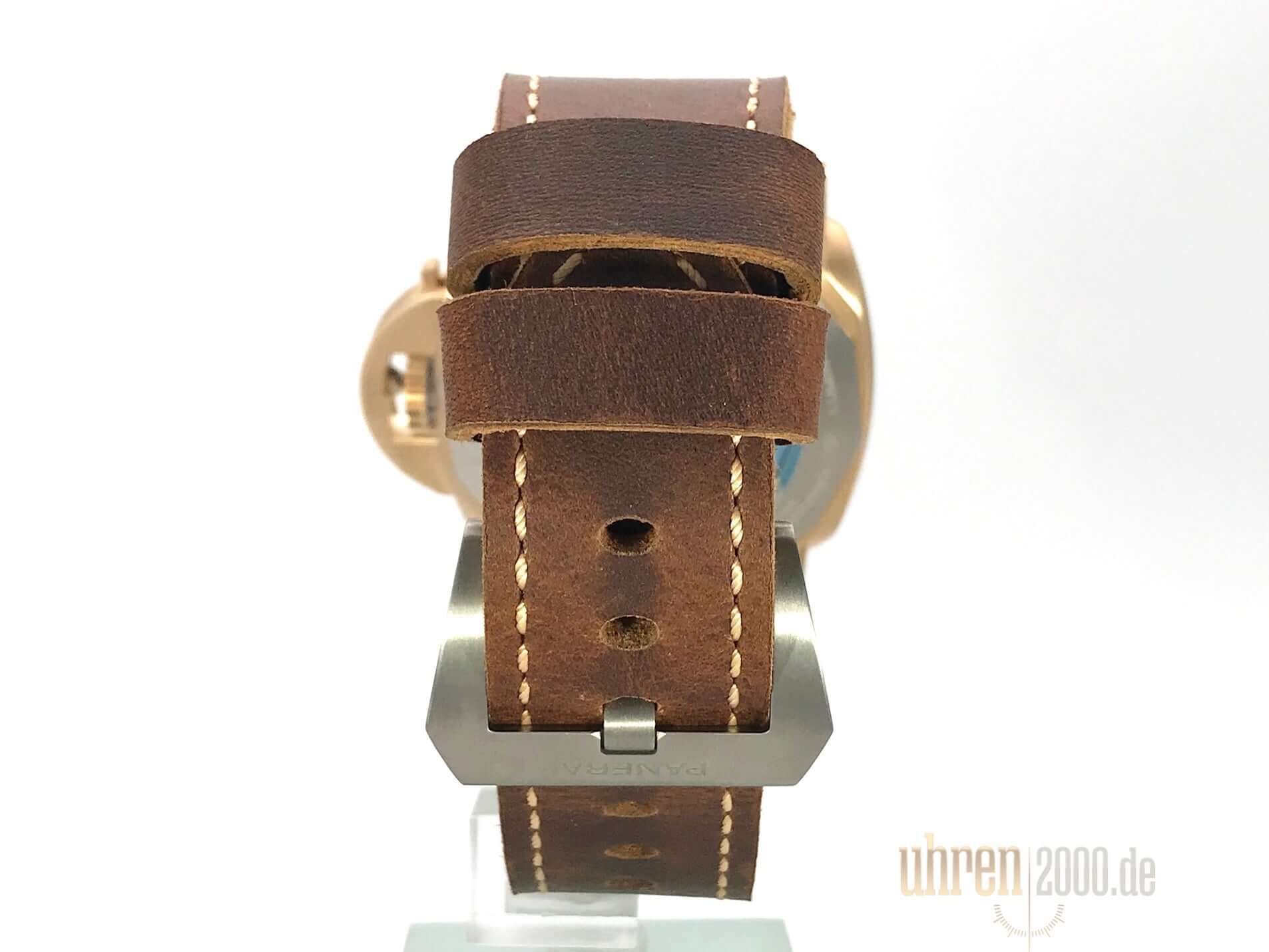 Gehäuse aus Bronze, Gehäusedurchmesser 47 mm, Lünette aus Bronze einseitig drehbar, braunes Lederarmband mit Dornschließe, blaues Zifferblatt mit aufgesetzten fluoreszierenden Indexen, Datumsanzeige auf 3 Uhr, kleine Sekundenanzeige auf 9 Uhr, Automatikwerk, Kaliber Panerai P.9010, vollständige Panerai Eigenfertigung, 31 Steine, Schwingung 28.800 A/h., Gangreserve 72 Stunden, Glucydur-Unruh, Stunden, Minuten, kleine Sekundenanzeige, Datumsanzeige, Entspiegeltes Saphirglas aus Korund, Gehäuseboden verschraubt aus Titan, Bronze Kronenschutzbrücke, Wasserdicht bis zu 30 bar.