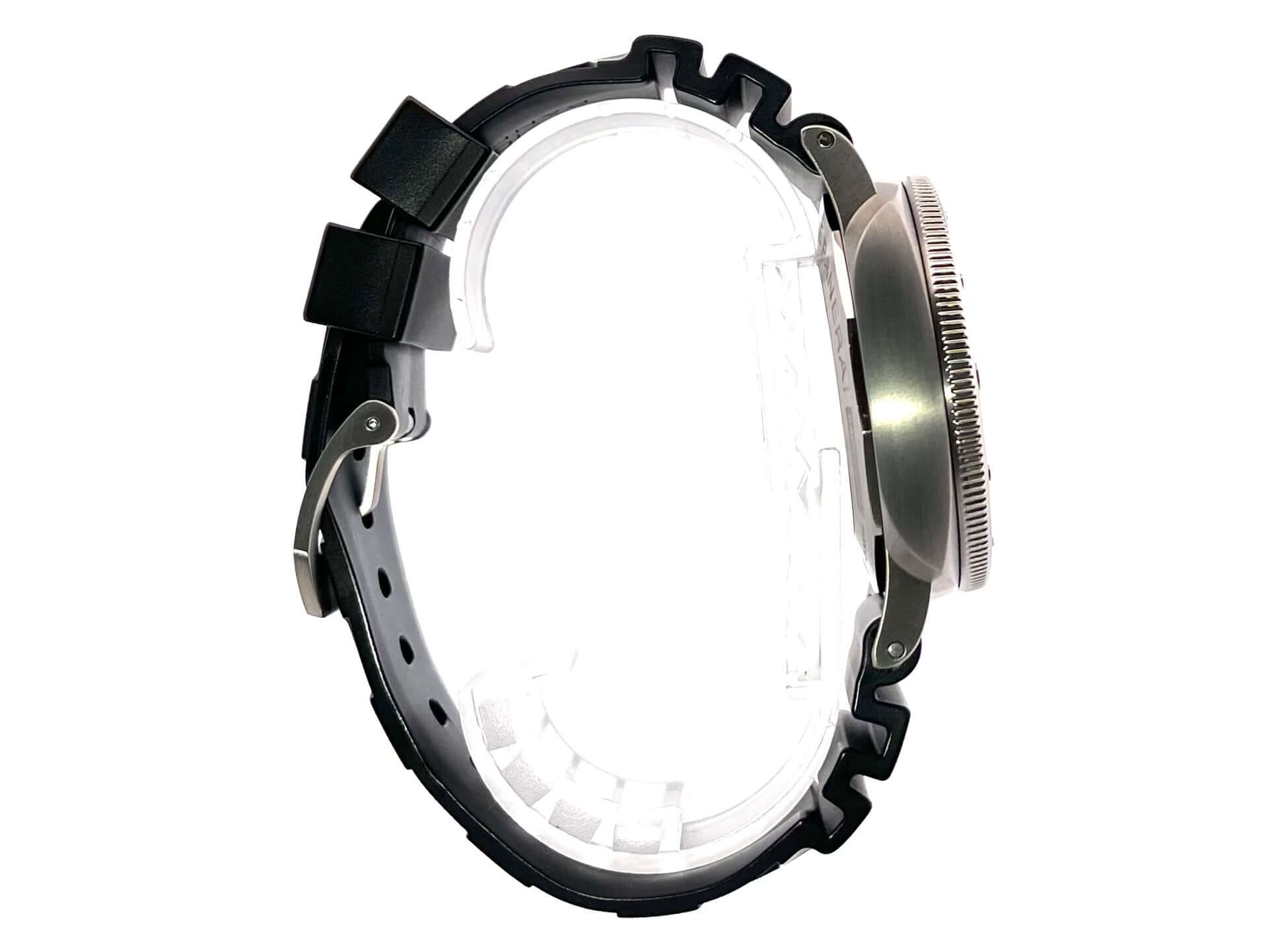 Gehäuse aus Titan, Gehäusedurchmesser 47 mm, Lünette aus Titan einseitig drehbar, schwarzes Zifferblatt mit aufgesetzten fluoreszierenden Indexen, Datumsanzeige auf 3 Uhr, Sekundenanzeige auf 9 Uhr, schwarzes Kautschukarmband mit Dornschließe aus satiniertem Titan, Automatikwerk, Kaliber Panerai P.9010, vollständige Panerai Eigenfertigung, 31 Steine, Schwingung 28.800 A/h., Gangreserve 72 Stunden, Glucydur-Unruh, Stunden, Minuten, kleine Sekundenanzeige, Datumsanzeige, Entspiegeltes Saphirglas aus Korund, Gehäuseboden verschraubt aus Titan, Titan Kronenschutzbrücke, Wasserdicht bis zu 30 bar.