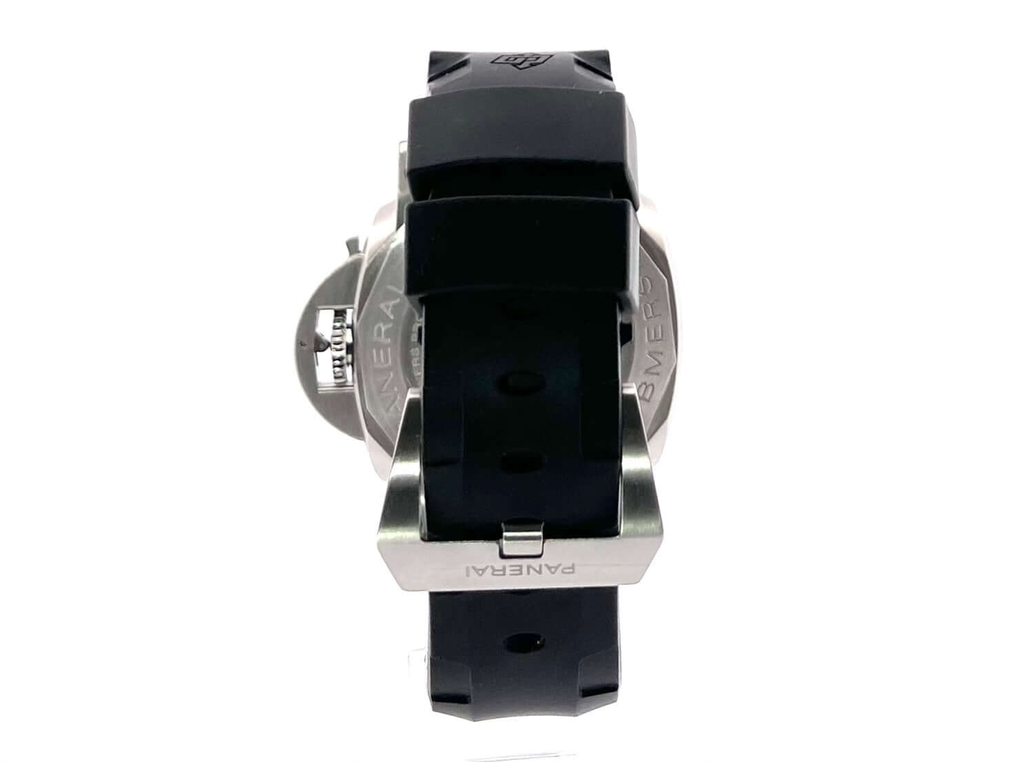 Gehäuse aus satiniertem Edelstahl, Gehäusedurchmesser 42 mm, Lünette aus satiniertem Edelstahl, einseitig Drehbar, Kautschukband mit Dornschließe aus Edelstahl, schwarzes Zifferblatt mit aufgesetzten fluoreszierenden Indizes, Datumsanzeige auf 3 Uhr, Sekundenanzeige auf 9 Uhr, Automatikwerk, Kaliber Panerai P900, Schwingung 28.800 A/h., Gangreserve 72 Stunden, Datumsanzeige, kleine Sekunde, Saphirglas aus Korund, Gehäuseboden verschraubt aus Edelstahl, Kronenschutzbrücke, Wasserdicht bis zu 30 bar.