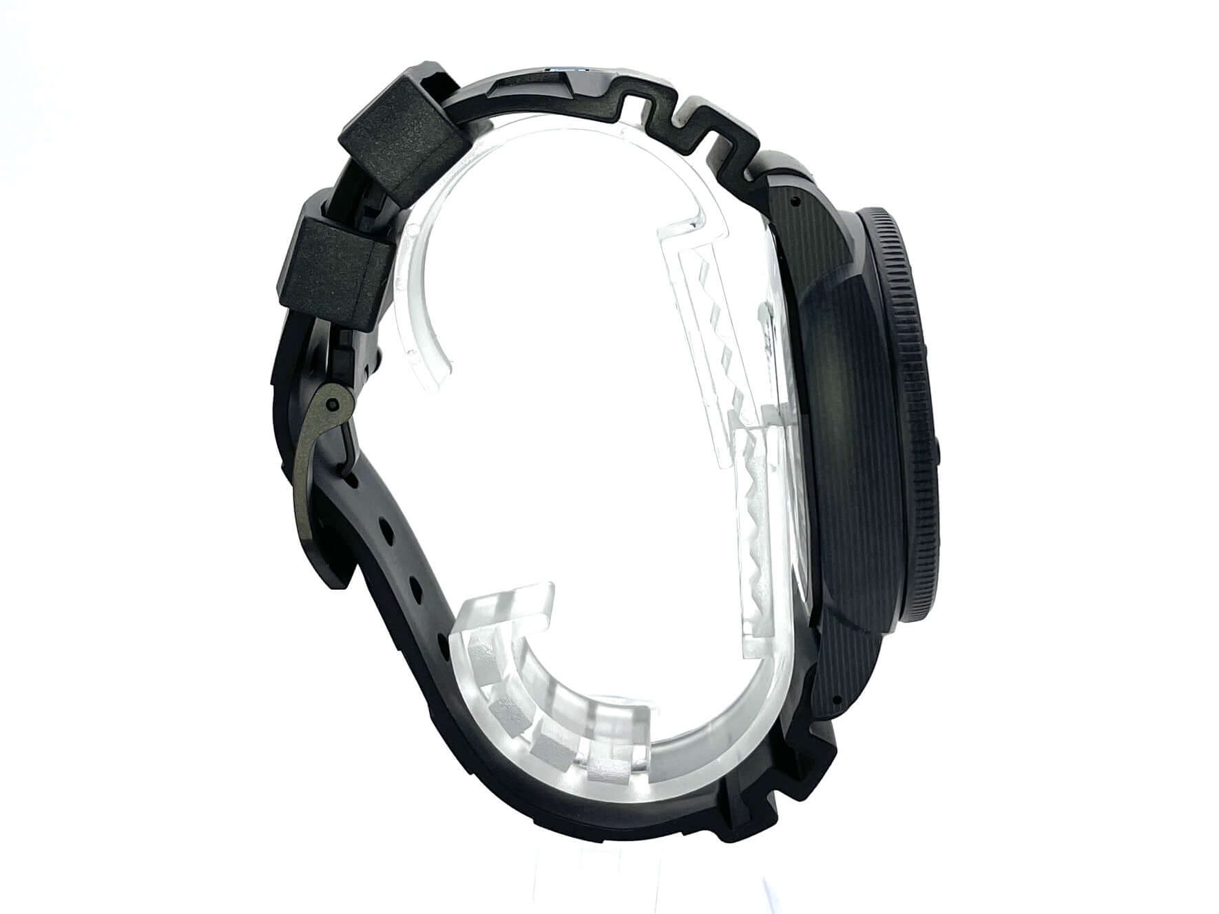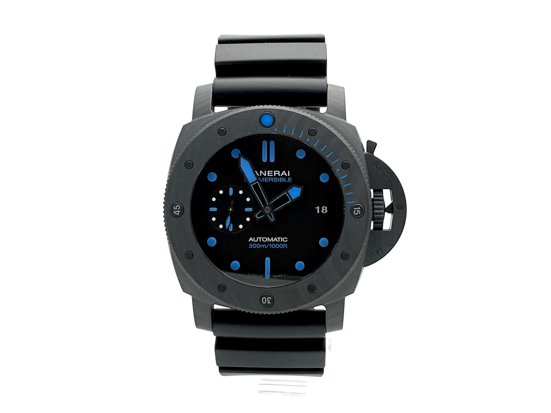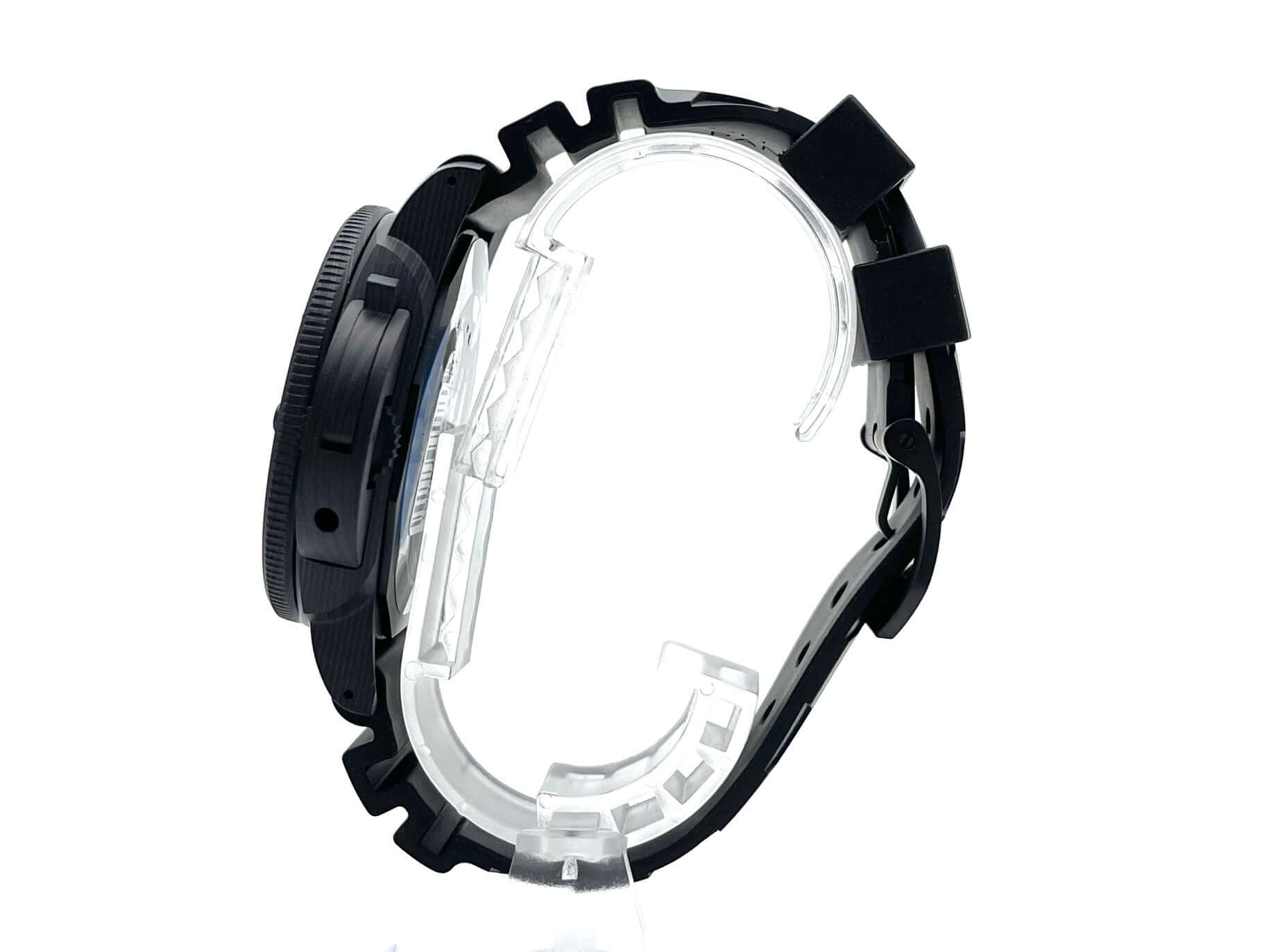 Gehäuse aus Carbotech, Gehäusedurchmesser 47 mm, Lünette aus Carbotech einseitig drehbar, schwarzes Kautschukarmband mit Dornschließe aus satiniertem Titan, schwarzes Zifferblatt mit aufgesetzten blau fluoreszierenden Indizes, Datumsanzeige auf 3 Uhr, Sekundenanzeige auf 9 Uhr, Automatikwerk, Kaliber Panerai P.9010, vollständige Panerai Eigenfertigung, 31 Steine, Glucydur-Unruh, Schwingung 28.800 A/h., Gangreserve 72 Stunden, Datumsanzeige, kleine Sekundenanzeige, Entspiegeltes Saphirglas aus Korund, Gehäuseboden verschraubt aus Titan mit schwarzer Beschichting, Carbotech Kronenschutzbrücke, Wasserdicht bis zu 30 bar.