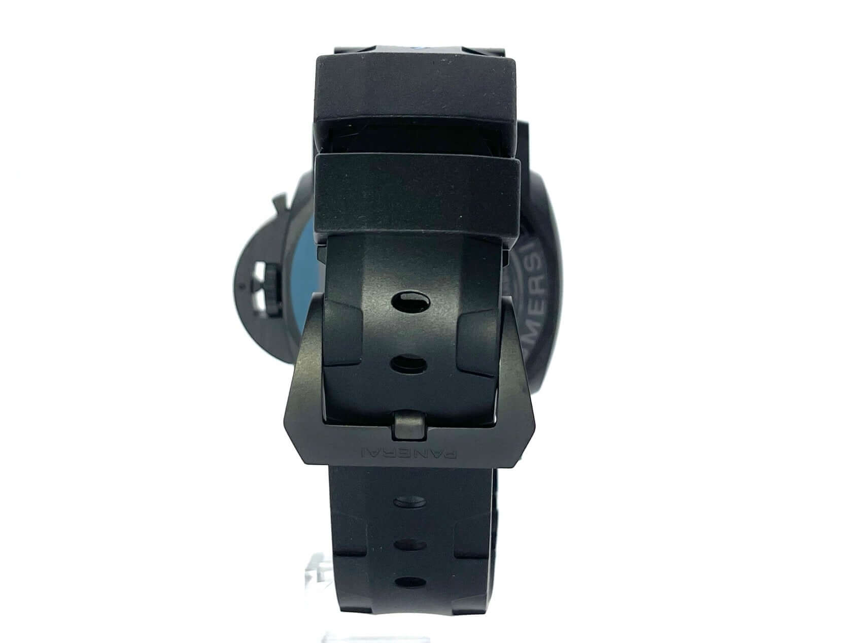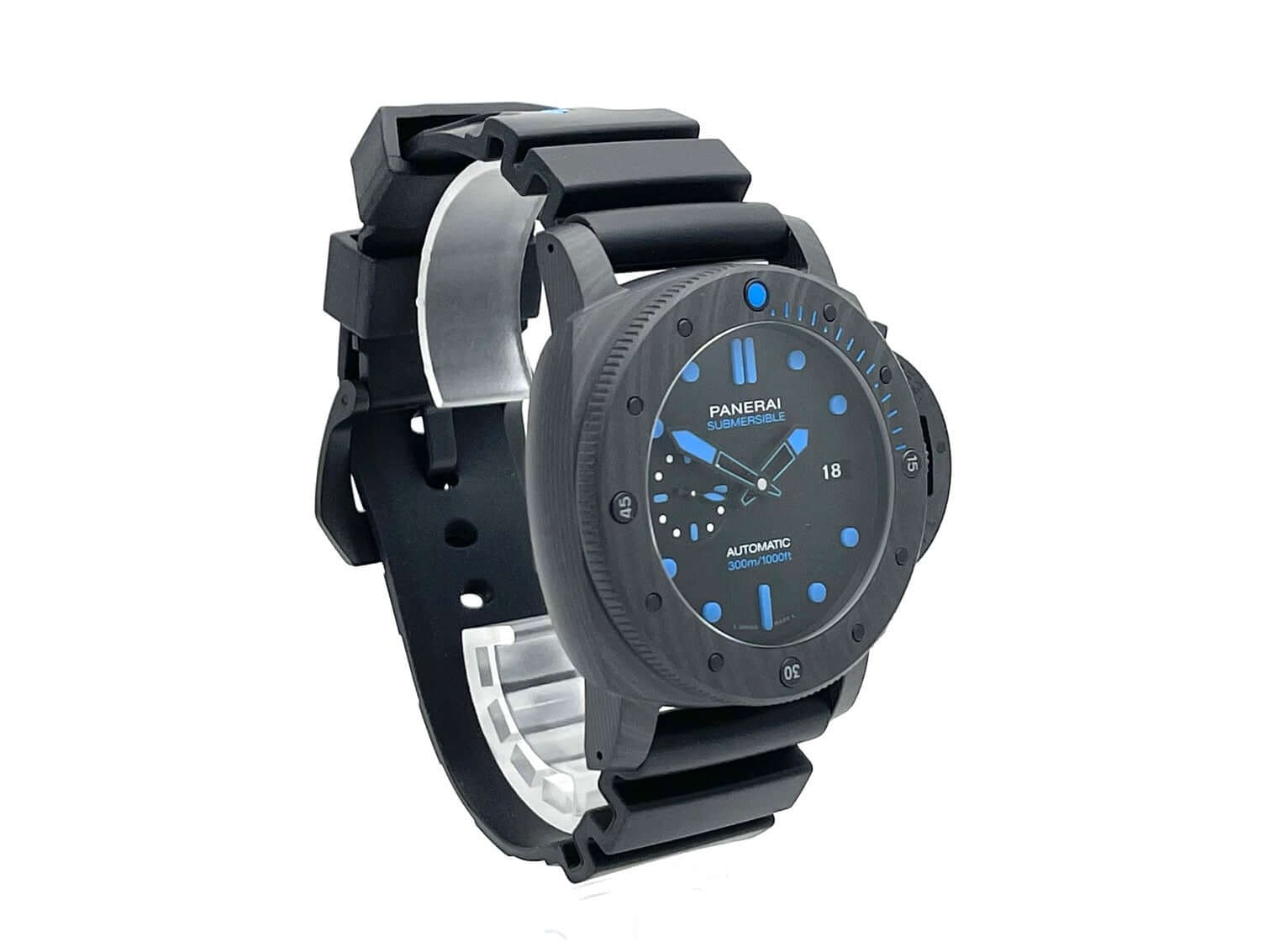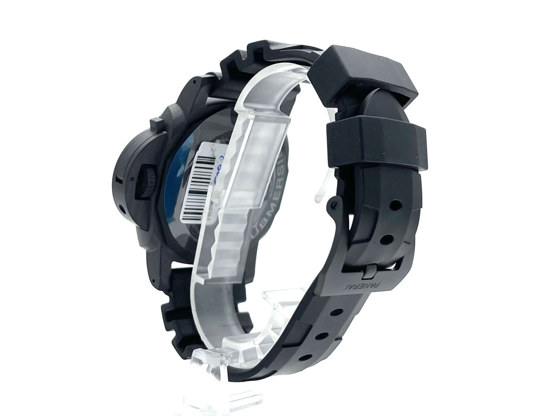 Gehäuse aus Carbotech, Gehäusedurchmesser 47 mm, Lünette aus Carbotech einseitig drehbar, schwarzes Kautschukarmband mit Dornschließe aus satiniertem Titan, schwarzes Zifferblatt mit aufgesetzten blau fluoreszierenden Indizes, Datumsanzeige auf 3 Uhr, Sekundenanzeige auf 9 Uhr, Automatikwerk, Kaliber Panerai P.9010, vollständige Panerai Eigenfertigung, 31 Steine, Glucydur-Unruh, Schwingung 28.800 A/h., Gangreserve 72 Stunden, Datumsanzeige, kleine Sekundenanzeige, Entspiegeltes Saphirglas aus Korund, Gehäuseboden verschraubt aus Titan mit schwarzer Beschichting, Carbotech Kronenschutzbrücke, Wasserdicht bis zu 30 bar.