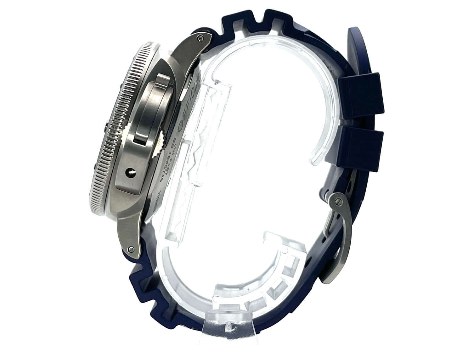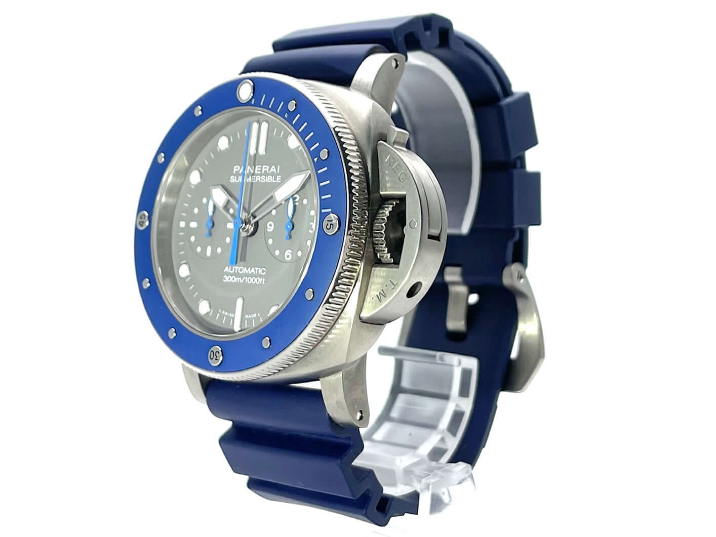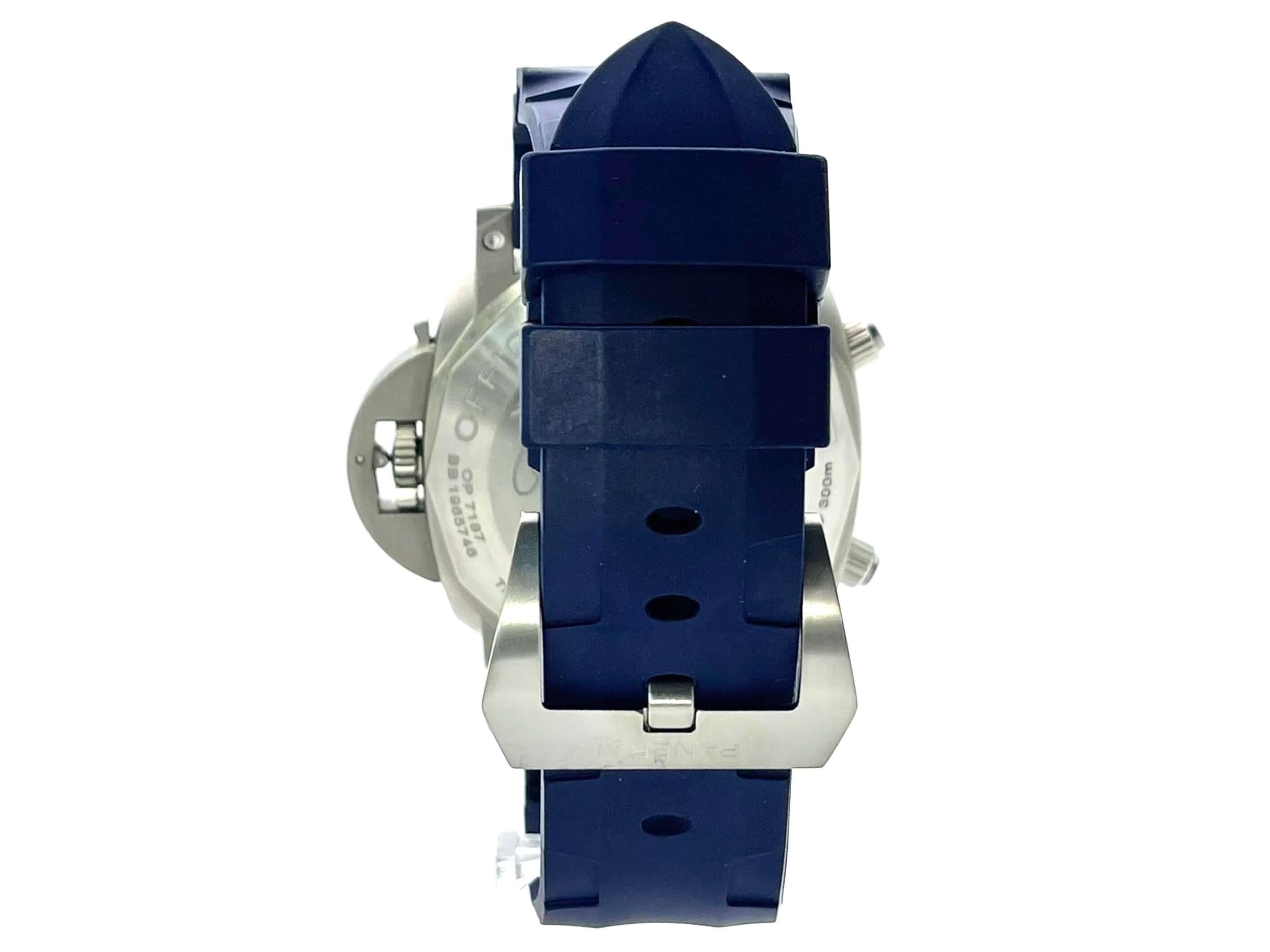 Gehäuse aus Titan, Gehäusedurchmesser 47 mm, Lünette aus Titan mit blauer Keramikeinlage einseitig drehbar, graues Zifferblatt mit aufgesetzten fluoreszierenden Indizes, blaues Kautschukarmband mit Dornschließe aus satiniertem Titan, Automatikwerk, Kaliber Panerai P.9100, vollständige Panerai Eigenfertigung, 37 Steine, Schwingung 28.800 A/h., Gangreserve 72 Stunden, Flyback-Chronograph, Glucydur-Unruh, kleine Sekundenanzeige, Entspiegeltes Saphirglas aus Korund, Gehäuseboden verschraubt aus Titan, Titan Kronenschutzbrücke, Wasserdicht bis zu 30 bar.