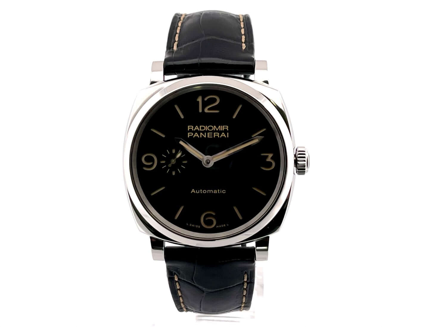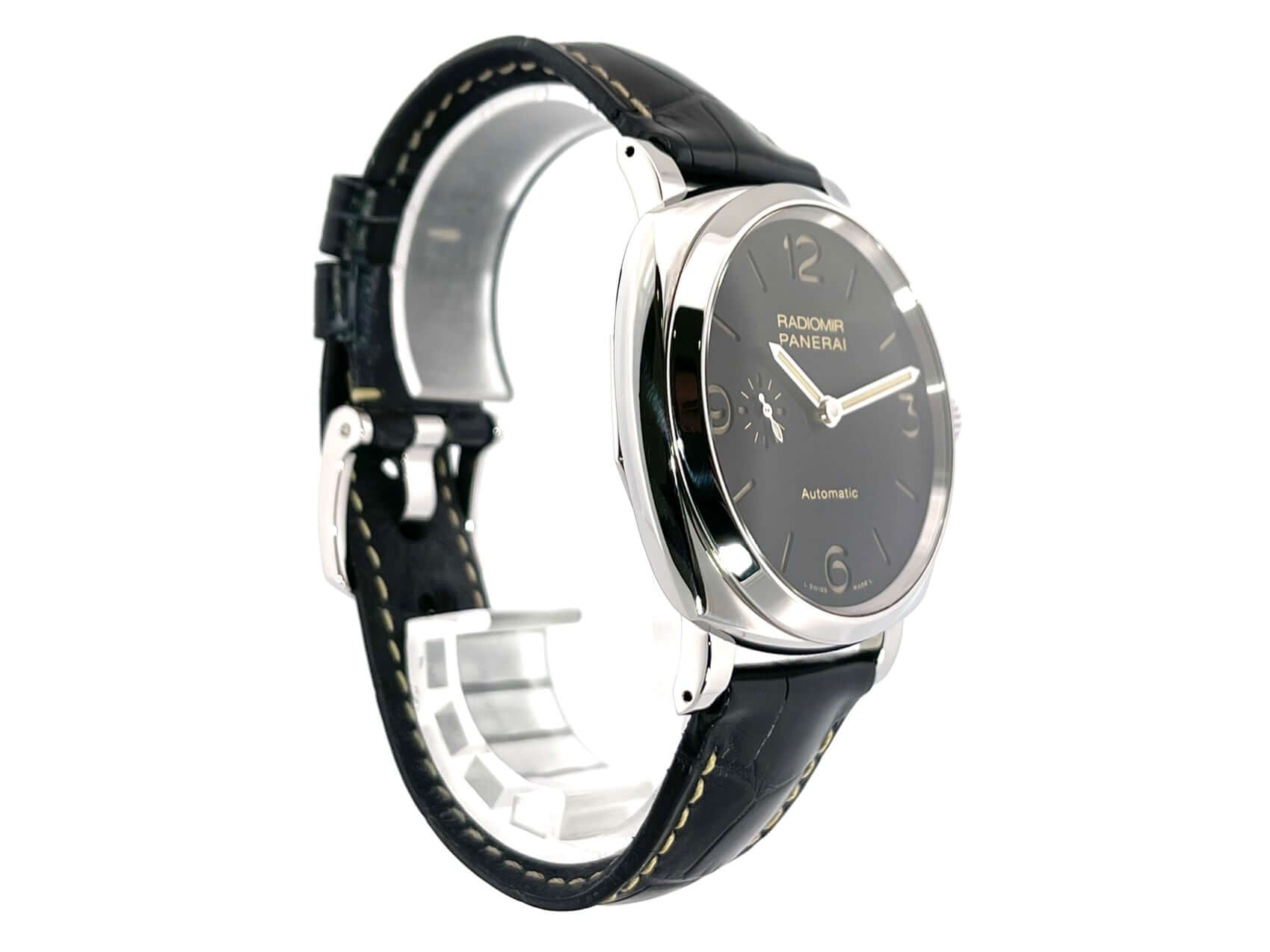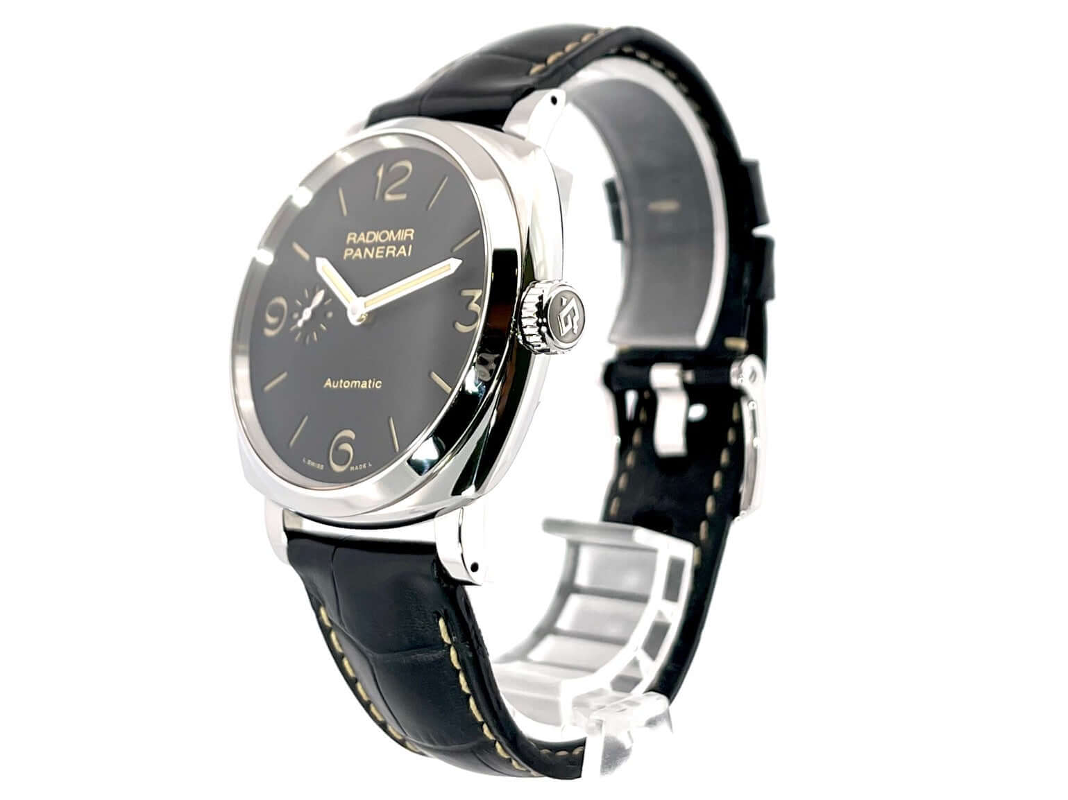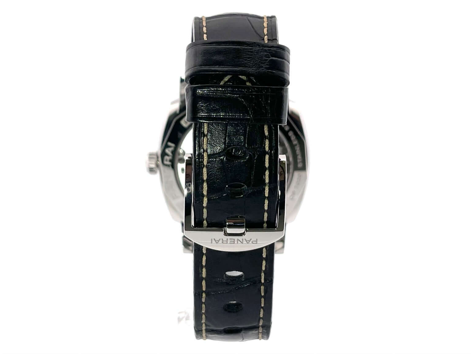 Gehäuse aus Edelstahl poliert, Gehäusedurchmesser 42 mm, schwarzes Alligatorlederarmband mit Dornschließe aus poliertem Edelstahl, schwarzes Zifferblatt mit fluoreszierenden arabischen Ziffern und Indizes, Sekundenanzeige auf 9 Uhr, Automatikuhrwerk, Kaliber Panerai P.4000, vollständige Panerai Eigenfertigung, 31 Steine, 28.800 Schwingungen, Glucydur-Unruh, Gangreserve 72 Stunden, kleine Sekundenanzeige, entspiegeltes Saphirglas aus Korund, Gehäuseboden aus Edelstahl mit Saphirglas, Wasserdicht bis zu 10 bar.