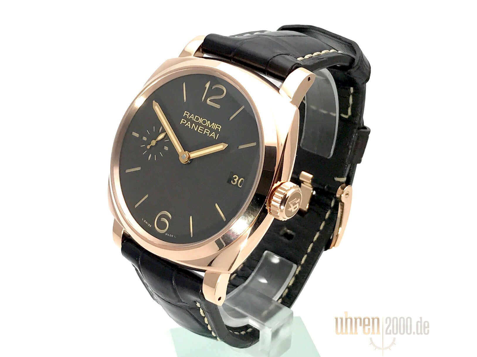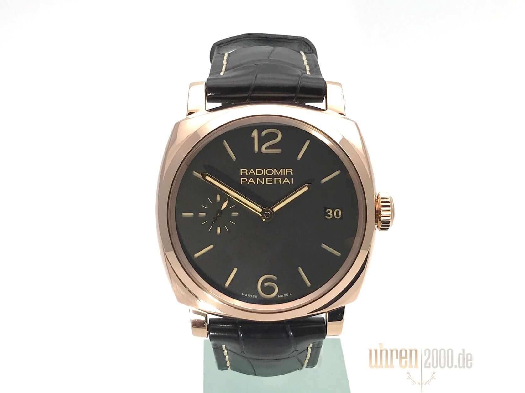 Gehäuse aus 18 kt Rotgold poliert, Gehäusedurchmesser 47 mm, Lünette in 18 kt Rotgold poliert, schwarzes Alligatorlederarmband mit Dornschließe aus poliertem 18 kt Rotgold, braunes Zifferblatt mit arabischen Leuchtzahlen und Stundenmarkierungen, Datumsanzeige auf 3 Uhr, Sekundenanzeige auf 9 Uhr, Handaufzug, Kaliber Panerai P.3000, vollständige Panerai Eigenfertigung, 21 Steine, Schwingung 21.600 A/h., Gangreserve 72 Stunden, Stunden, Minuten, kleine Sekundenanzeige, Verschraubte Aufzugskrone mit OP Schriftzug, entspiegeltes Saphirglas aus Korund, 18 kt Rotgold Gehäuseboden mit Saphirglas, Wasserdicht bis zu 10 bar.
