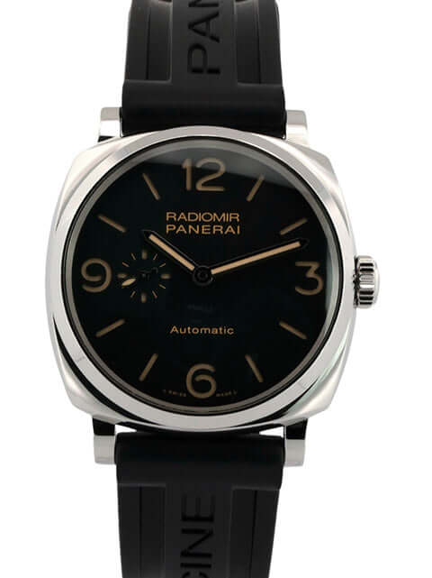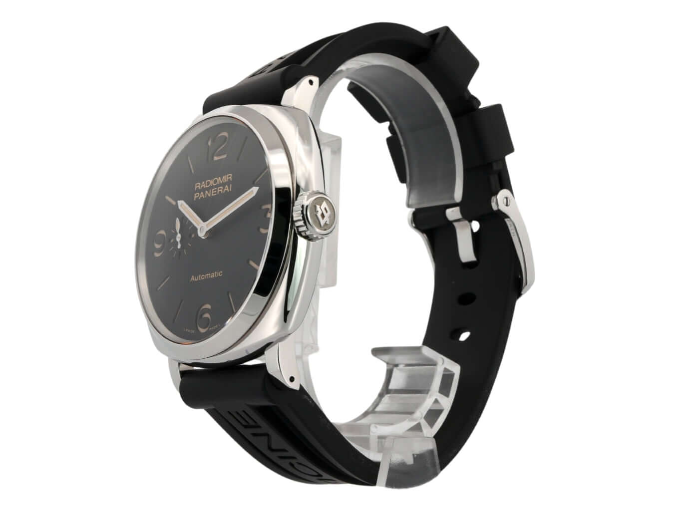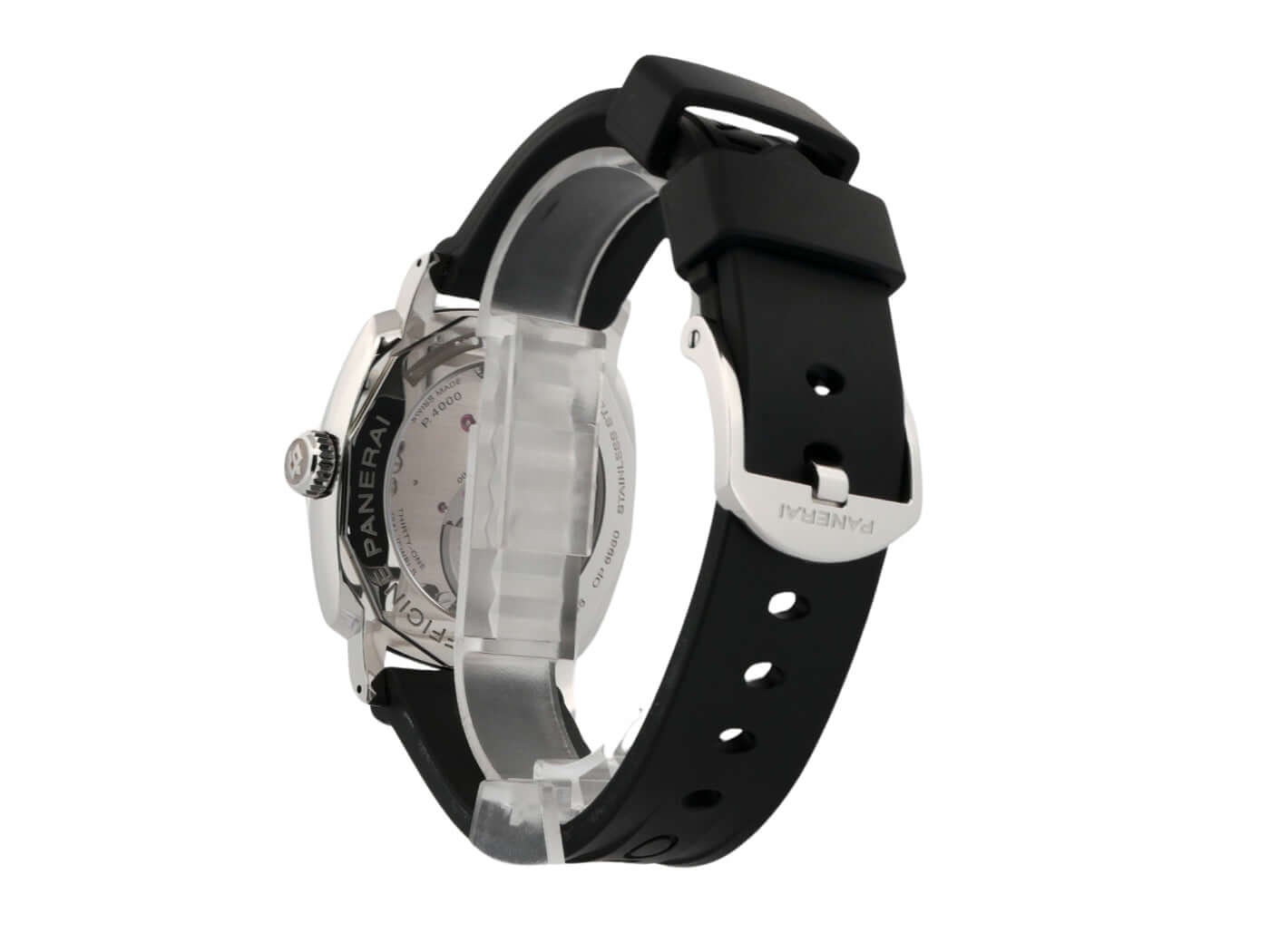 Gehäuse aus Edelstahl poliert, Gehäusedurchmesser 45 mm, schwarzes Kautschuk mit Dornschließe aus poliertem Edelstahl, schwarzes Zifferblatt mit fluoreszierenden arabischen Ziffern und Indizes, Automatikuhrwerk, Kaliber Panerai P.4000, vollständige Panerai Eigenfertigung, 31 Steine, Glucydur-Unruh, 28.800 Schwingungen/Stunde, Gangreserve 72 Stunden, kleine Sekundenanzeige, entspiegeltes Saphirglas aus Korund, Gehäuseboden aus Edelstahl mit Saphirglas, Wasserdicht bis zu 10 bar.