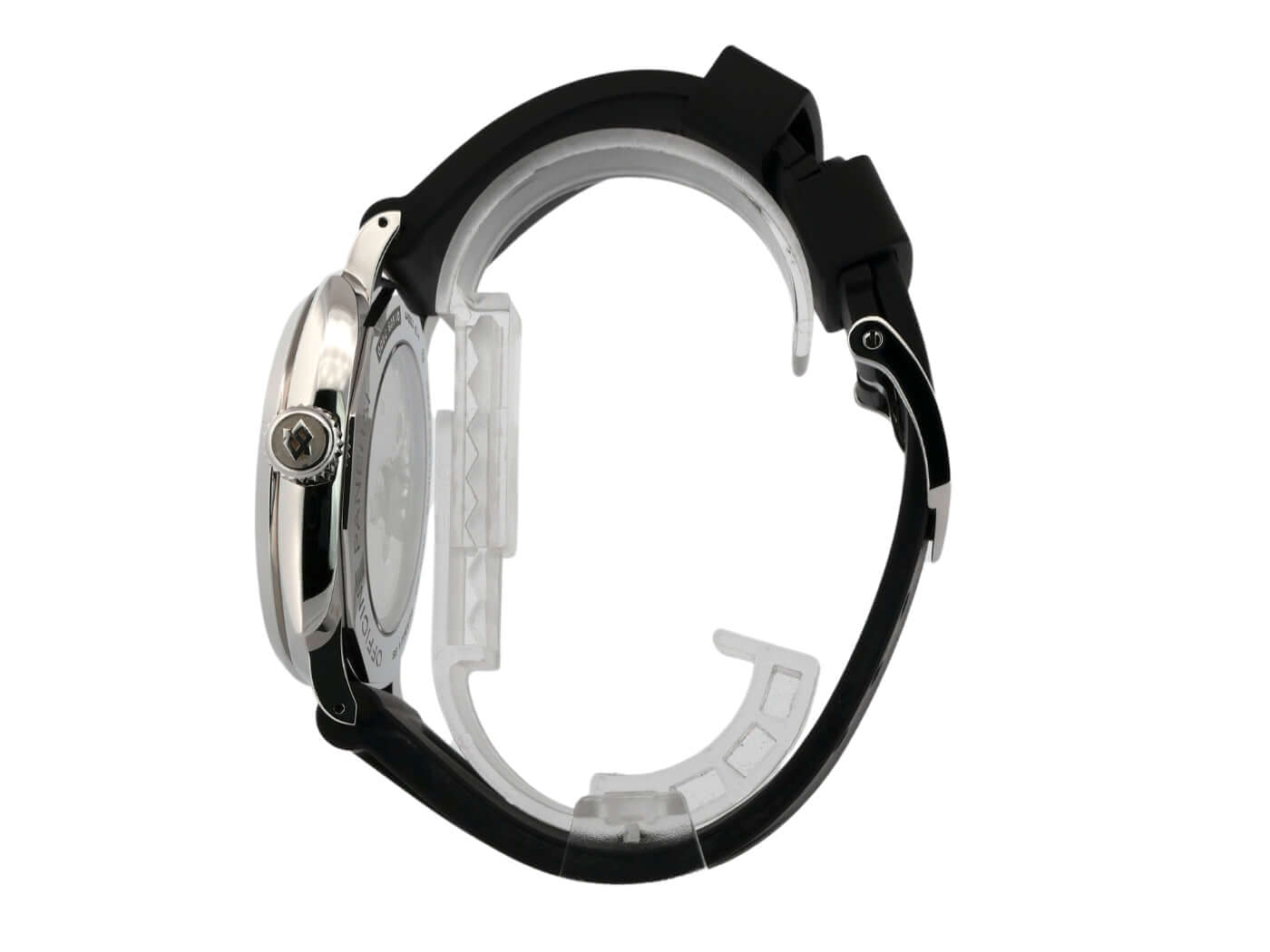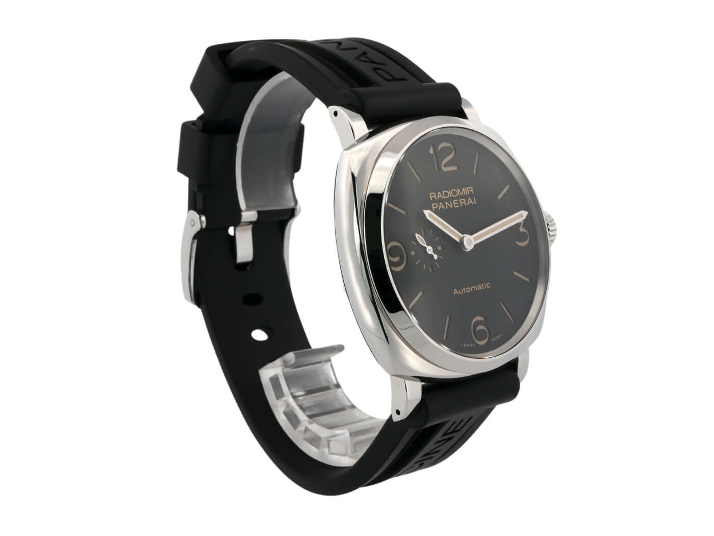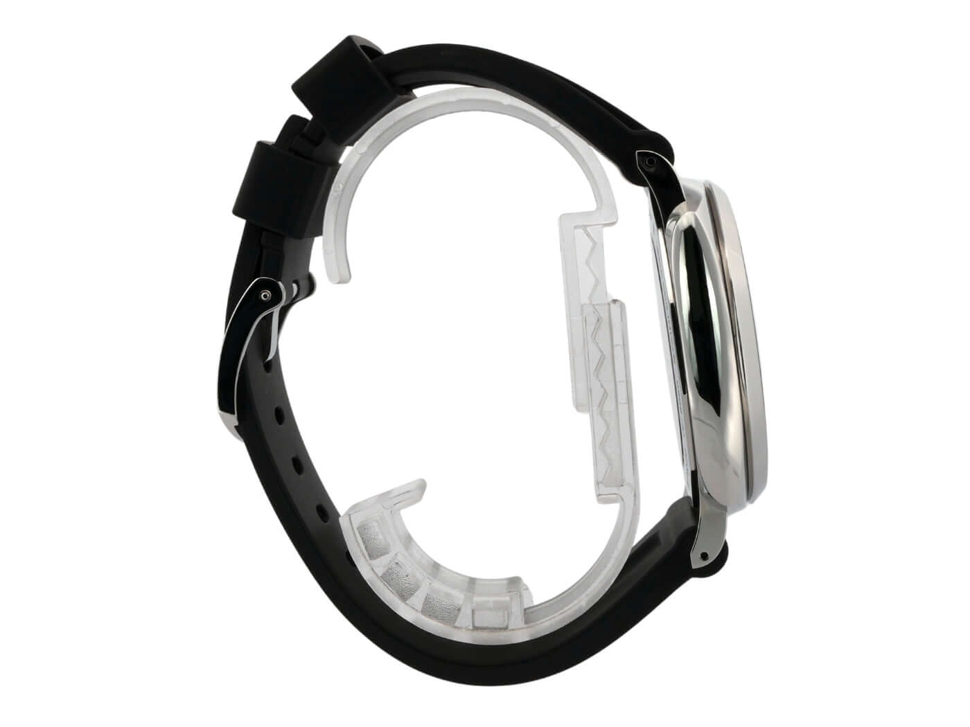 Gehäuse aus Edelstahl poliert, Gehäusedurchmesser 45 mm, schwarzes Kautschuk mit Dornschließe aus poliertem Edelstahl, schwarzes Zifferblatt mit fluoreszierenden arabischen Ziffern und Indizes, Automatikuhrwerk, Kaliber Panerai P.4000, vollständige Panerai Eigenfertigung, 31 Steine, Glucydur-Unruh, 28.800 Schwingungen/Stunde, Gangreserve 72 Stunden, kleine Sekundenanzeige, entspiegeltes Saphirglas aus Korund, Gehäuseboden aus Edelstahl mit Saphirglas, Wasserdicht bis zu 10 bar.