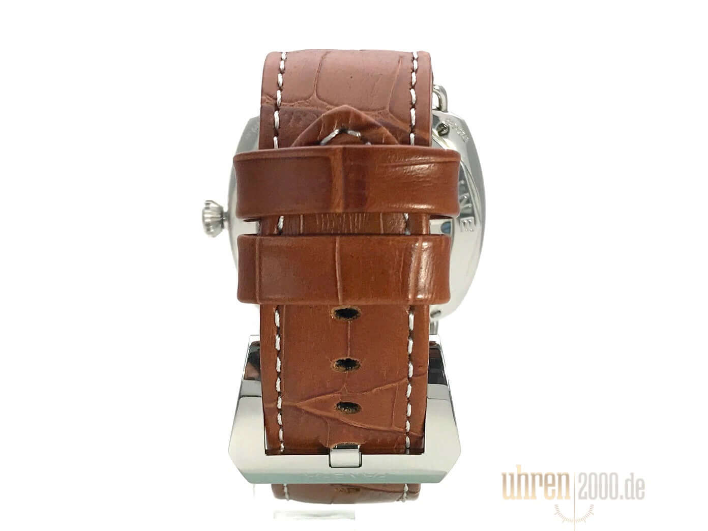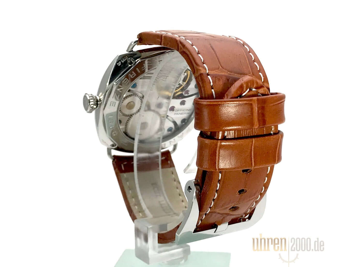Gehäuse aus Edelstahl poliert, Gehäusedurchmesser 45 mm, Lünette aus Edelstahl poliert, braunes Aftermarket Lederarmband mit Dornschließe aus poliertem Edelstahl, schwarzes Zifferblatt mit fluoreszierenden arabischen Ziffern und Indexen, Sekundenanzeige auf der 9-Uhr-Position, Mechanisches Uhrwerk mit Handaufzug, Kaliber Panerai OP XI, 17 Steine, Schwingung 21.600 A/h., Gangreserve 56 Stunden, entspiegeltes Saphirglas aus Korund 1,9 mm stark, Stunden, Minuten, kleine Sekundenanzeige, Gehäuseboden aus Edelstahl mit transparentem Saphirglas, Wasserdicht bis zu 10 bar.