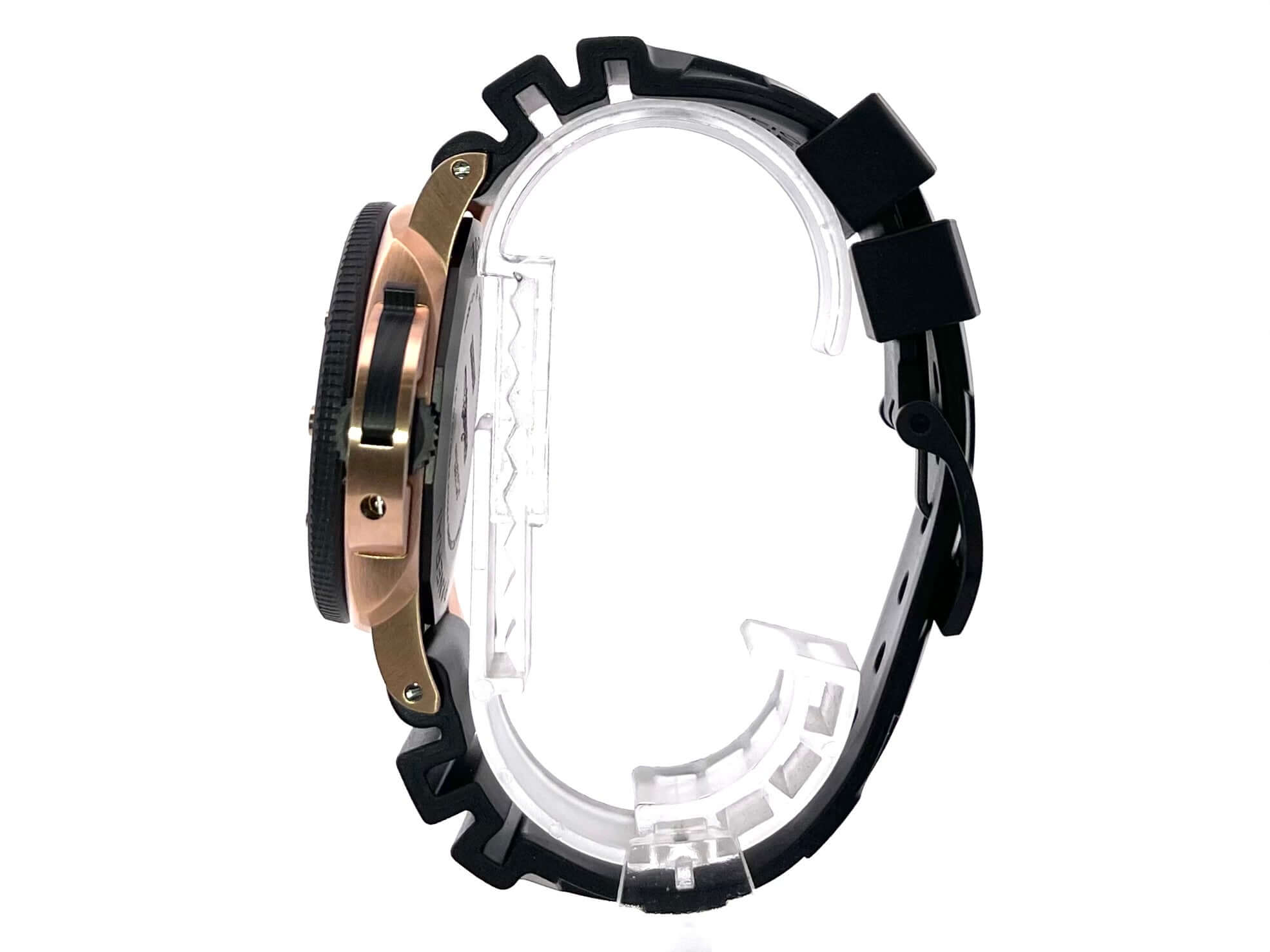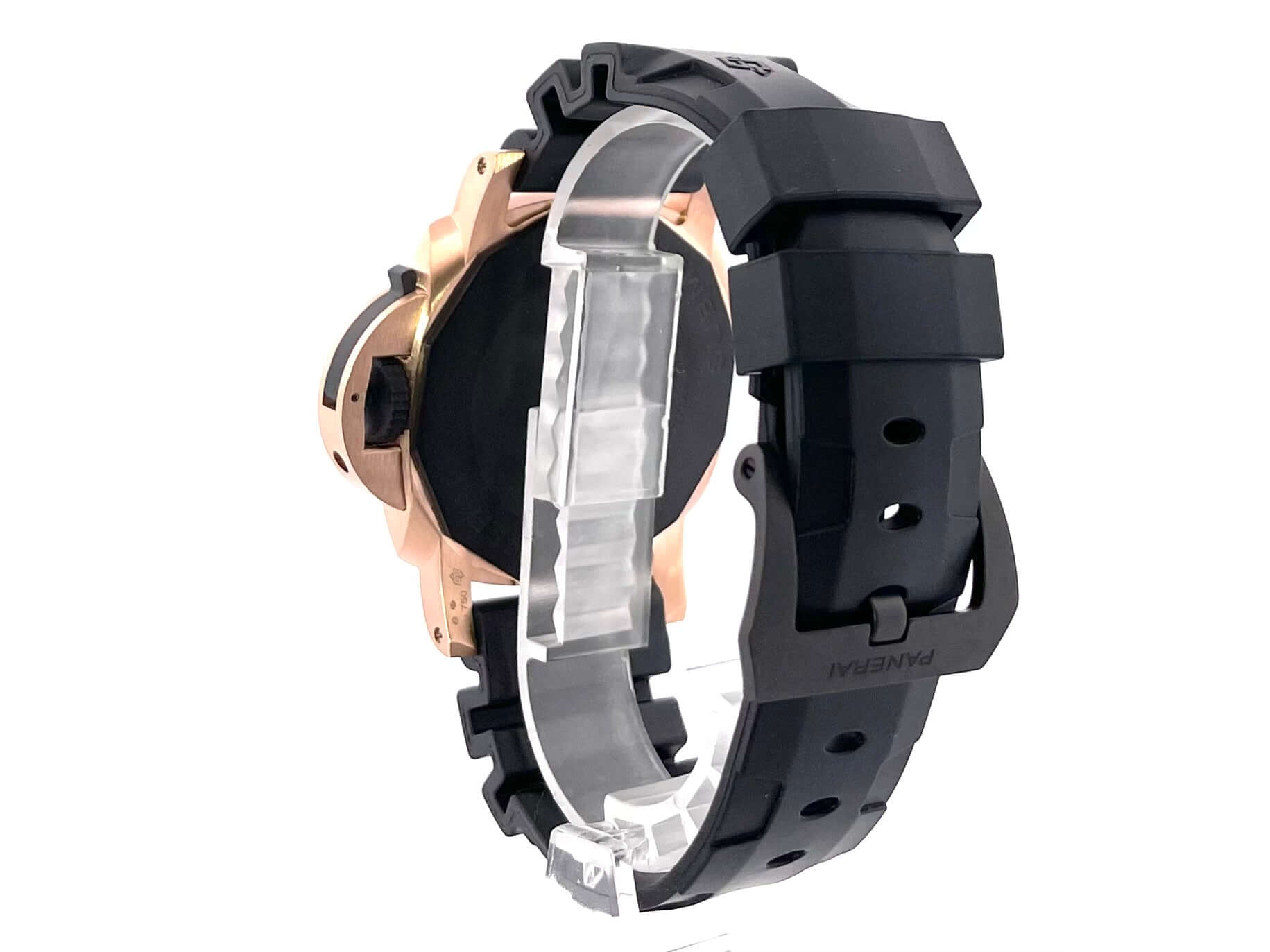 Gehäuse aus poliertem 18 kt Goldtech, Gehäusedurchmesser 44 mm, Lünette aus Carbon, einseitig drehbar, schwarzes Kautschukband mit Dornschließe, schwarzes Zifferblatt mit aufgesetzten fluoreszierenden Indizes, Datumsanzeige auf 3 Uhr, Sekundenanzeige auf 9 Uhr, Automatikwerk, Kaliber Panerai P.900, Schwingung 28.800 A/h., Gangreserve 72 Stunden, Datumsanzeige, kleine Sekunde, Saphirglas aus Korund, Gehäuseboden verschraubt aus Titan, Kronenschutzbrücke, Wasserdicht bis zu 30 bar.