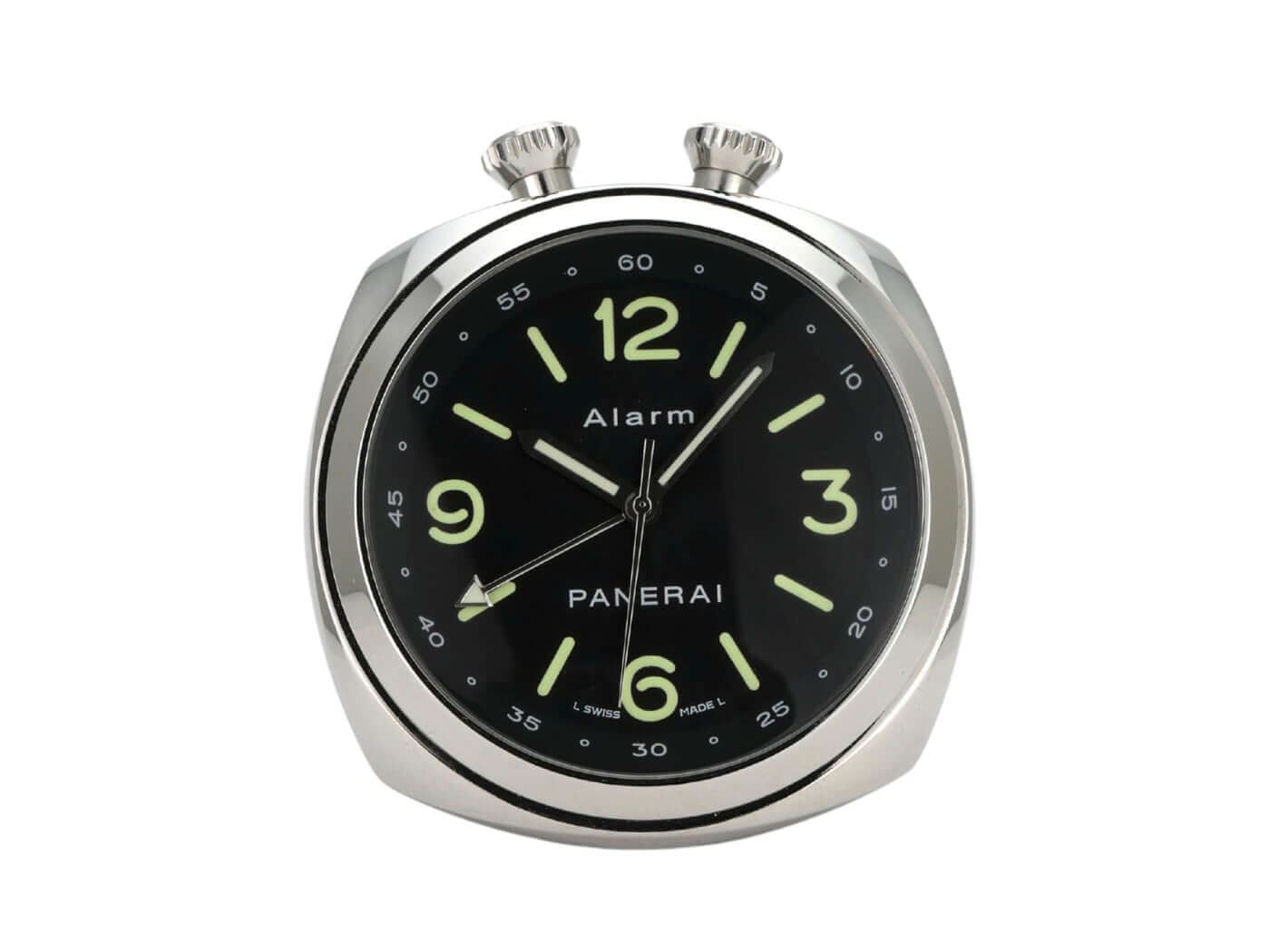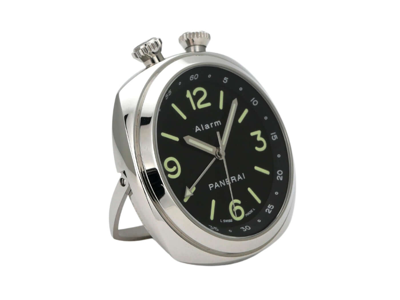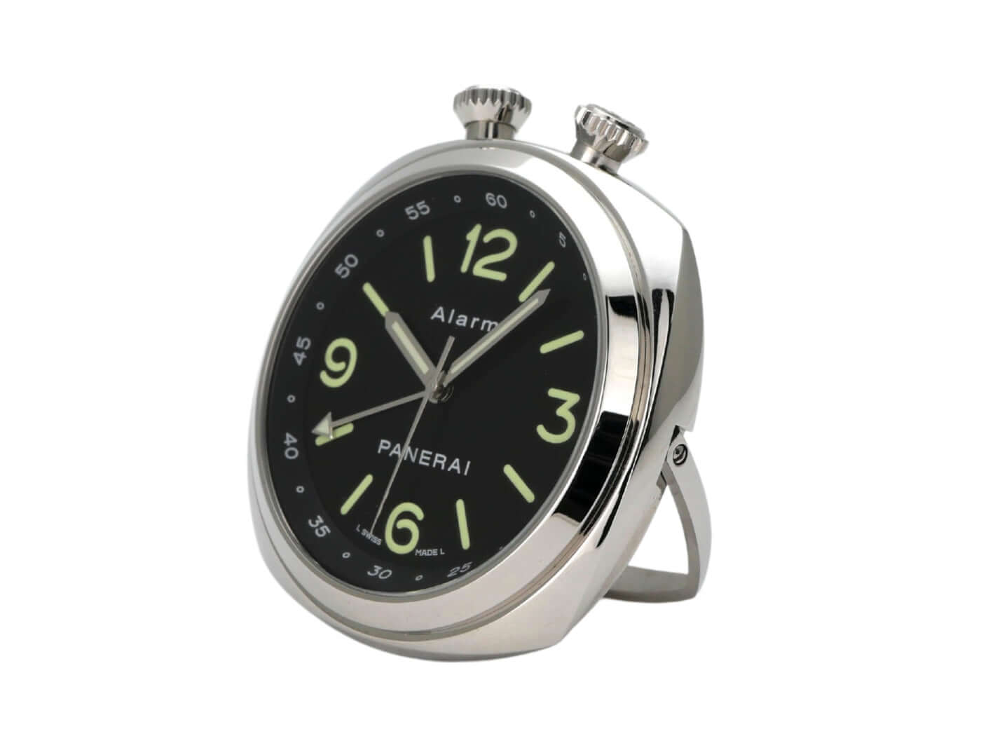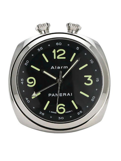 Gehäuse aus Edelstahl poliert, Gehäusedurchmesser 52 mm, schwarzes Zifferblatt mit arabischen Leuchtziffern und Stundenmarkierungen, Quarz, Kaliber OP XVII, Alarm, Tischuhr.