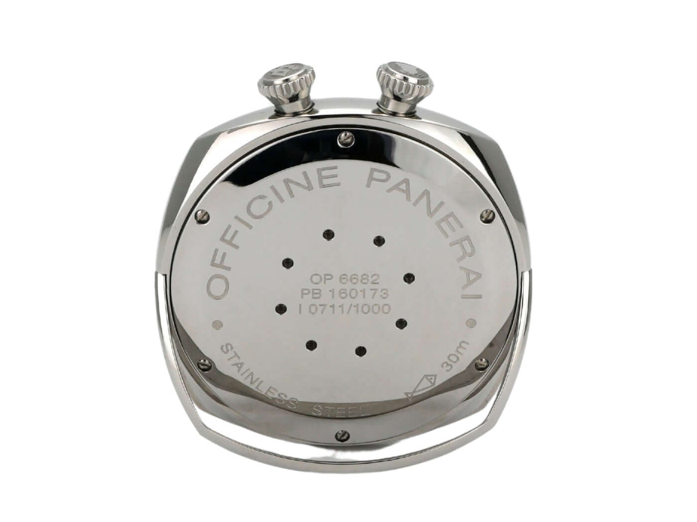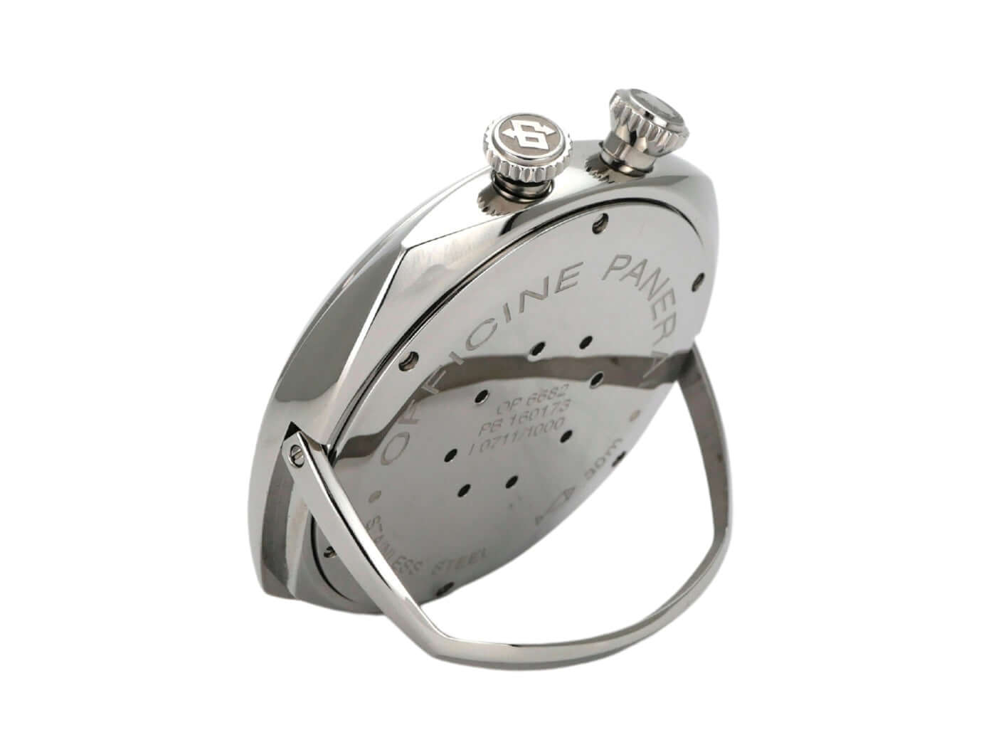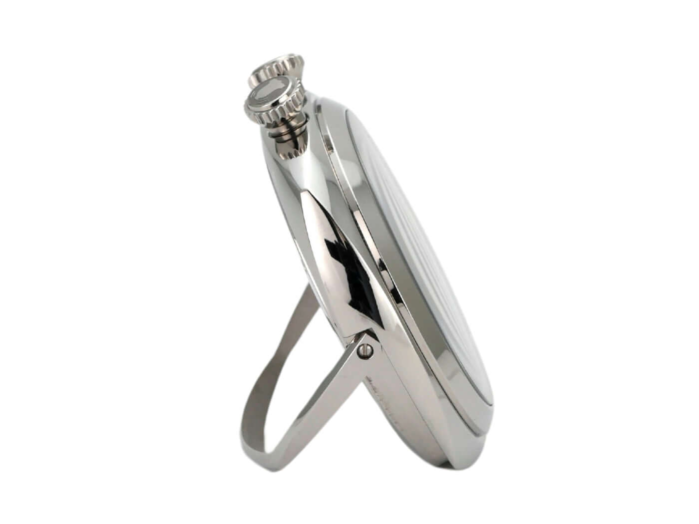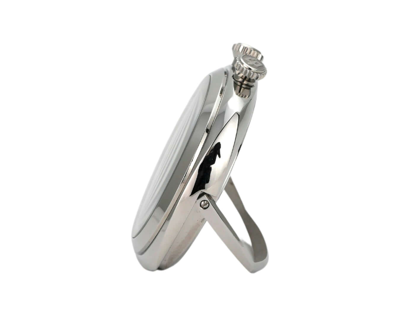Gehäuse aus Edelstahl poliert, Gehäusedurchmesser 52 mm, schwarzes Zifferblatt mit arabischen Leuchtziffern und Stundenmarkierungen, Quarz, Kaliber OP XVII, Alarm, Tischuhr.