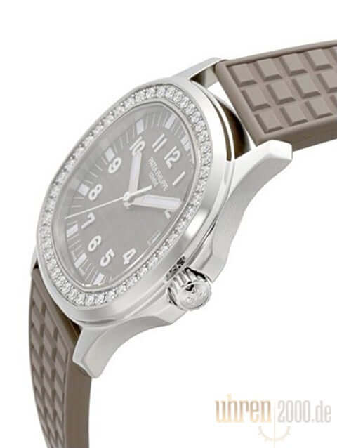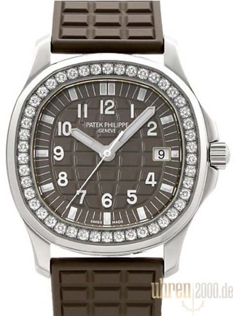 Gehäuse aus Edelstahl poliert und satiniert, Gehäusedurchmesser 35,6 mm, Edelstahl Lünette mit 46 Diamanten, braunes Kautschukband mit Faltschließe, braunes Zifferblatt mit aufgesetzten arabischen Ziffern, Quarzwerk Patek Philippe E23-250 S C mit 8 Steine, Datum, Zentralsekunde, Gehäuseboden aus Edelstahl, Wasserdicht bis zu 12 bar.