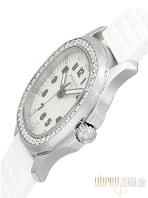 Gehäuse aus Edelstahl poliert und satiniert, Gehäusedurchmesser 35,6 mm, Edelstahl Lünette mit 46 Diamanten, weißes Kautschukband mit Faltschließe, weißes Zifferblatt mit aufgesetzten arabischen Ziffern, Quarzwerk Patek Philippe E23-250 S C mit 8 Steine, Datum, Zentralsekunde, Gehäuseboden aus Edelstahl, Wasserdicht bis zu 12 bar.