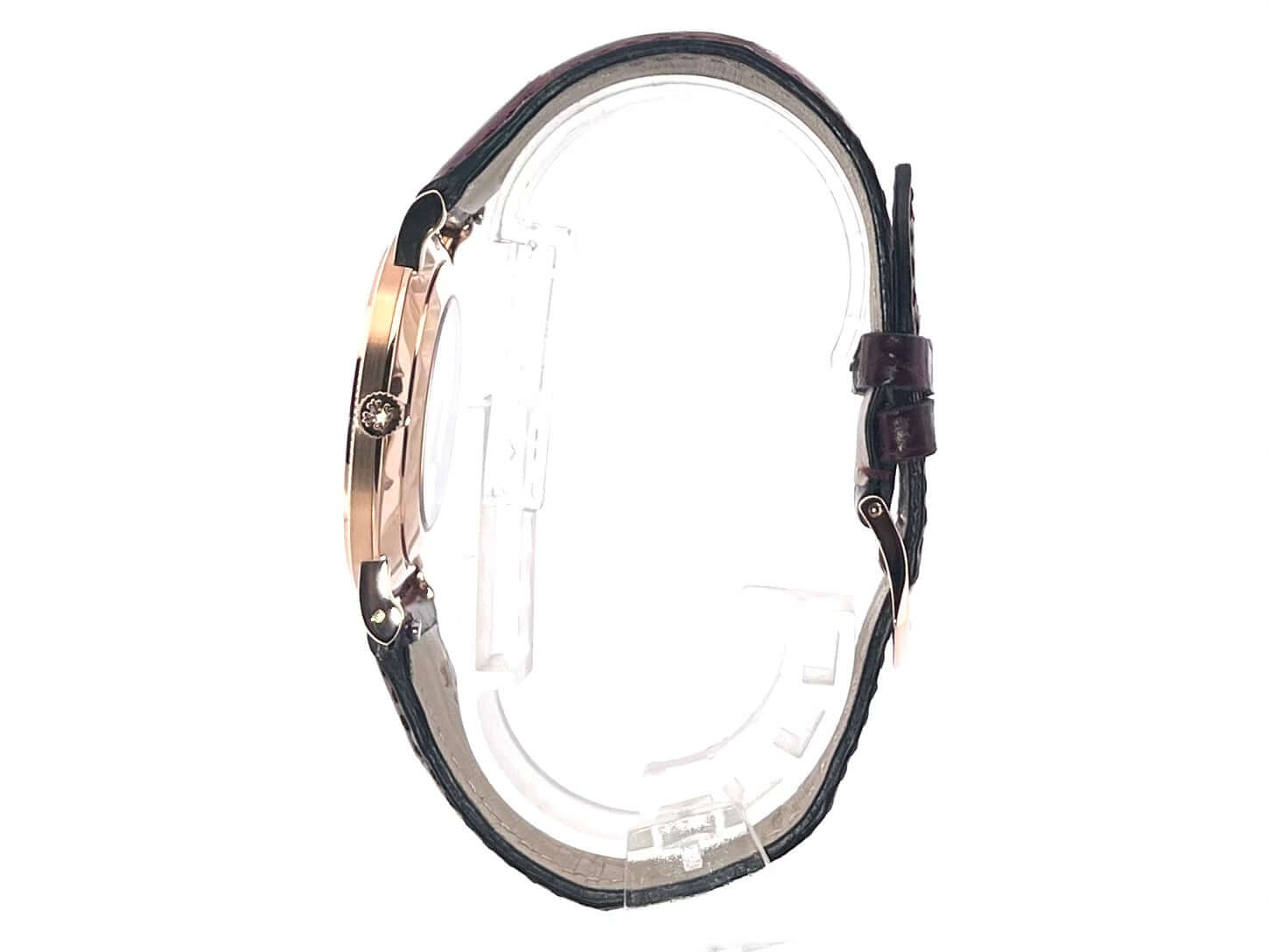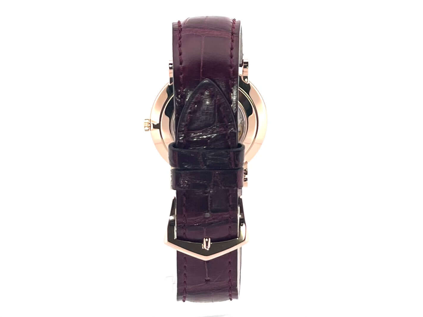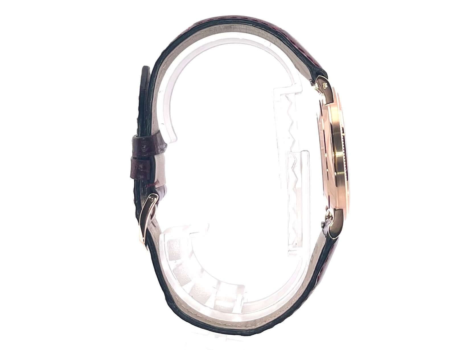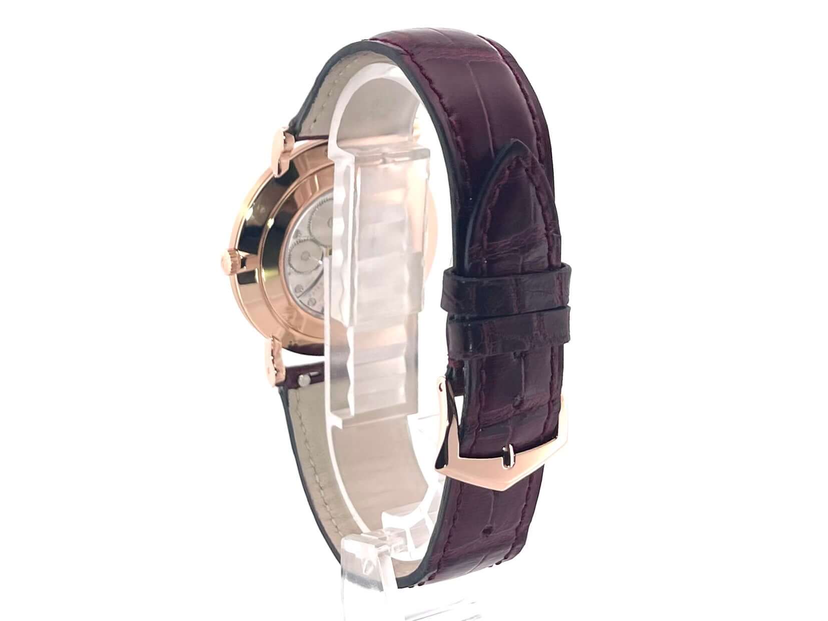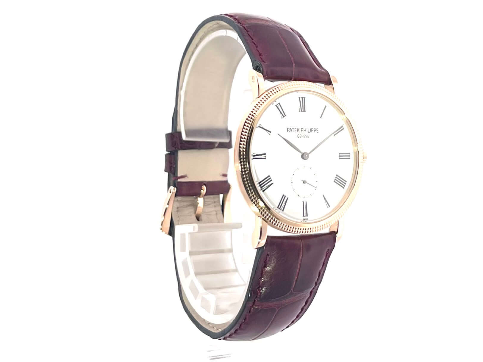 Gehäuse aus 18 kt Roségold, Gehäusedurchmesser 36 mm, Gehäusehöhe 7,43 mm, Lünette aus Roségold poliert, weinrotes Aftermarket Lederband mit Roségold Dornschließe, weißes Zifferblatt, Handaufzug, Patek Philippe Manufakturkaliber 215PS, 44 Stunden Gangreserve, kleine Sekunde, Saphirglas, 18 kt Roségold Boden, Wasserdicht bis zu 3 bar.