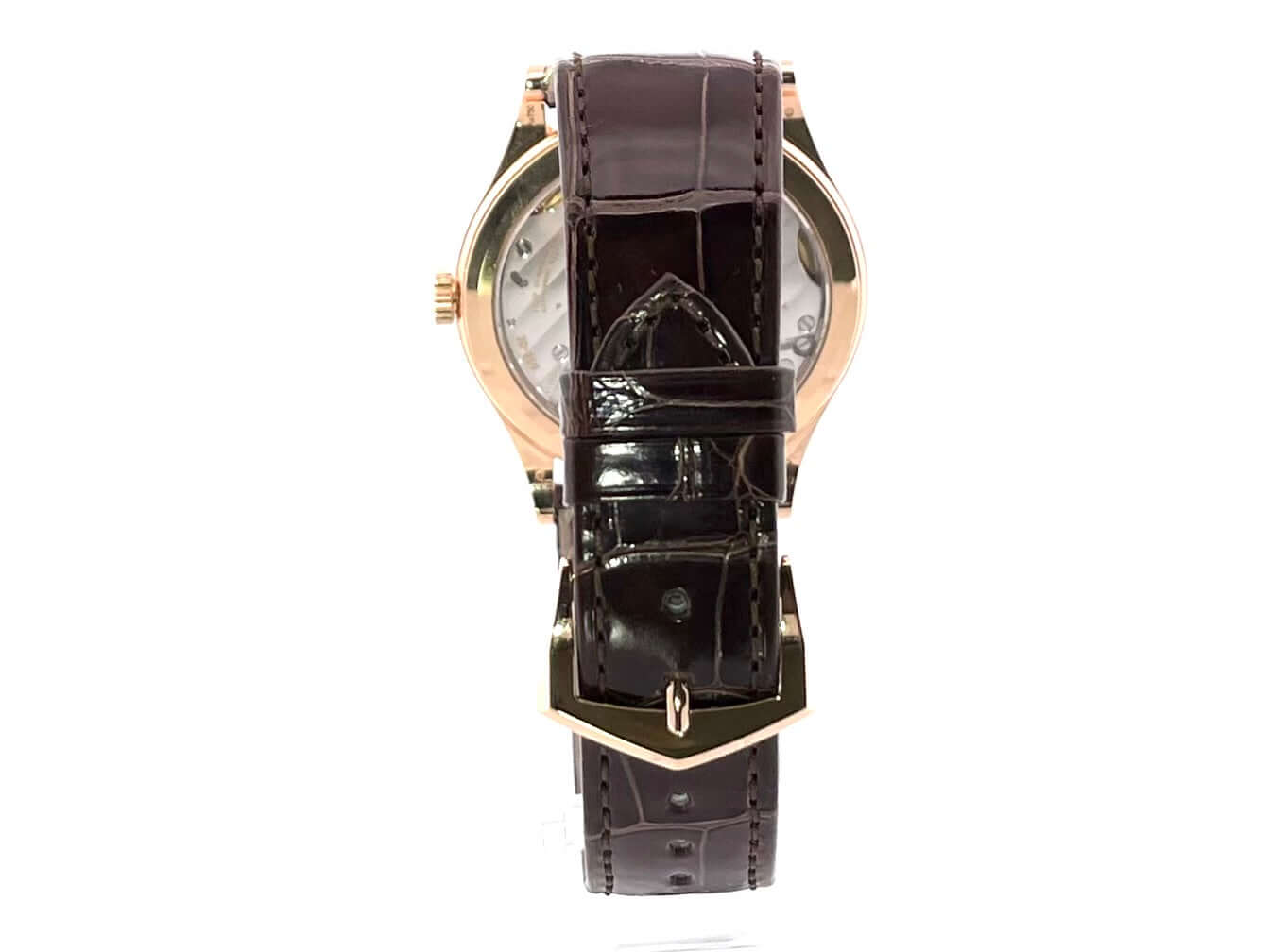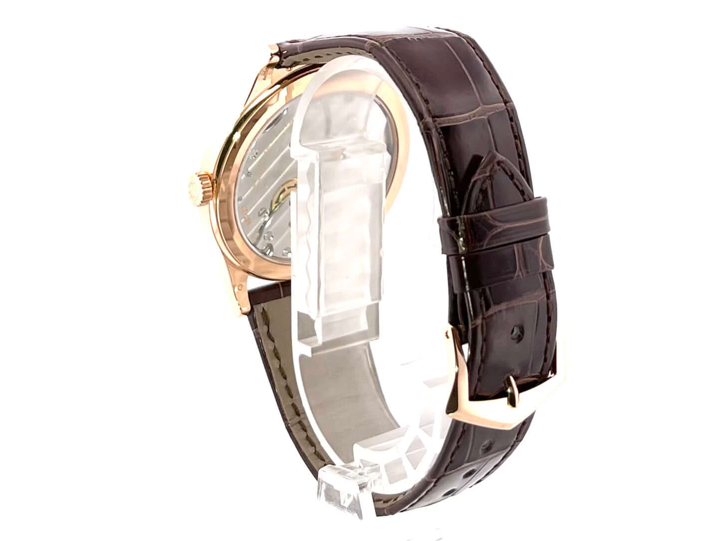 Gehäuse 18 kt Roségold poliert, Gehäusedurchmesser 39 mm, 18 kt Roségold Lünette, braunes Alligatorleder Armband mit 18 kt Roségold Dornschließe, silberfarbenes Zifferblatt, Handaufzug, Manufakturkaliber 30‑255 PS, Schwingung 28.800 A/h, Gangreserve für ca. 65 Stunden, kleine Sekunde, Gehäuseboden 18 kt Roségold mit Saphirglasfenster, wasserdicht bis zu 3 bar.