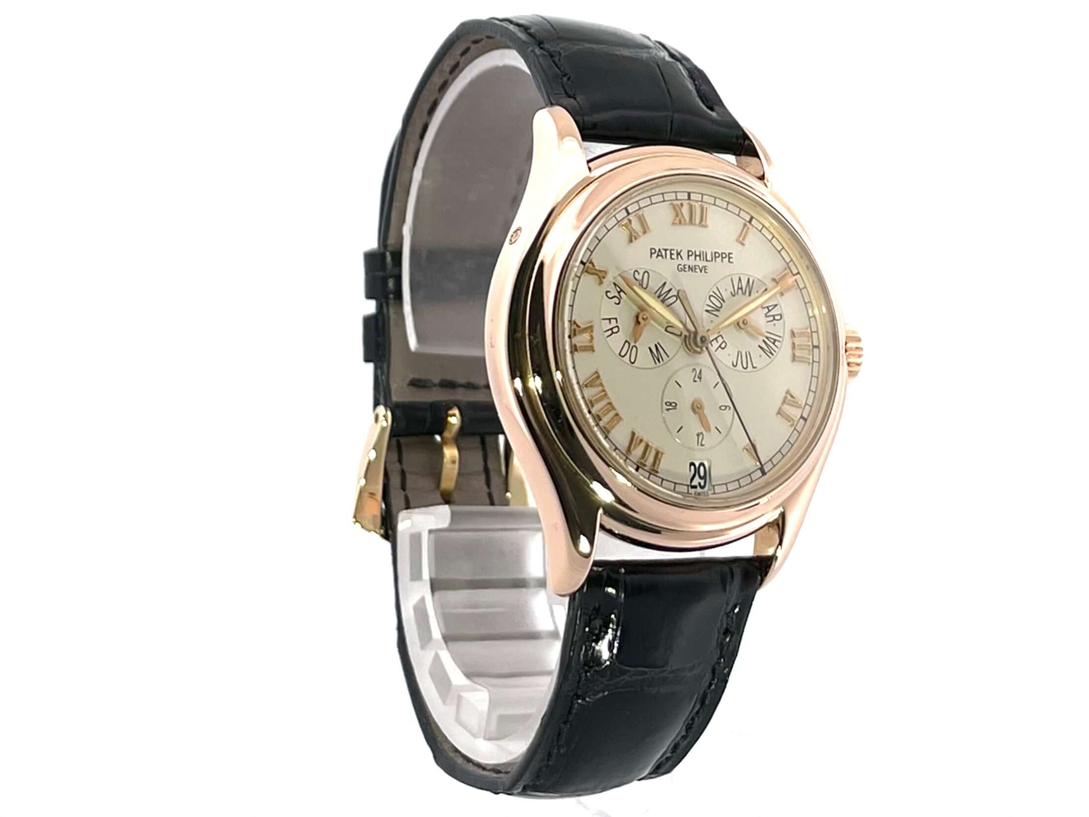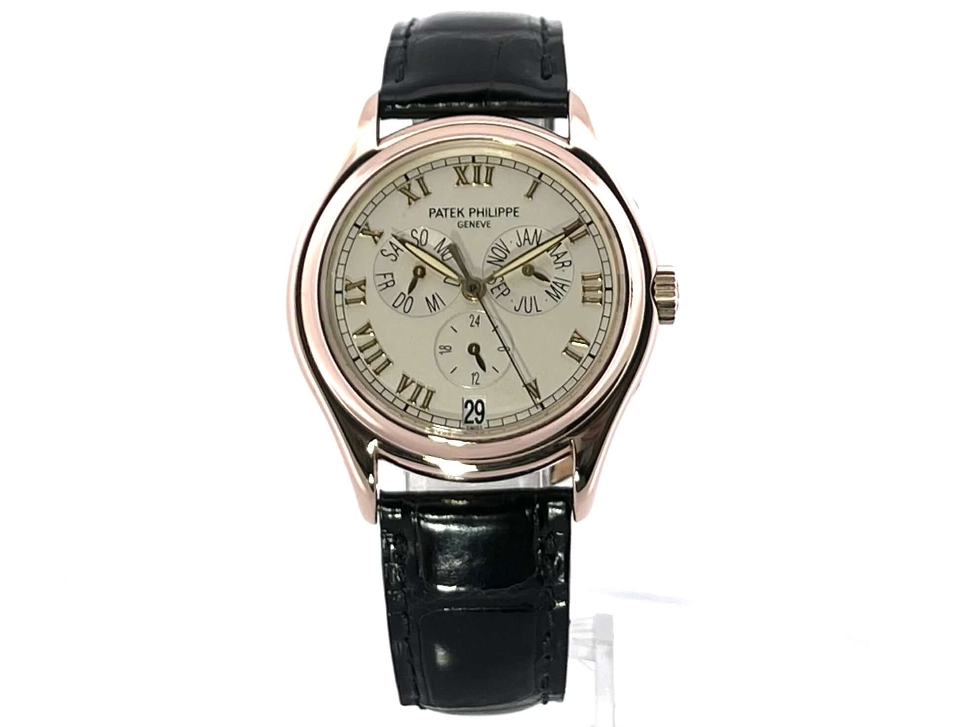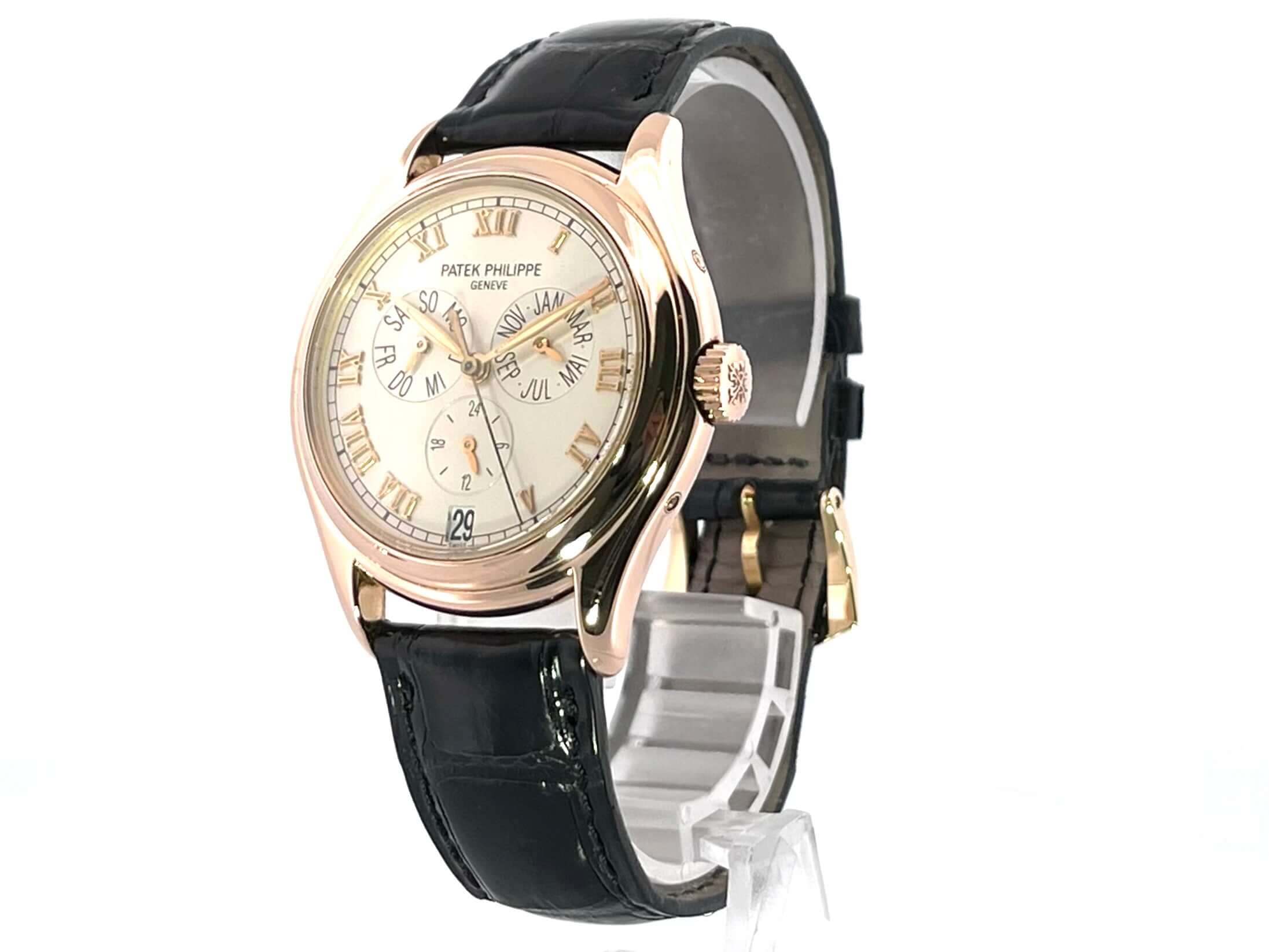 Gehäuse aus 18 kt Roségold poliert und satiniert, Gehäusedurchmesser 37 mm, 18 kt Roségold Lünette poliert, schwarzes Lederband mit Dornschließe, silberfarbenes Zifferblatt, Automatikaufzug, Patek Philippe Manufakturkaliber 315 S QA , Gangreserve für ca. 40 Stunden, Datum, Jahreskalender, Zentralsekunde, Gehäuseboden aus Roségold mit Saphirglasfenster, Wasserdicht bis zu 3 bar.