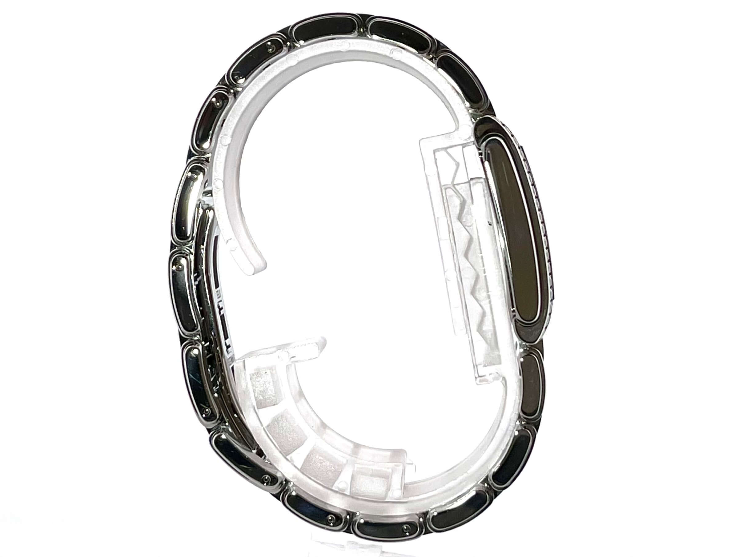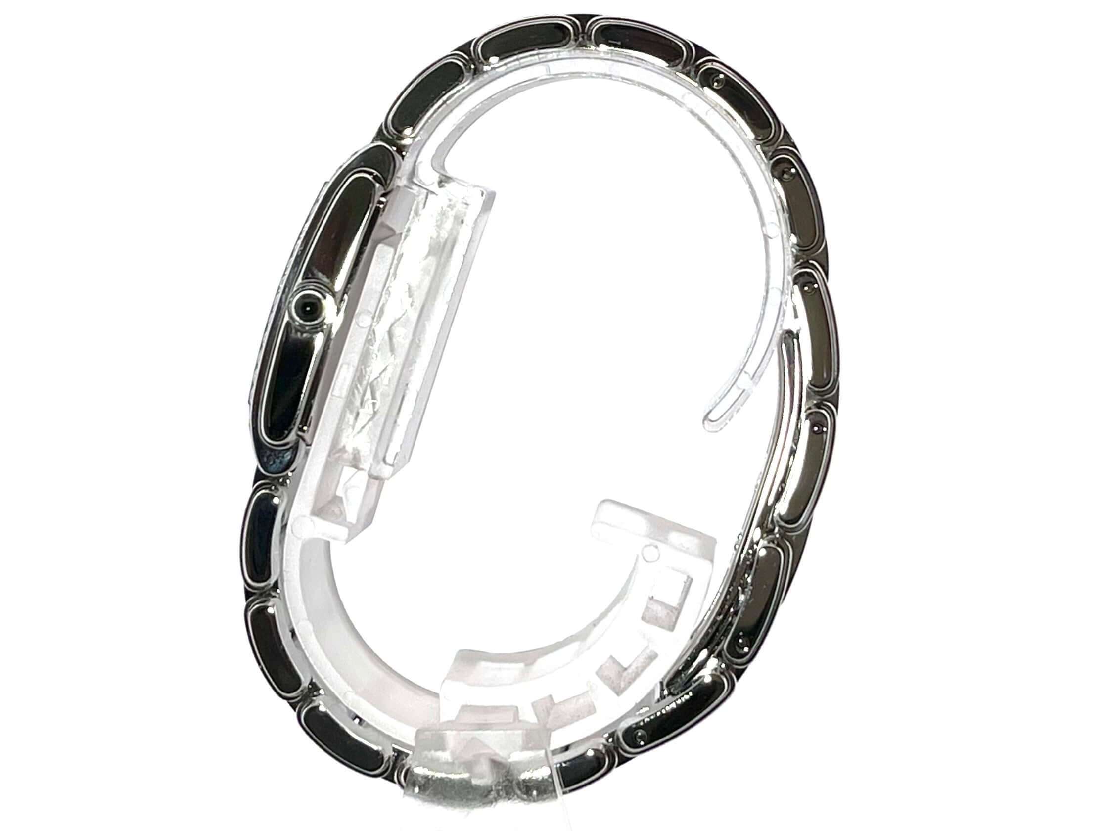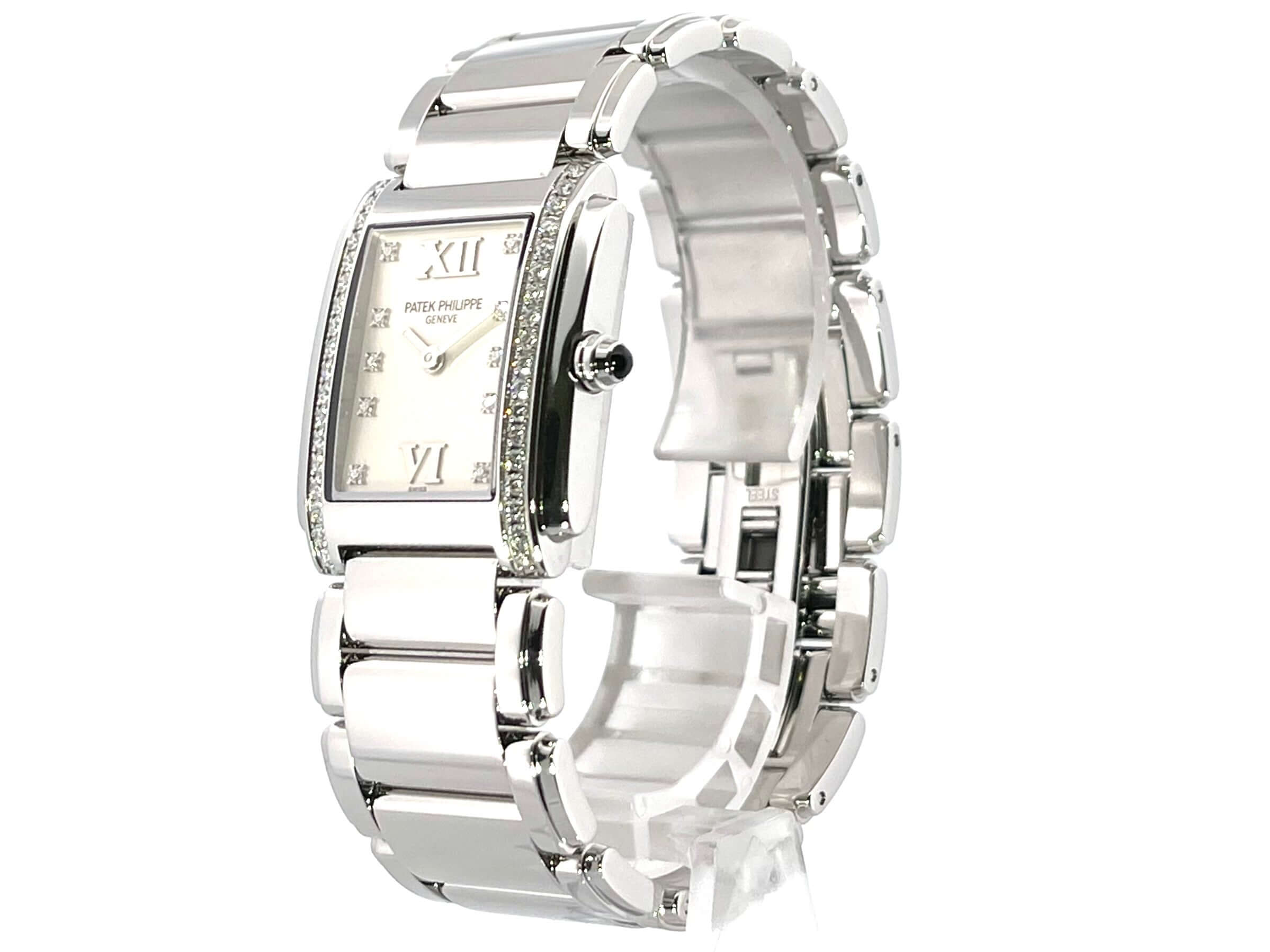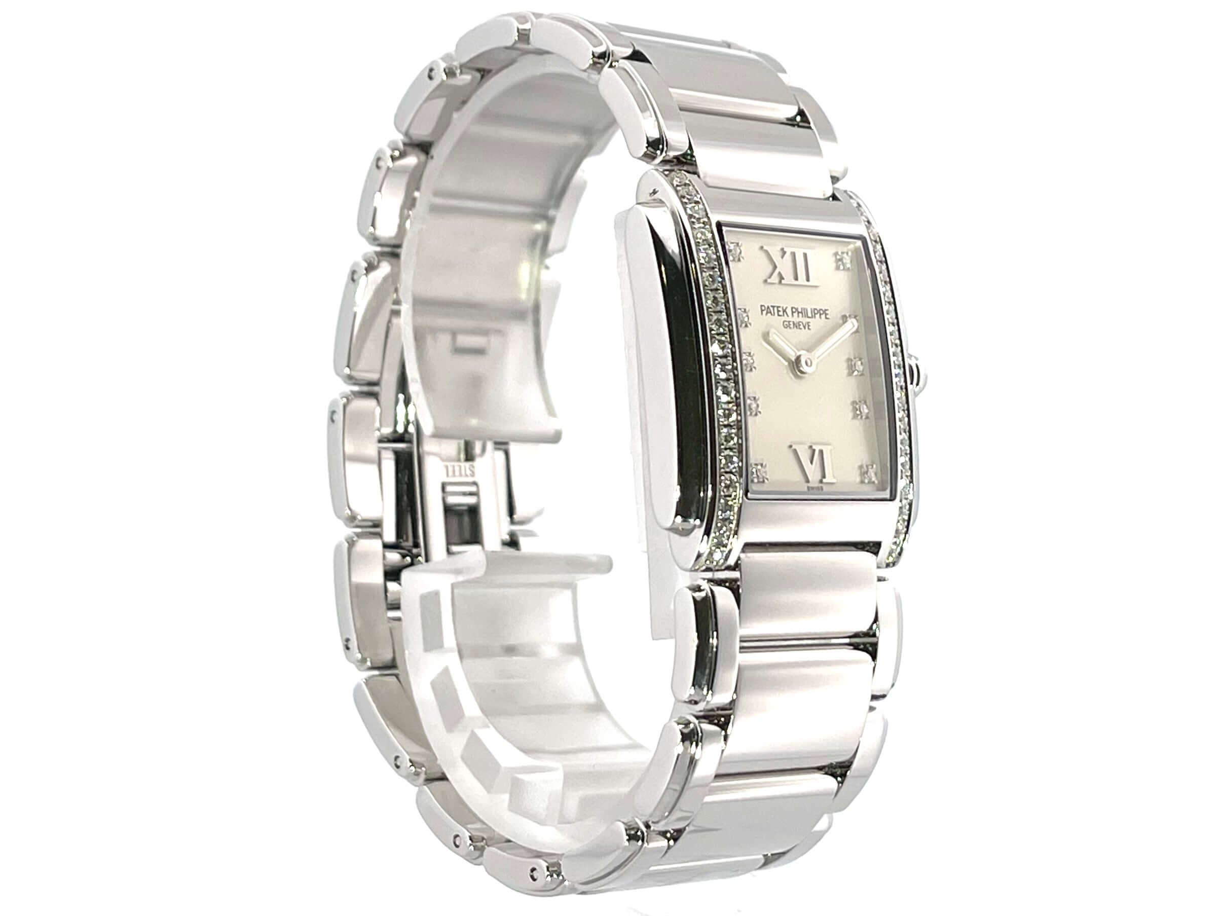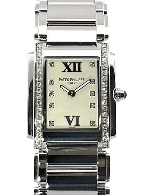 Gehäuse aus Edelstahl mit 34 Diamanten, Gehäusedurchmesser 25 x 30 mm, Gehäusehöhe 6,8 mm, Edelstahlband mit Doppelfaltschließe, weißes Zifferblatt mit Diamant Stundenindexen und aufgesetzten römischen Ziffern, Krone mit Diamant-Solitär, Quarzwerk Patek Philippe E15 mit 6 Steine, Saphirglas, Wasserdicht bis zu 3 bar.