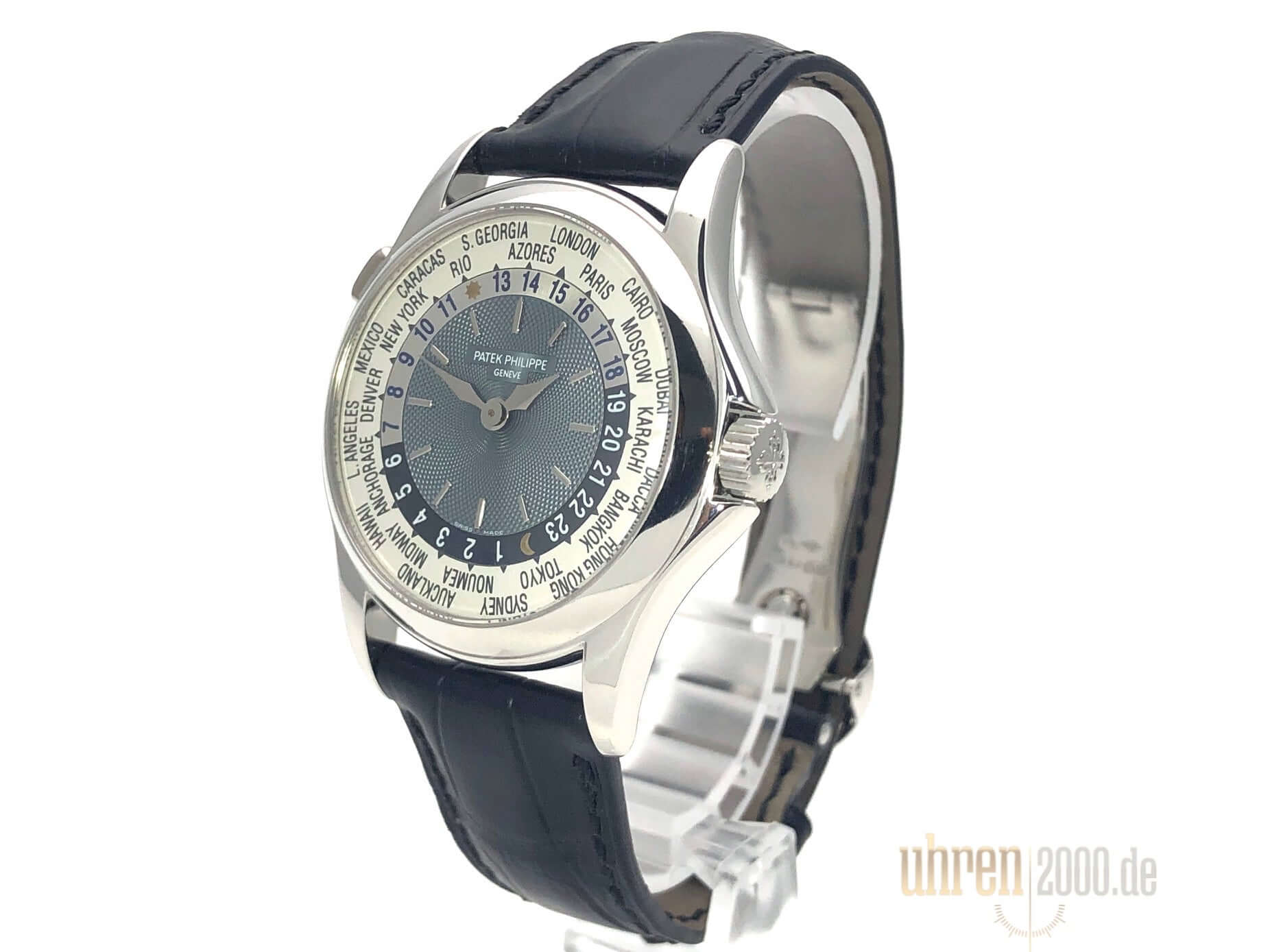Gehäuse aus Platin poliert, Gehäusedurchmesser 37 mm, Platin Lünette poliert, blaues Alligatorlederband mit Platin Faltschließe, blau / silbernes Zifferblatt mit arabischen Ziffern, Automatik, Manufakturkaliber 240 HU mit 33 Steine, Schwingung 21.600 A/h, Gangreserve für ca. 48 Stunden, GMT/Zweite Zeitzone, Gehäuseboden aus Platin mit Saphirglasfenster, Wasserdicht bis zu 3 bar.
