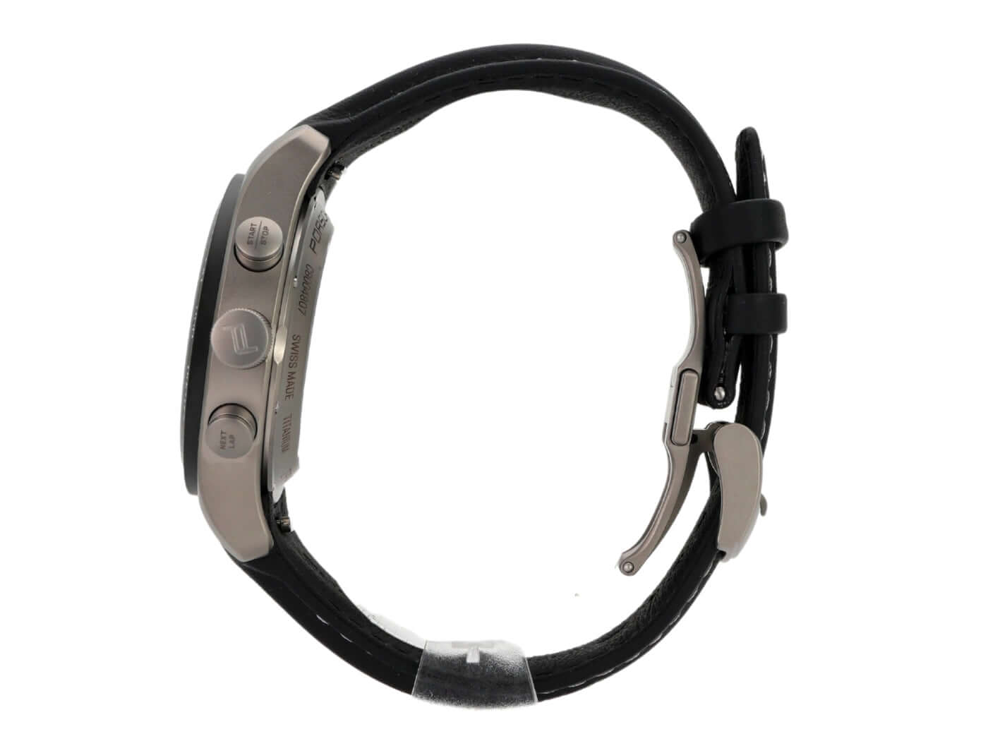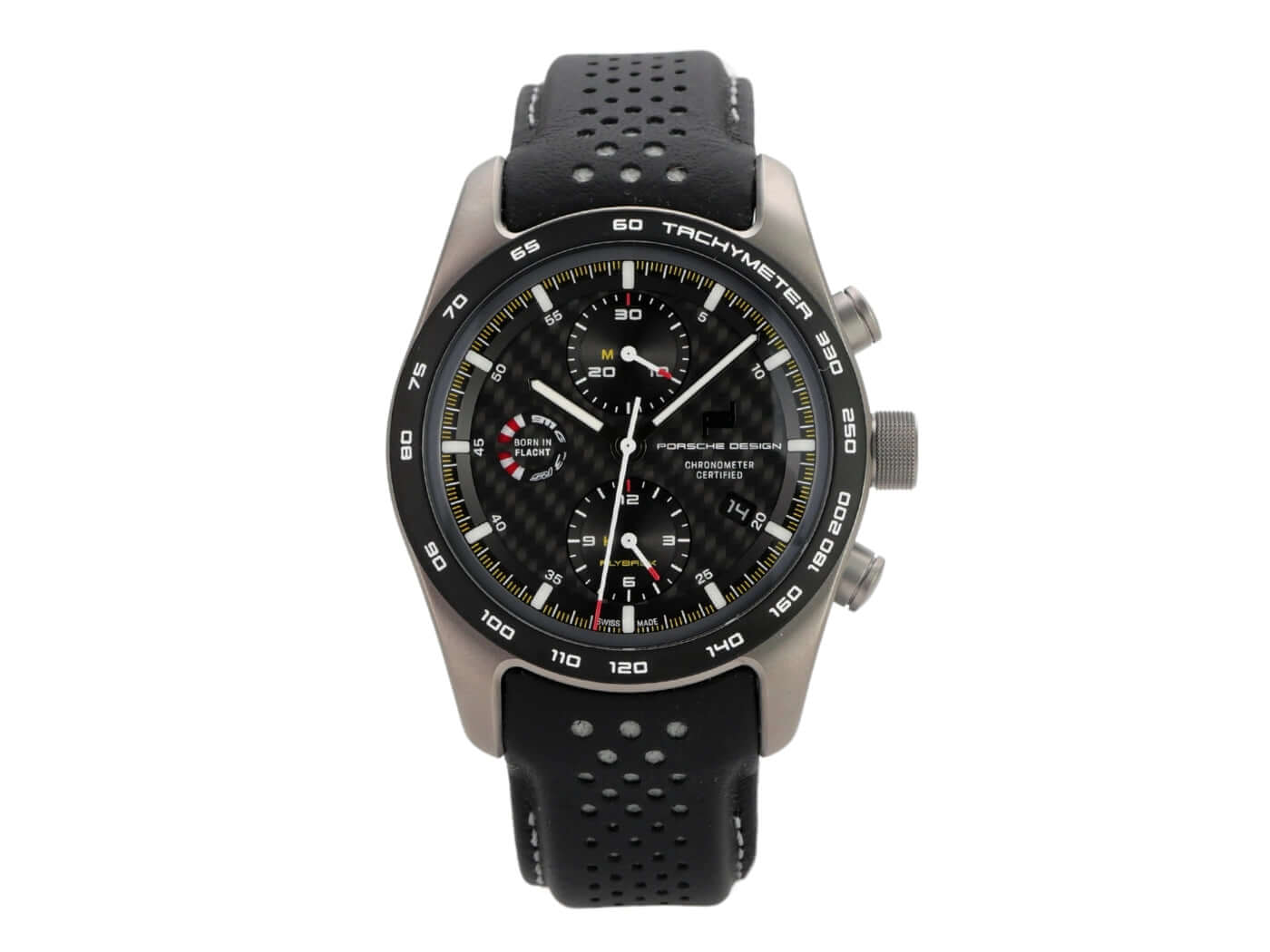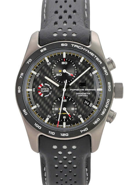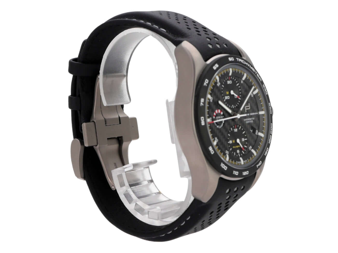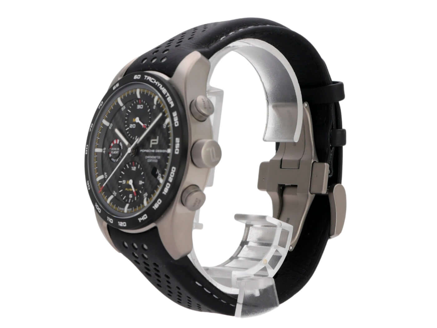 Gehäuse aus Titan poliert und satiniert, Gehäusedurchmesser 42 mm, schwarzes Zifferblatt, schwarzes Lederband mit Doppelfaltschließe, Automatikwerk, Chronograph, Datum, Saphirglas, Saphirglasboden, wasserdicht bis zu 5 bar.