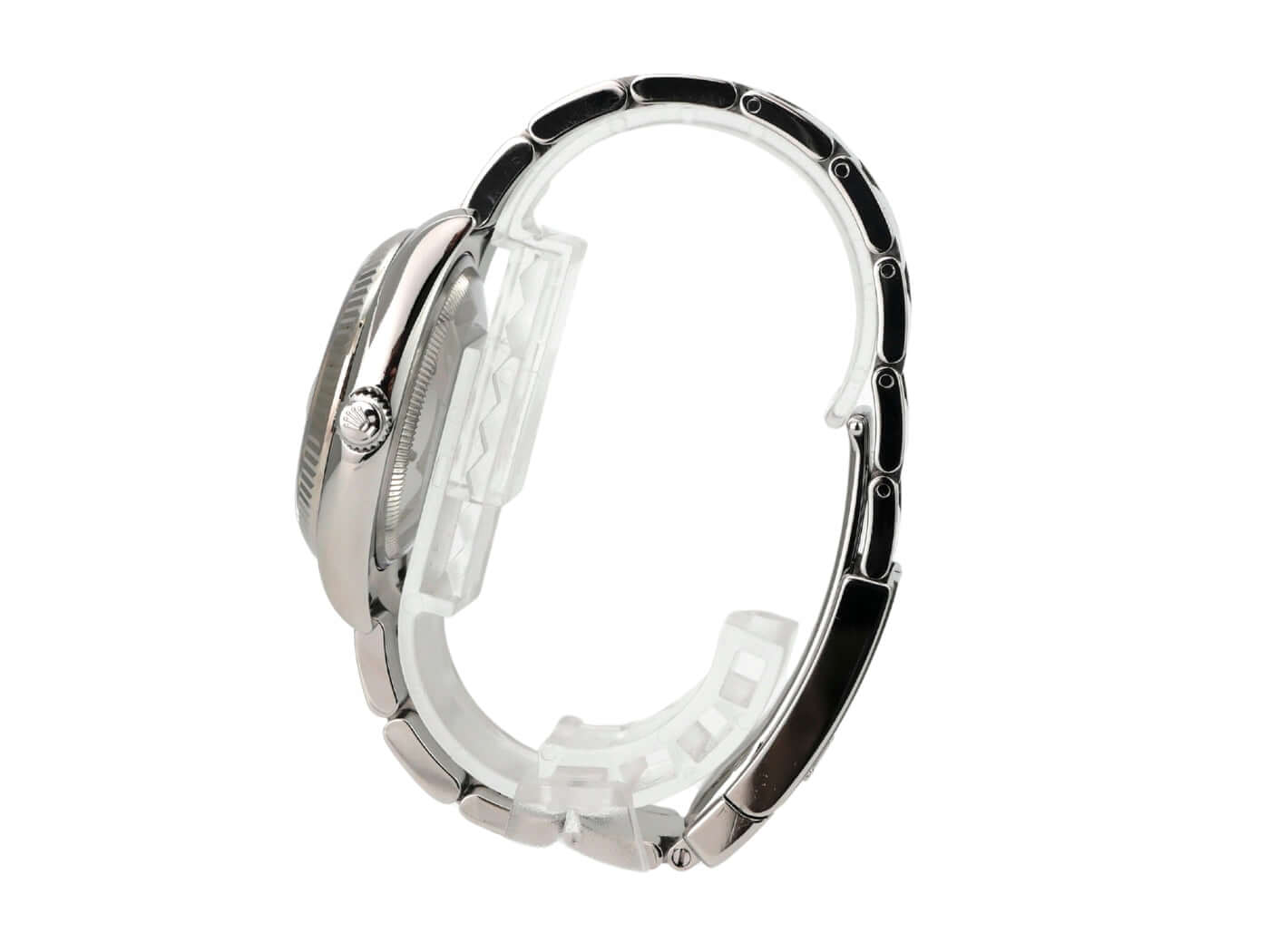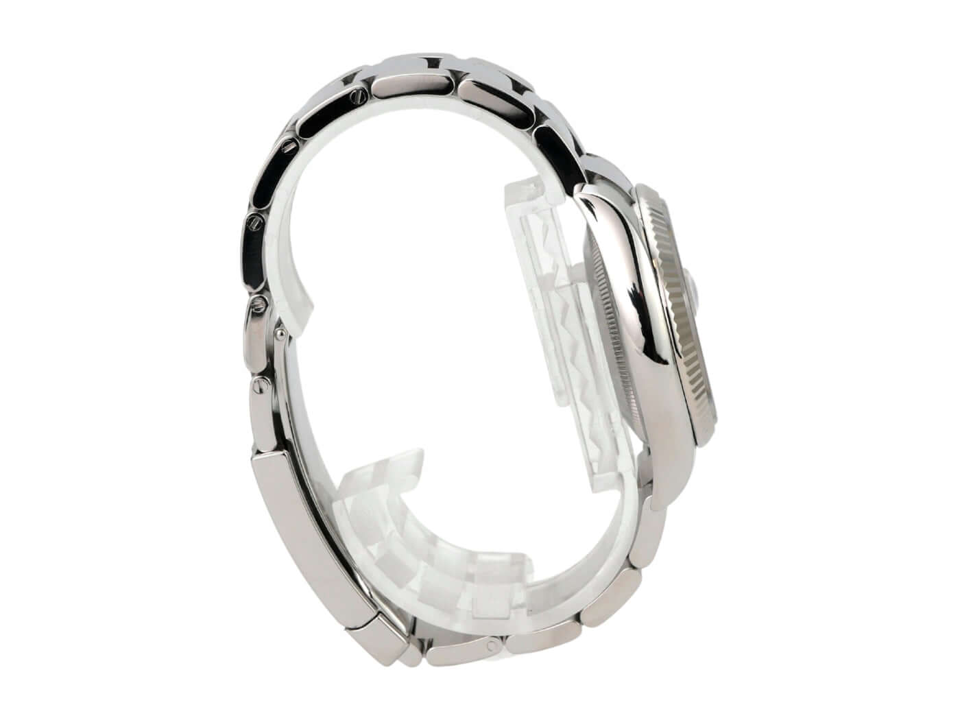 Gehäuse aus Edelstahl poliert und satiniert, Gehäusedurchmesser 34 mm, Gehäusehöhe 11,8 mm, Lünette Weißgold poliert und geriffelt, Oyster Edelstahlarmband poliert und satiniert mit Faltschließe, silbernes Zifferblatt mit 5 aufgesetzten Diamanten und arabischen Ziffern, Automatikwerk, Rolex Manufakturkaliber 3135 mit 31 Steinen, 28.800 A/h, Datumsanzeige mit Lupe, Chronometer, Saphirglas, Krone verschraubt, Edelstahlboden verschraubt, wasserdicht bis zu 10 bar.