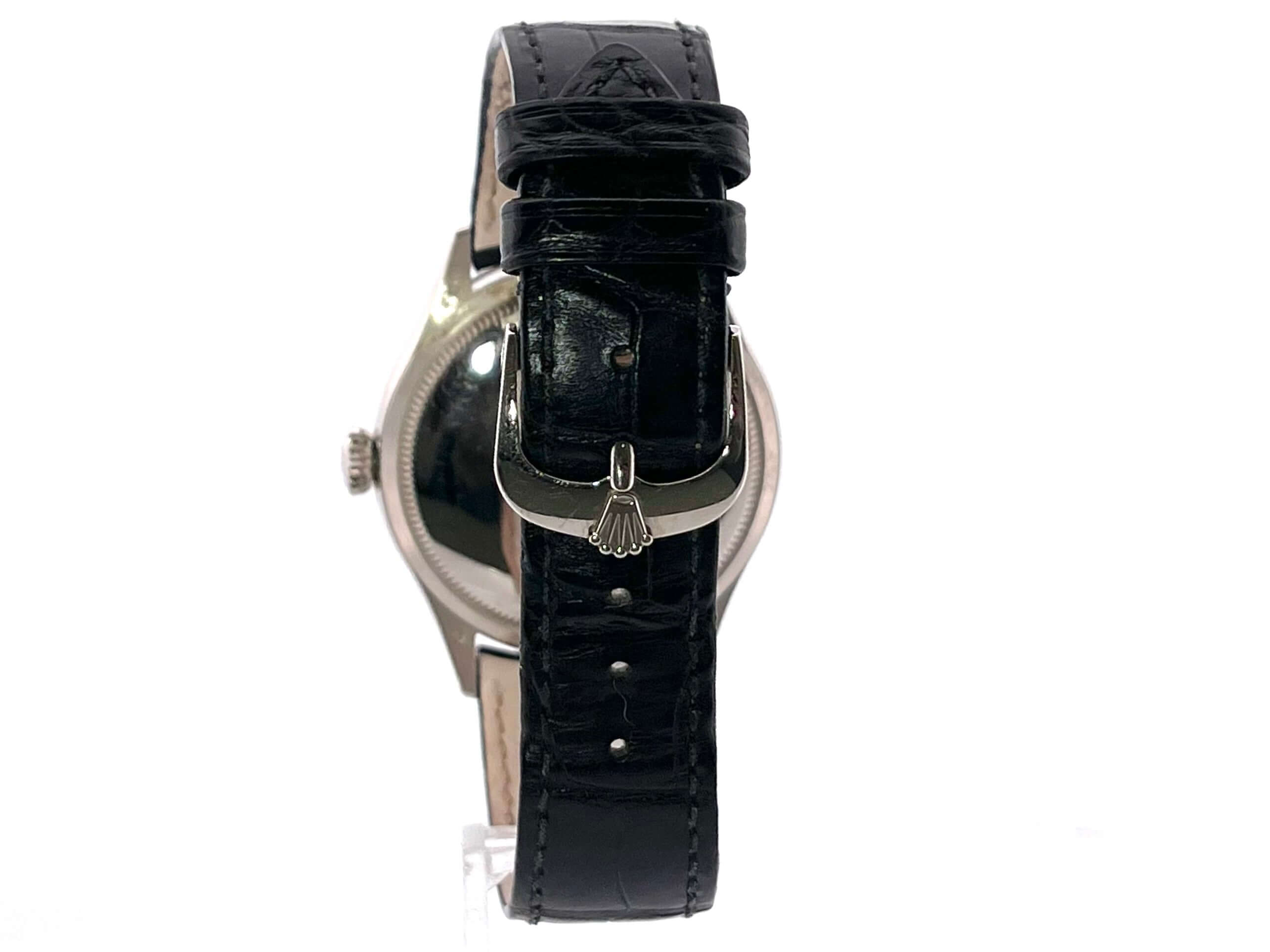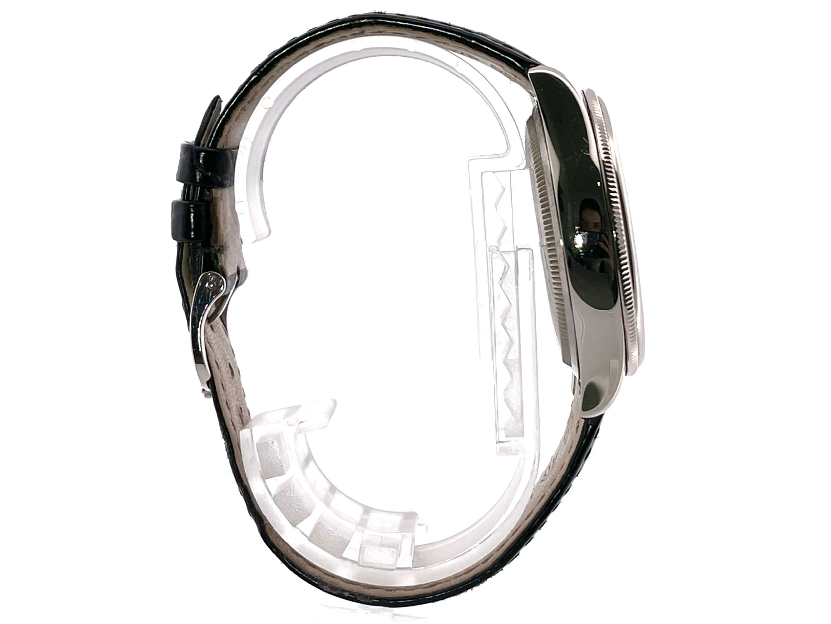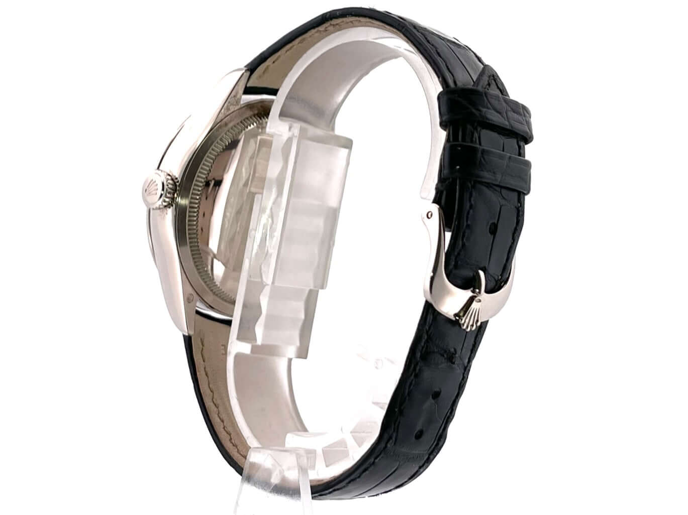 Gehäuse aus 18 kt Weißgold poliert, Gehäusedurchmesser 39 mm, Lünette aus 18 kt Weißgold poliert und geriffelt, schwarzes Krokolederband mit 18 kt Weißgold Dornschließe, silberfarbenes Zifferblatt, Automatikwerk, Chronometer, Rolex Manufakturkaliber, Zeigerdatum bei 3 Uhr, kratzfestes Saphirglas, verschraubter 18 kt Weißgold Boden, Wasserdicht bis zu 5 bar.