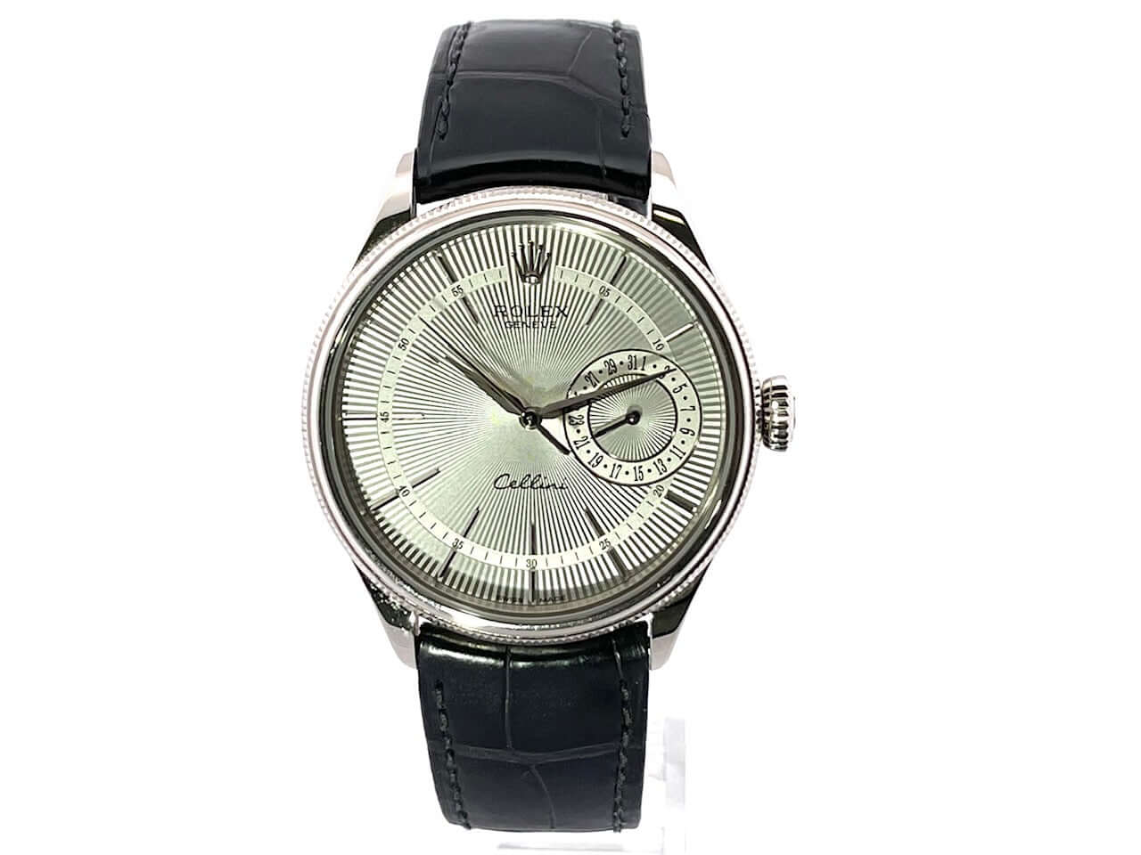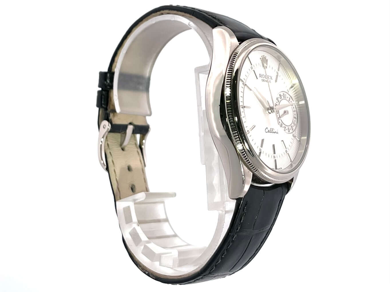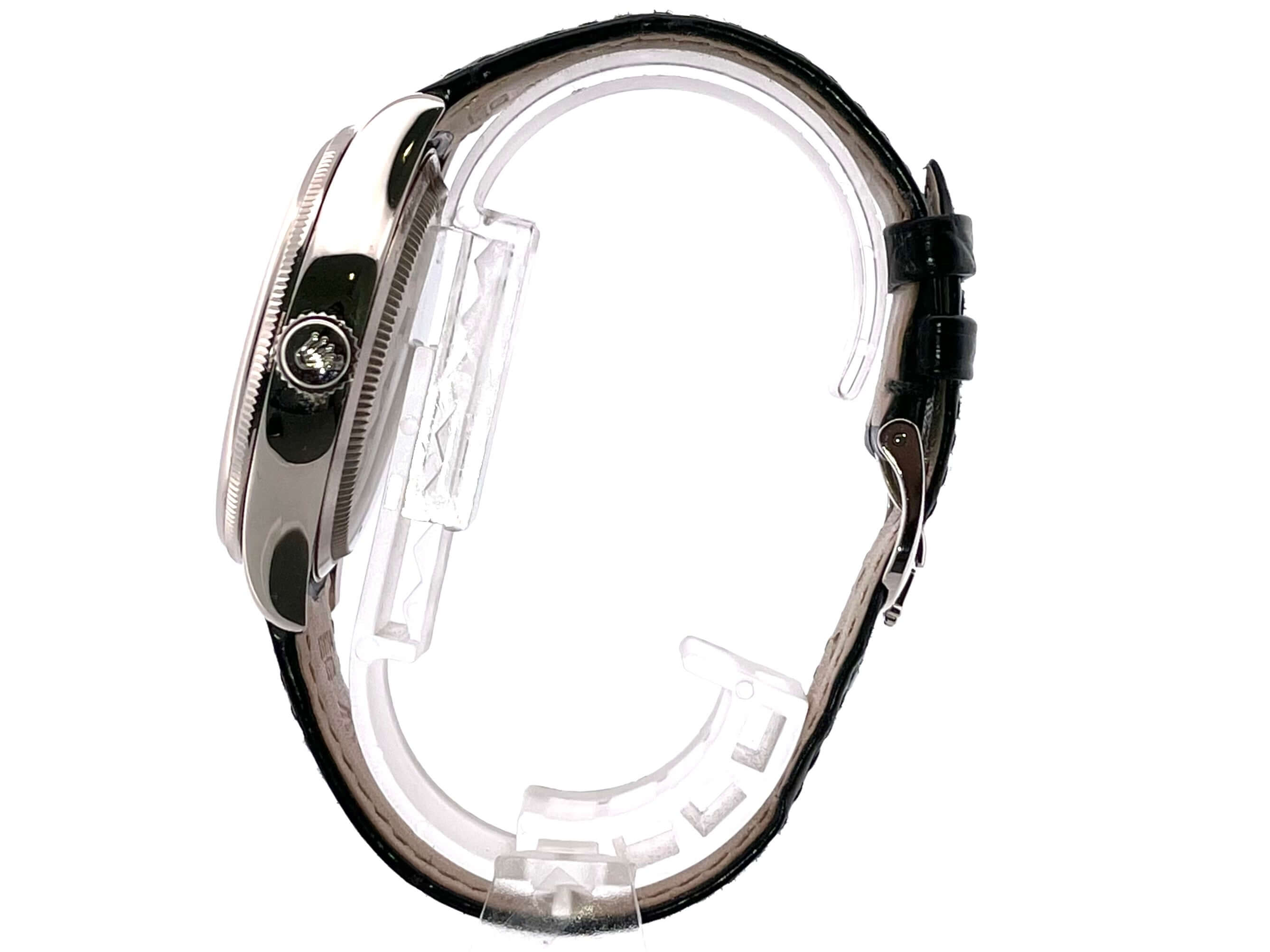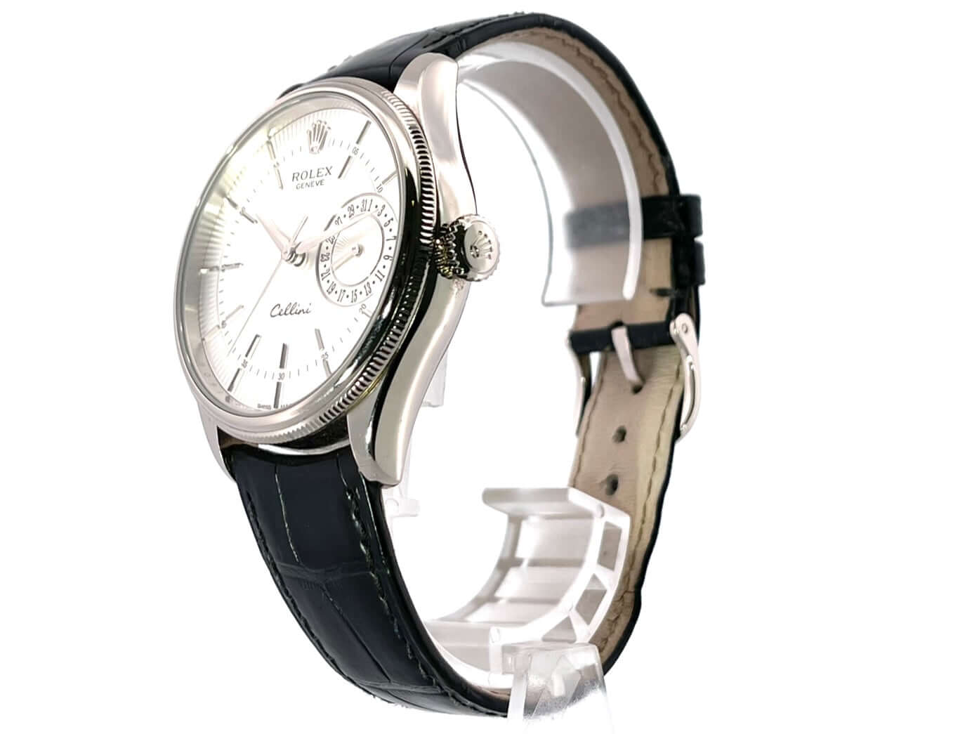 Gehäuse aus 18 kt Weißgold poliert, Gehäusedurchmesser 39 mm, Lünette aus 18 kt Weißgold poliert und geriffelt, schwarzes Krokolederband mit 18 kt Weißgold Dornschließe, silberfarbenes Zifferblatt, Automatikwerk, Chronometer, Rolex Manufakturkaliber, Zeigerdatum bei 3 Uhr, kratzfestes Saphirglas, verschraubter 18 kt Weißgold Boden, Wasserdicht bis zu 5 bar.