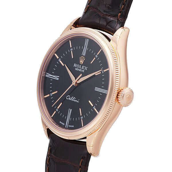 Gehäuse aus 18 kt Roségold poliert, Gehäusedurchmesser 39 mm, Lünette aus 18 kt Roségold poliert und geriffelt, braunes Krokoleder Armband mit 18 kt Roségold Dornschließe, schwarzes Zifferblatt, Automatikwerk, Chronometer, Rolex Manufakturkaliber, kratzfestes Saphirglas, verschraubter 18 kt Roségold Boden, Wasserdicht bis zu 5 bar.