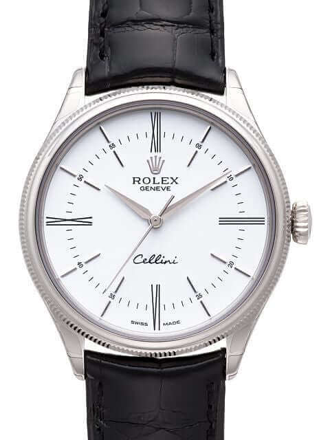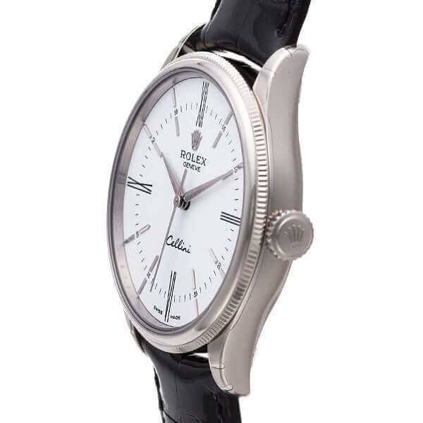 Gehäuse aus 18 kt Weißgold poliert, Gehäusedurchmesser 39 mm, Lünette aus 18 kt Weißgold poliert und geriffelt, schwarzes Krokoleder Armband mit 18 kt Weißgold Dornschließe, weißes Zifferblatt, Automatikwerk, Chronometer, Rolex Manufakturkaliber, kratzfestes Saphirglas, verschraubter 18 kt Weißgold Boden, Wasserdicht bis zu 5 bar.