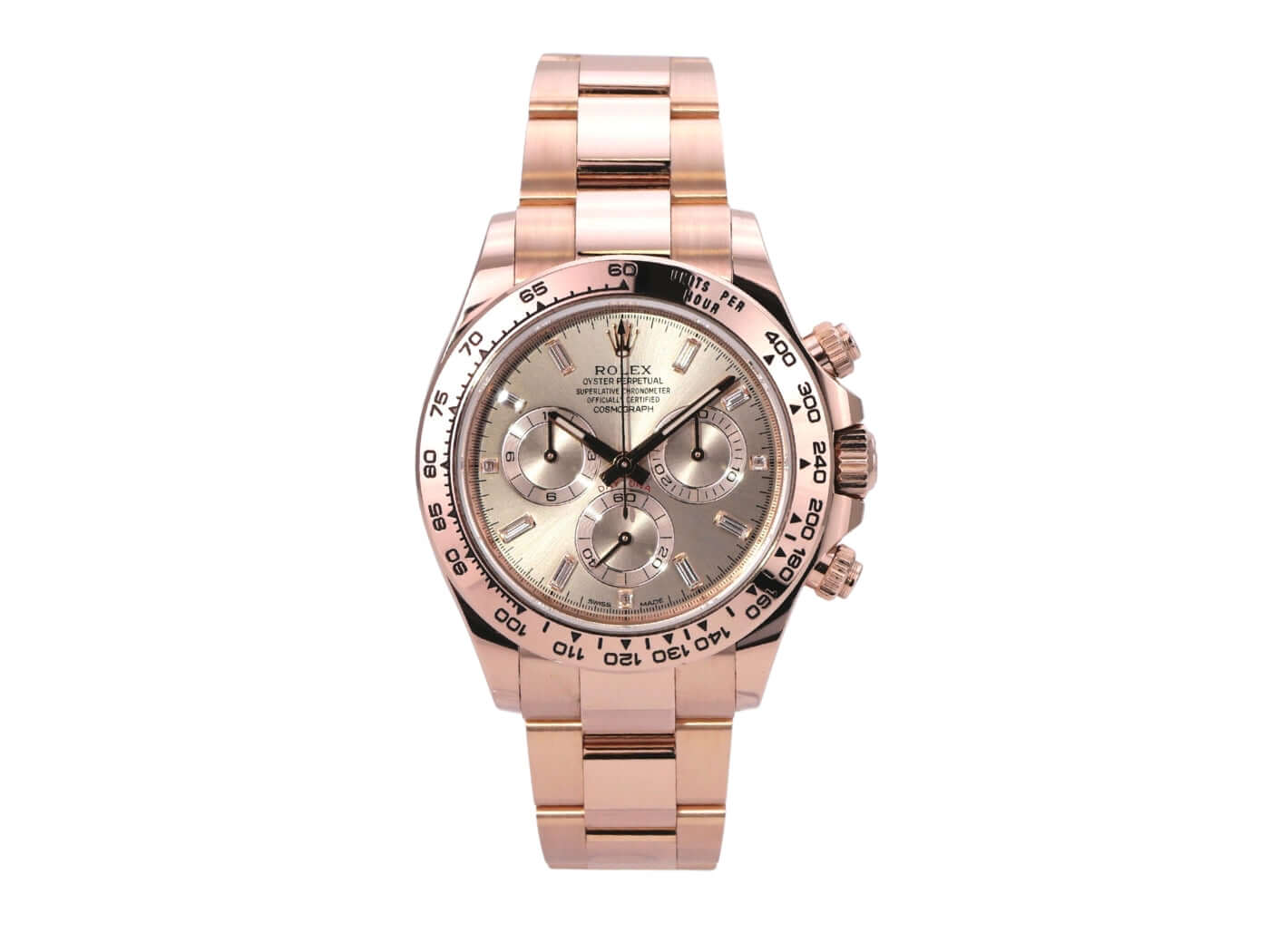 Gehäuse 18 kt Rosegold Everose poliert und satiniert, Gehäusedurchmesser 40 mm, Lünette 18 kt Rosegold Everose poliert und gravierter Tachymeterskala, Oyster Armband 18 kt Rosegold Everose poliert und satiniert mit Faltschließe, Zifferblatt pink mit 11 Diamanten Baguette, rosegoldene Leuchtzeiger, Automatikwerk, Chronometer, Rolex Manufakturkaliber 4130 mit 44 Steine, Schwingung 28.800 A/h, Anzeige von Stunden und Minuten aus der Mitte, kratzfestes Saphirglas, verschraubter Boden aus 18 kt Rosegold Everose, wasserdicht bis zu 10 bar.