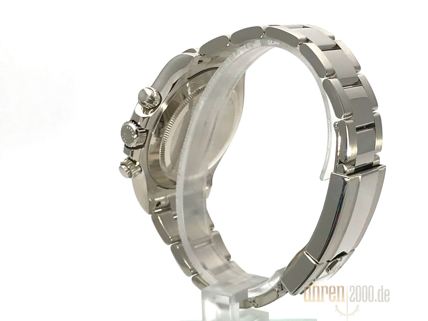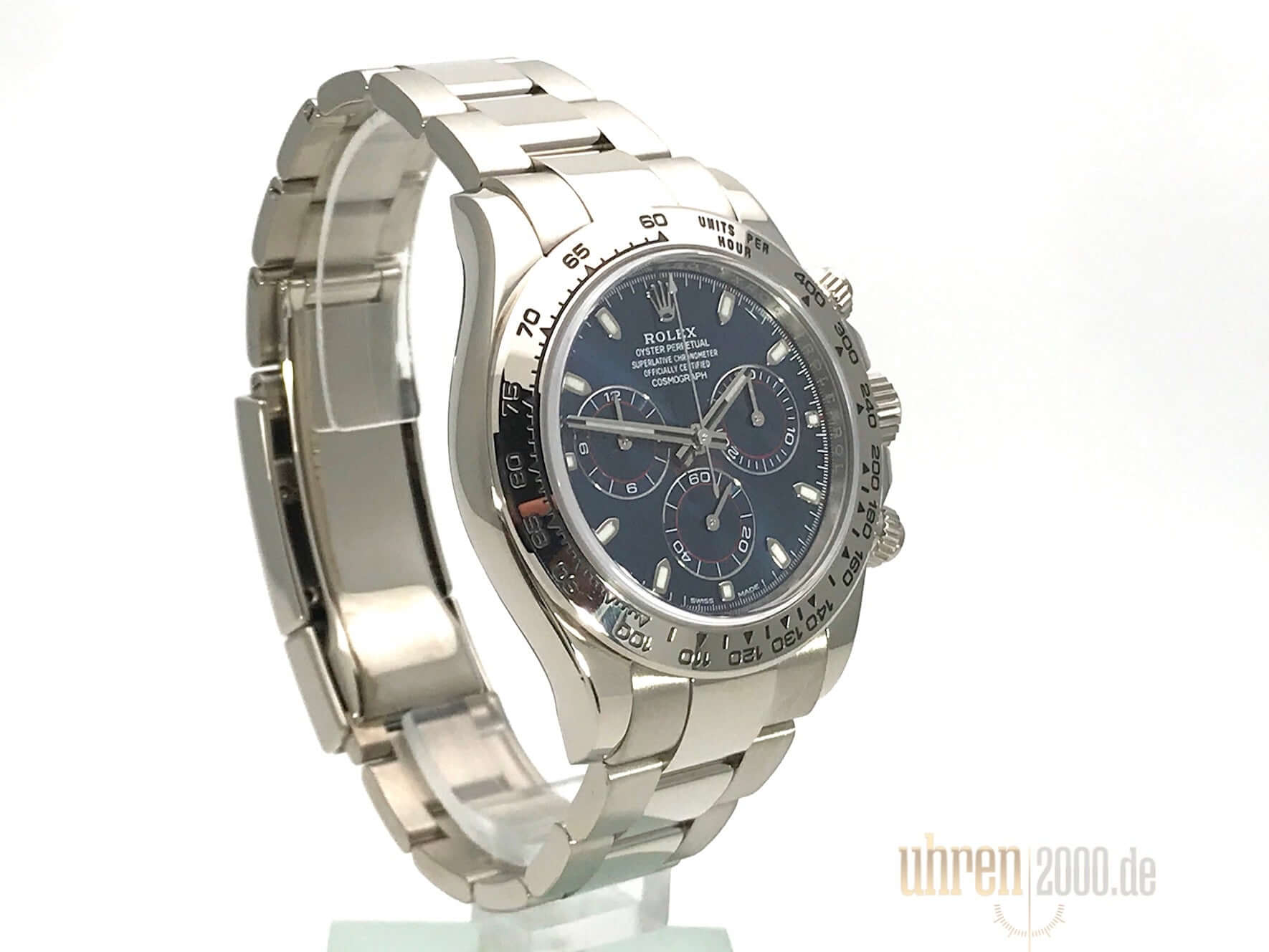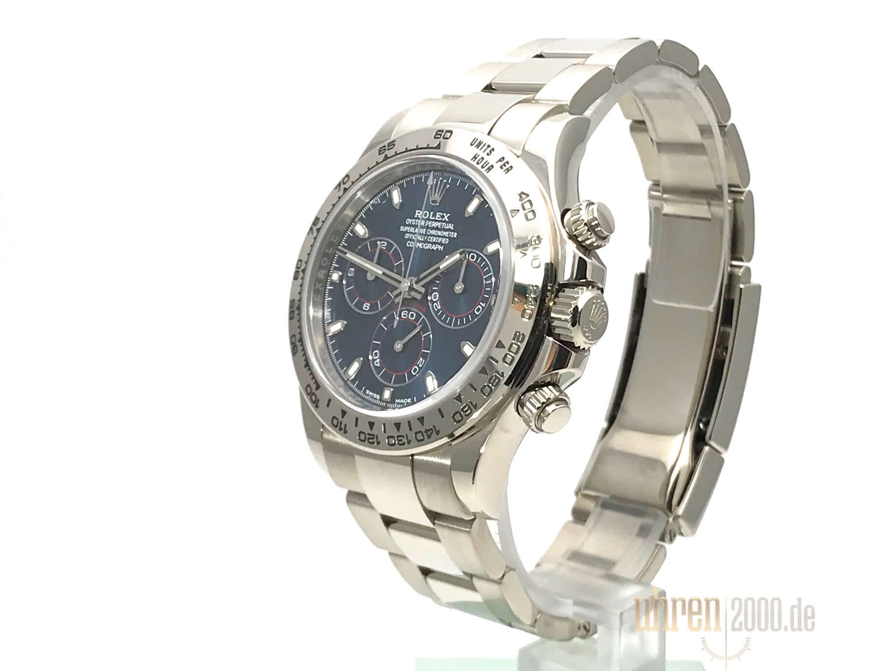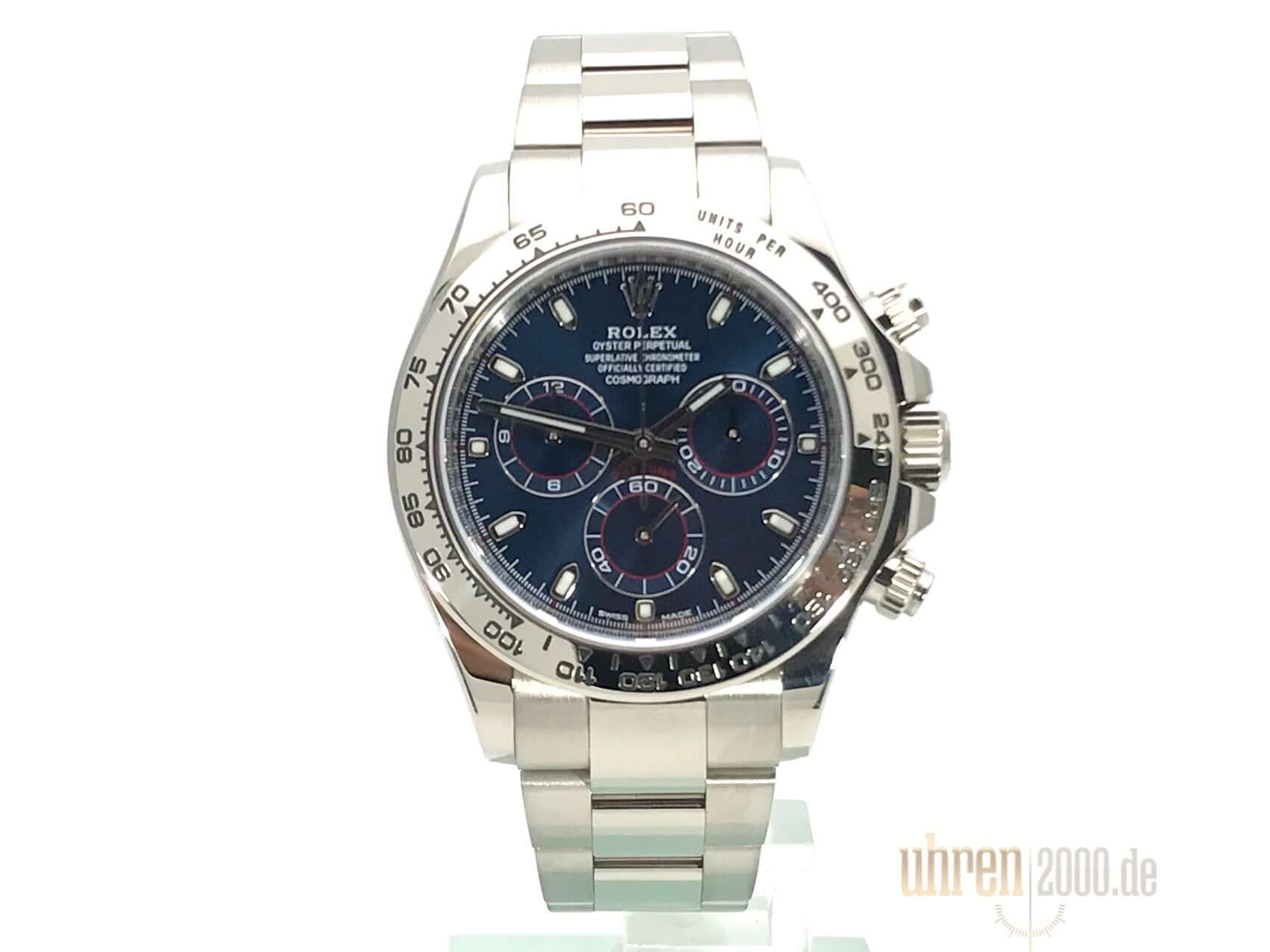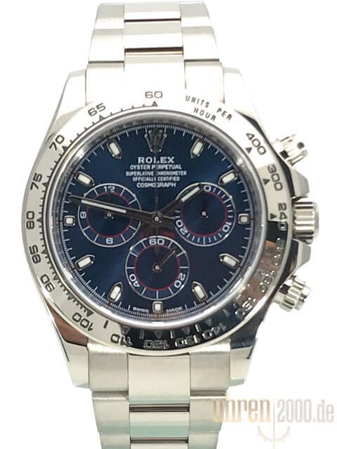 Gehäuse aus 18 kt Weißgold poliert und satiniert, Gehäusedurchmesser 40 mm, Lünette aus 18 kt Weißgold poliert mit Tachymeterskala, Oyster 18 kt Weißgold Armband poliert und satiniert mit Faltschließe, blaues Zifferblatt mit Leuchtindex, Leuchtzeiger, Automatikwerk, Rolex Manufakturkaliber 4130 mit 44 Steine, Schwingung 28.800 A/h, 72 Stunden Gangreserve, Chronometer, kratzfestes Saphirglas, verschraubter Boden aus 18 kt Weißgold, Wasserdicht bis zu 10 bar.