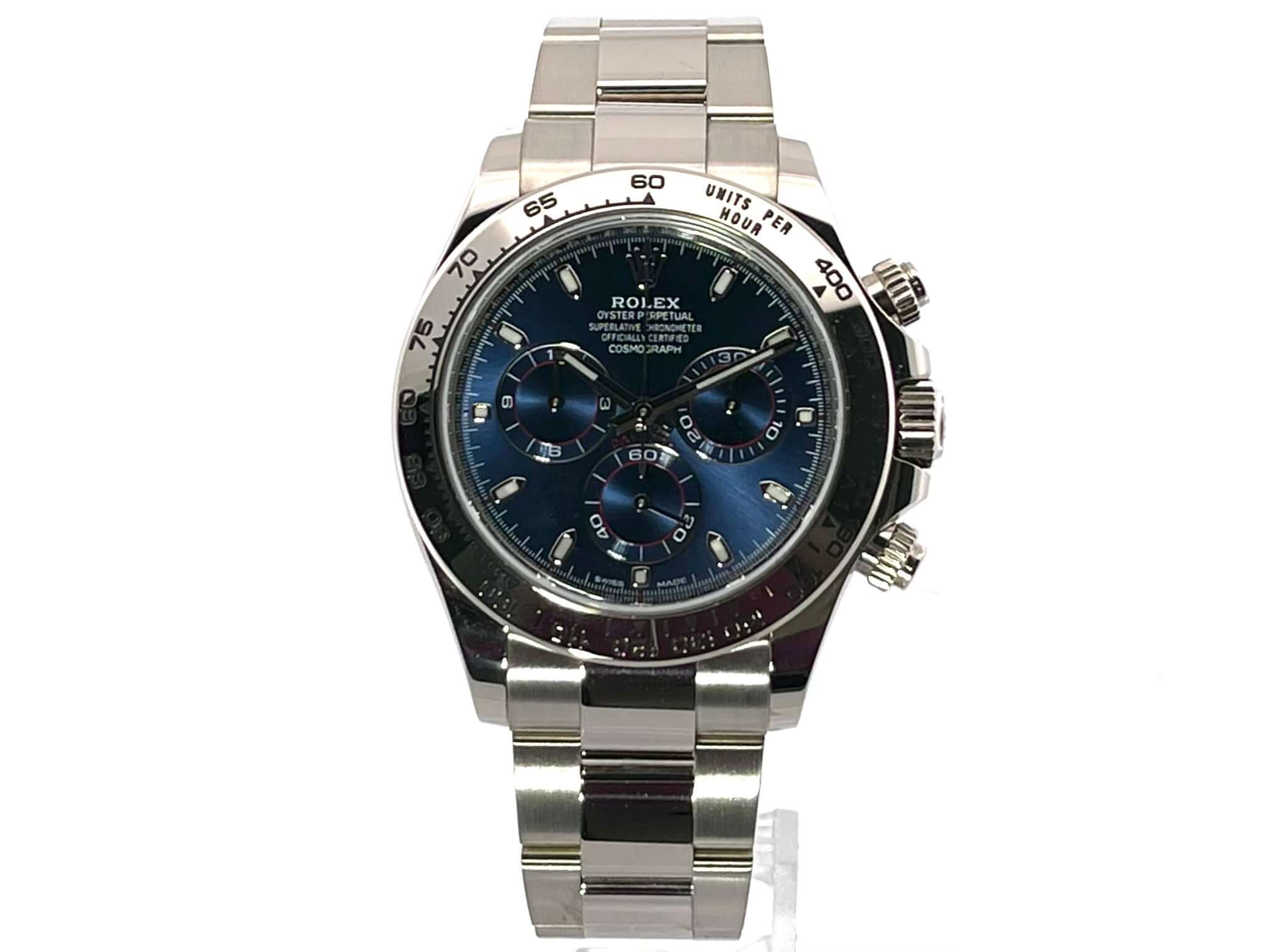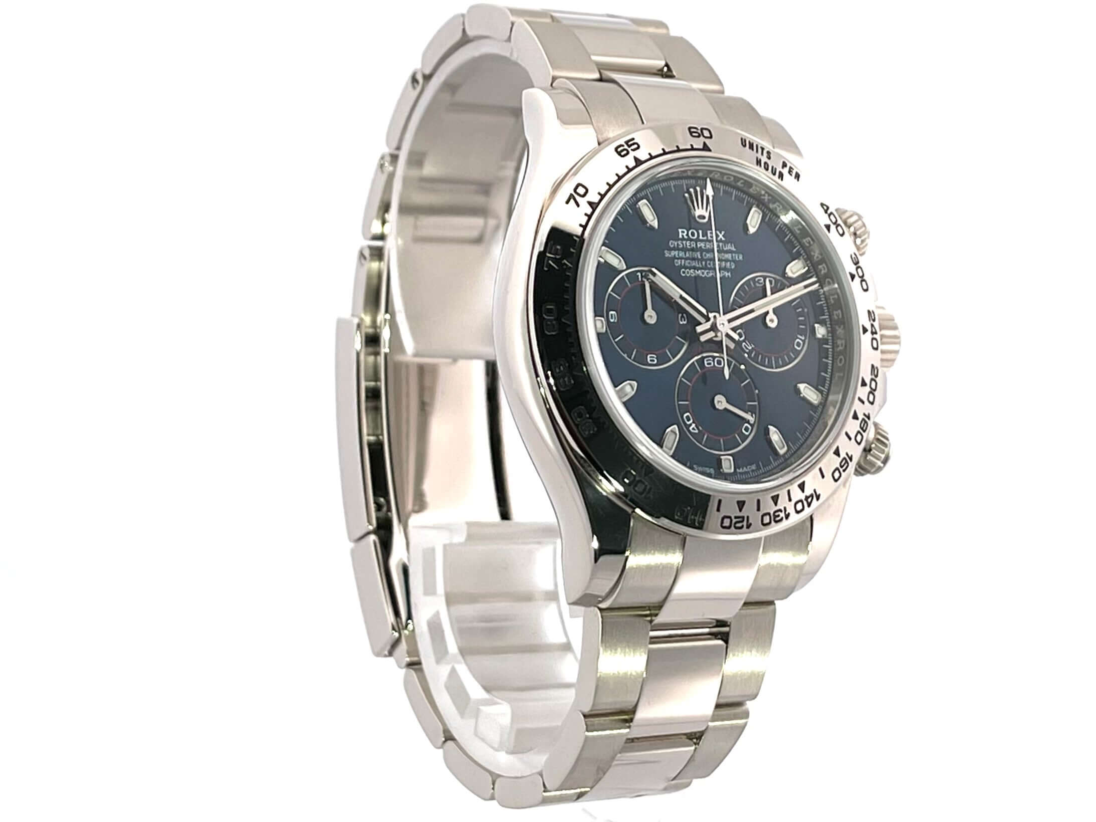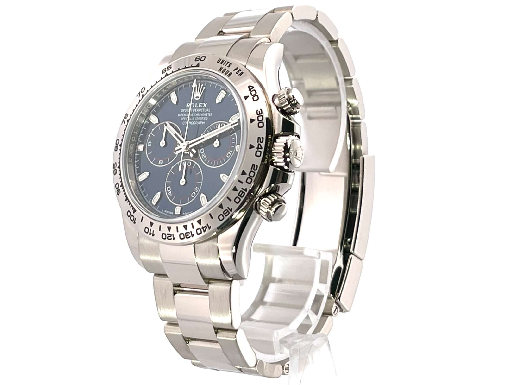 Gehäuse aus 18 kt Weißgold poliert und satiniert, Gehäusedurchmesser 40 mm, Lünette aus 18 kt Weißgold poliert mit Tachymeterskala, Oyster 18 kt Weißgold Armband poliert und satiniert mit Faltschließe, blaues Zifferblatt mit Leuchtindizes, Leuchtzeiger, Automatikwerk, Rolex Manufakturkaliber 4130 mit 44 Steine, Schwingung 28.800 A/h, 72 Stunden Gangreserve, Chronometer, kratzfestes Saphirglas, verschraubter Boden aus 18 kt Weißgold, Wasserdicht bis zu 10 bar.