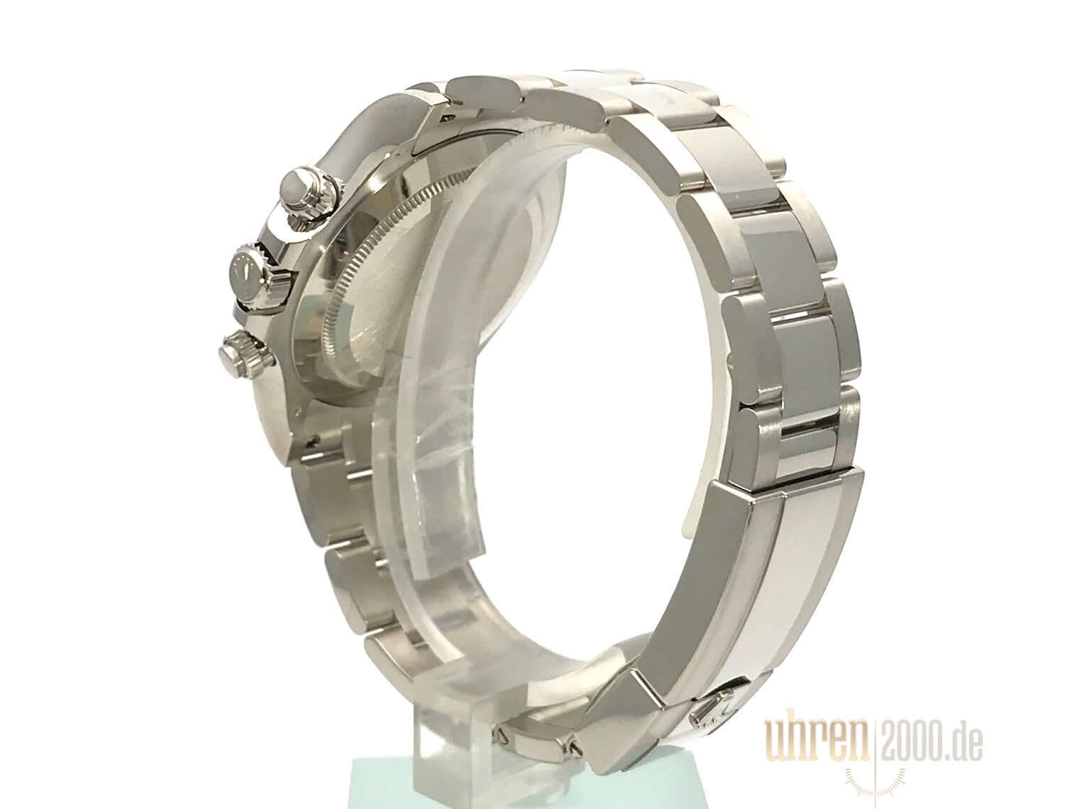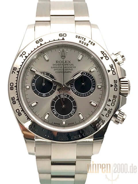 Gehäuse aus 18 kt Weißgold poliert und satiniert, Gehäusedurchmesser 40 mm, Lünette aus 18 kt Weißgold poliert mit Tachymeterskala, Oyster 18 kt Weißgold Armband poliert und satiniert mit Faltschließe, graues Zifferblatt mit Leuchtindizes, Leuchtzeiger, Automatikwerk, Rolex Manufakturkaliber 4130 mit 44 Steine, Schwingung 28.800 A/h, 72 Stunden Gangreserve, Chronometer, kratzfestes Saphirglas, verschraubter Boden aus 18 kt Weißgold, Wasserdicht bis zu 10 bar.