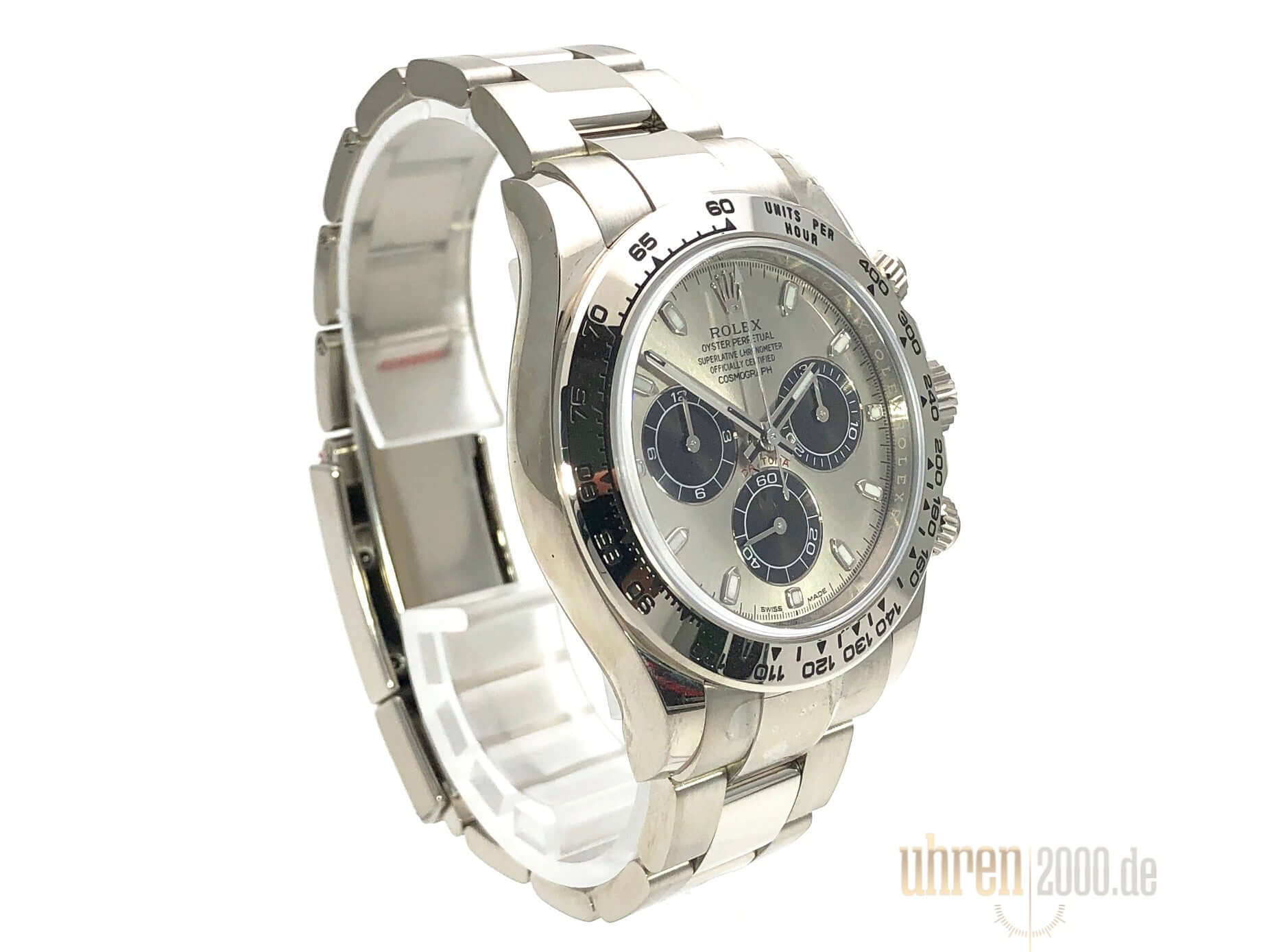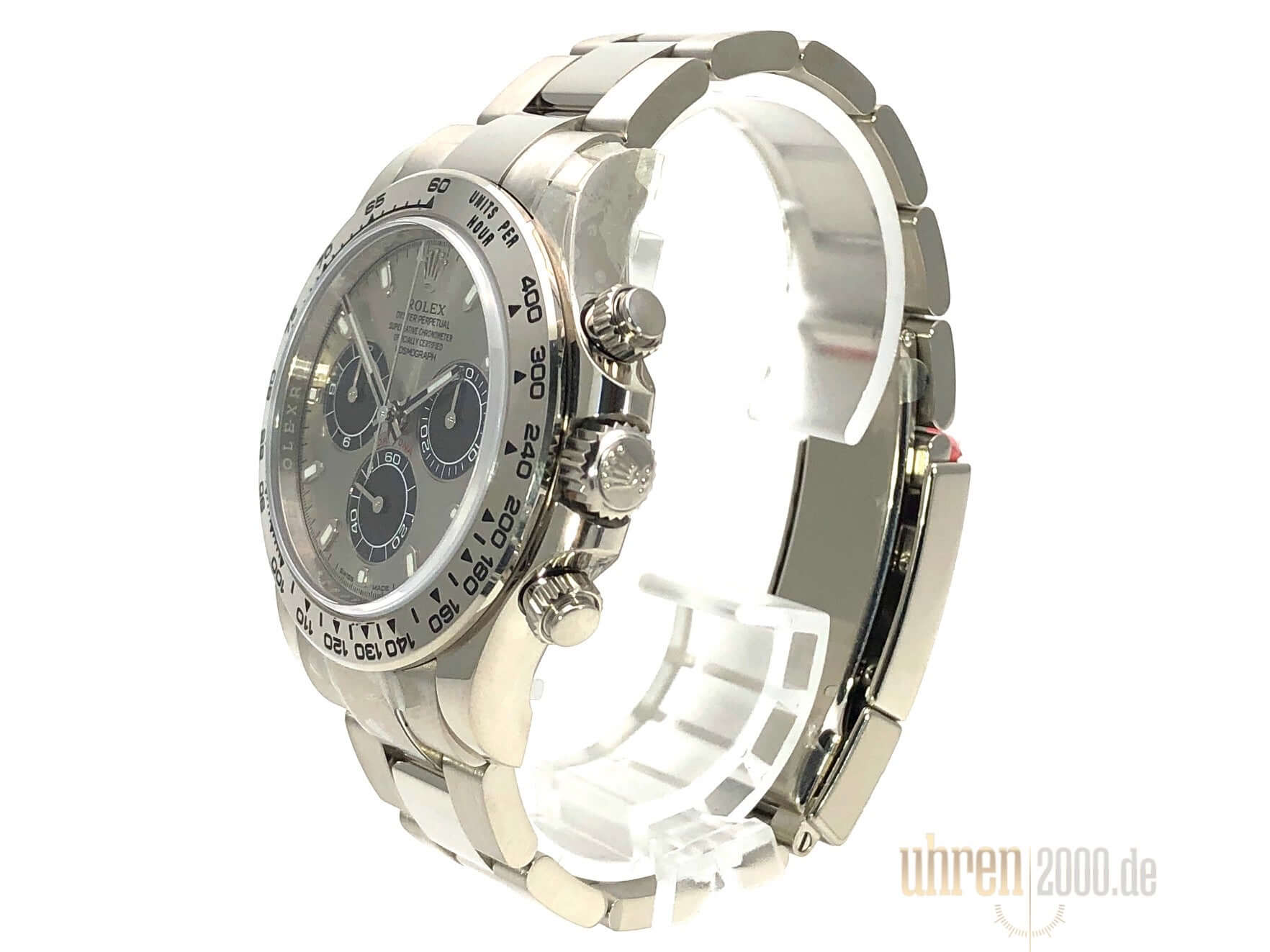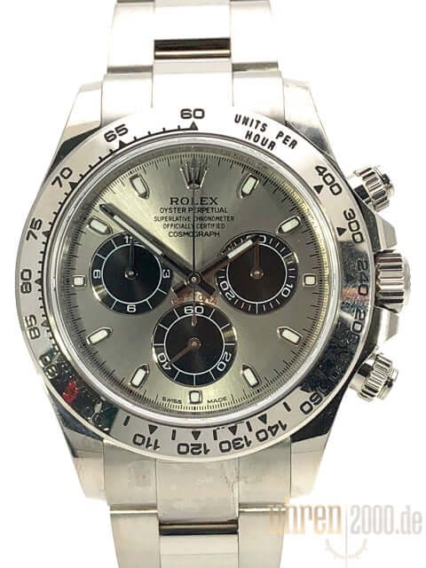 Gehäuse aus 18 kt Weißgold poliert und satiniert, Gehäusedurchmesser 40 mm, Lünette aus 18 kt Weißgold poliert mit Tachymeterskala, Oyster 18 kt Weißgold Armband poliert und satiniert mit Faltschließe, graues Zifferblatt mit Leuchtindizes, Leuchtzeiger, Automatik, Rolex Manufakturkaliber 4130 mit 44 Steine, Schwingung 28.800 A/h, 72 Stunden Gangreserve, Chronometer, kratzfestes Saphirglas, verschraubter Boden aus 18 kt Weißgold, Wasserdicht bis zu 10 bar.