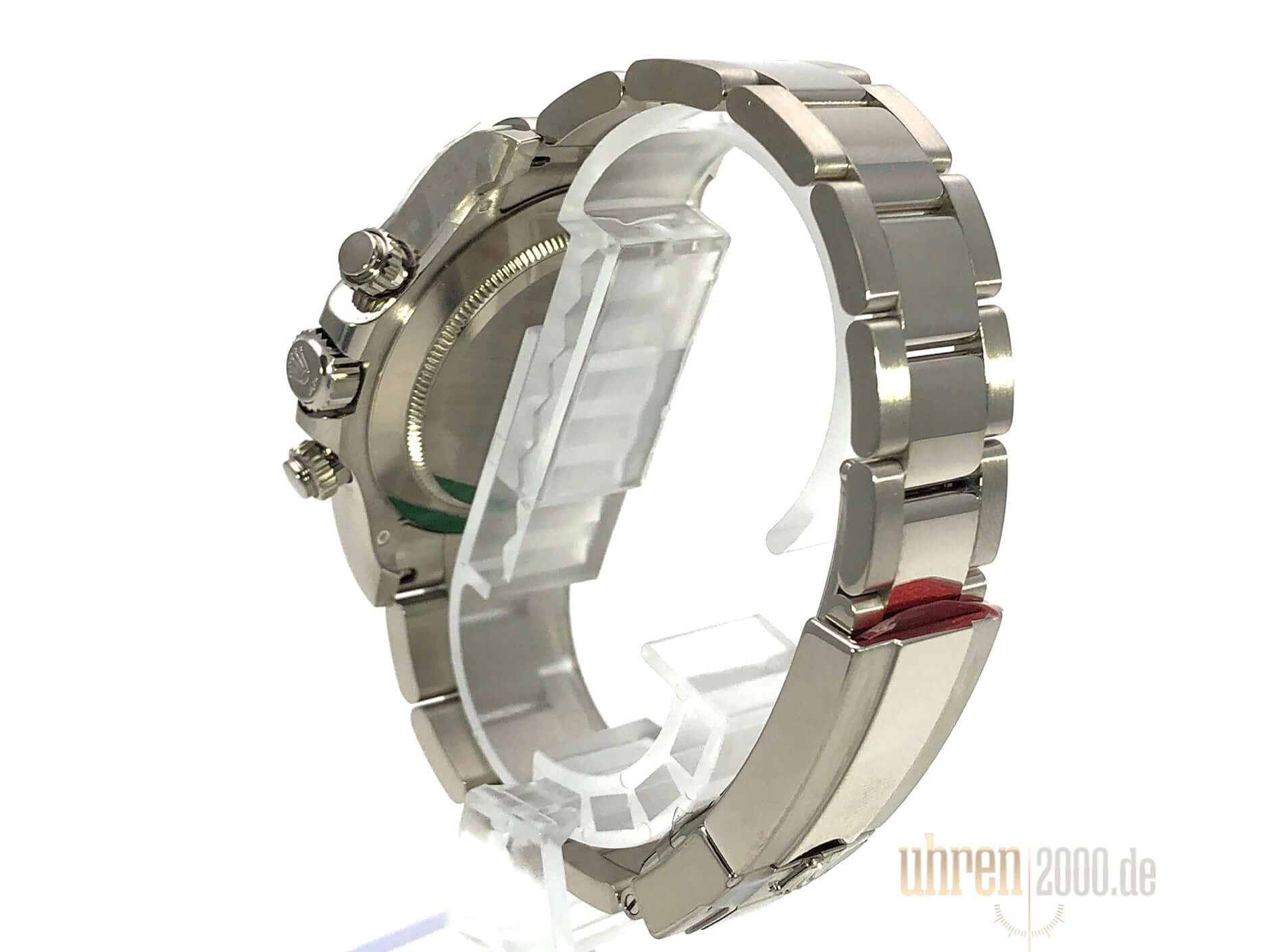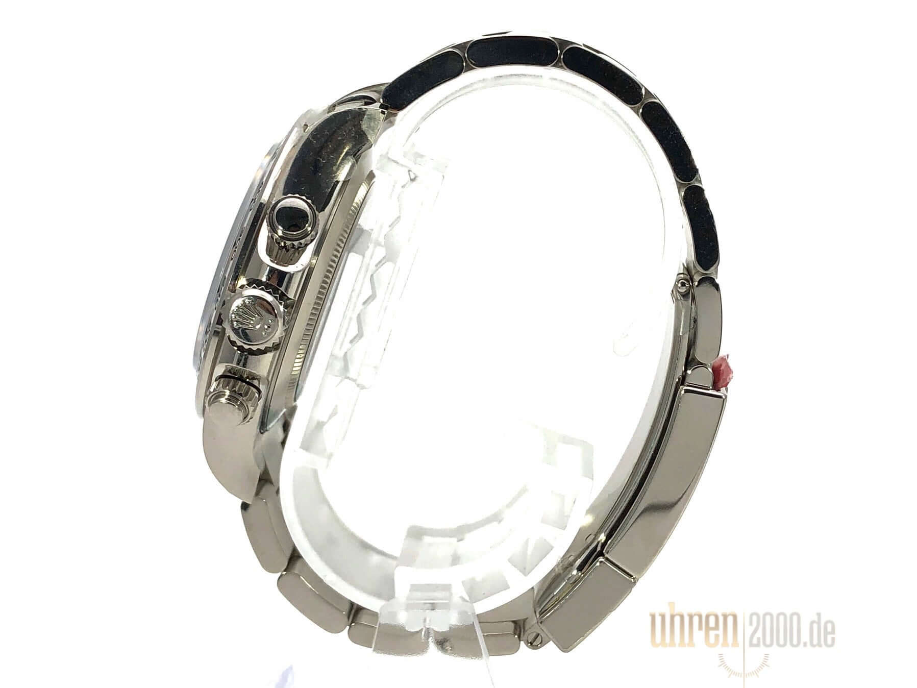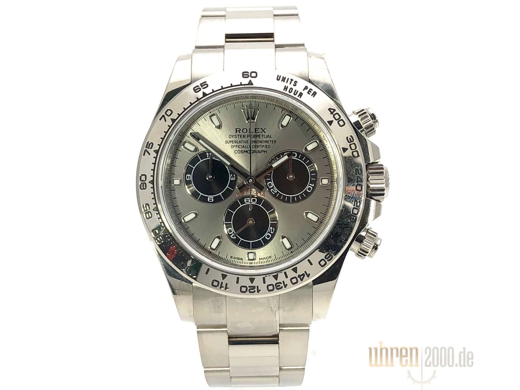 Gehäuse aus 18 kt Weißgold poliert und satiniert, Gehäusedurchmesser 40 mm, Lünette aus 18 kt Weißgold poliert mit Tachymeterskala, Oyster 18 kt Weißgold Armband poliert und satiniert mit Faltschließe, graues Zifferblatt mit Leuchtindizes, Leuchtzeiger, Automatik, Rolex Manufakturkaliber 4130 mit 44 Steine, Schwingung 28.800 A/h, 72 Stunden Gangreserve, Chronometer, kratzfestes Saphirglas, verschraubter Boden aus 18 kt Weißgold, Wasserdicht bis zu 10 bar.
