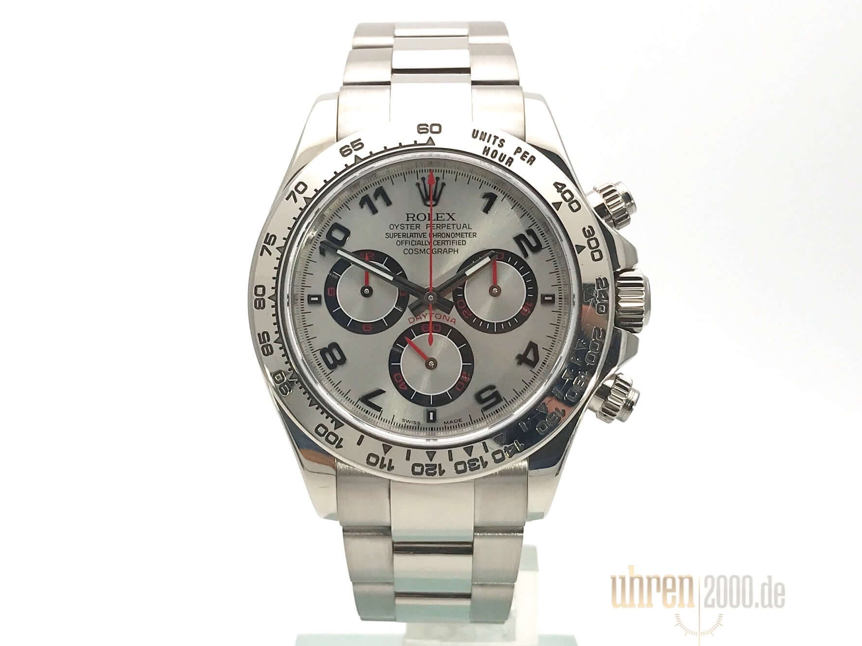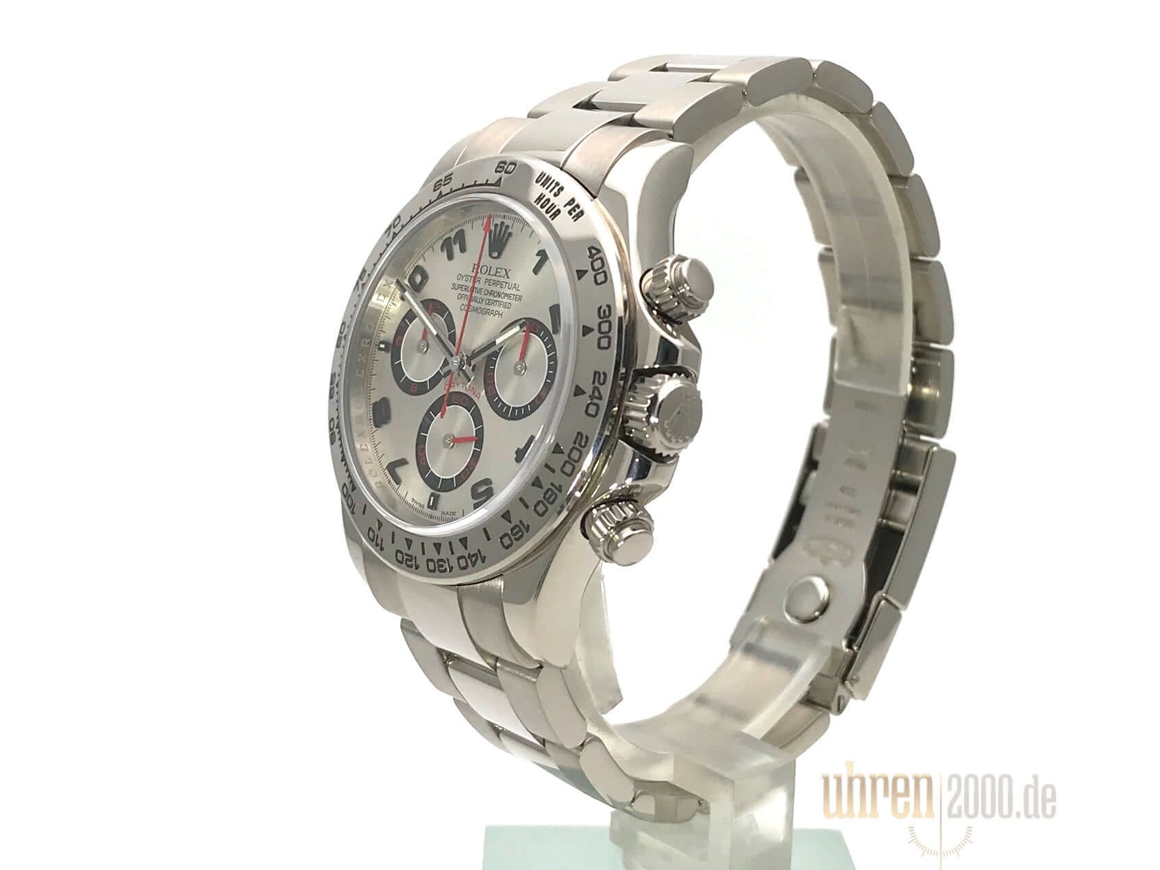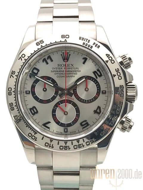Gehäuse aus 18 kt Weißgold poliert und satiniert, Gehäusedurchmesser 40 mm, Lünette 18 kt Weißgold poliert und feststehende gravierte Tachymeterskala, Oyster 18 kt Weißgold Armband poliert und satiniert mit Faltschließe, silberfarbenes Zifferblatt mit arabischen Zahlen, Automatikwerk, Rolex Manufakturkaliber 4130 mit 44 Steine, Schwingung 28.800 A/h, Chronometer, kratzfestes Saphirglas, verschraubter 18 kt Weißgold Boden, Wasserdicht bis zu 10 bar.