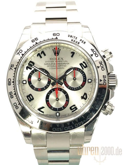 Gehäuse aus 18 kt Weißgold poliert und satiniert, Gehäusedurchmesser 40 mm, Lünette 18 kt Weißgold poliert und feststehende gravierte Tachymeterskala, Oyster 18 kt Weißgold Armband poliert und satiniert mit Faltschließe, silberfarbenes Zifferblatt mit arabischen Zahlen, Automatik, Rolex Manufakturkaliber 4130 mit 44 Steine, Schwingung 28.800 A/h, Chronometer, kratzfestes Saphirglas, verschraubter 18 kt Weißgold Boden, Wasserdicht bis zu 10 bar.