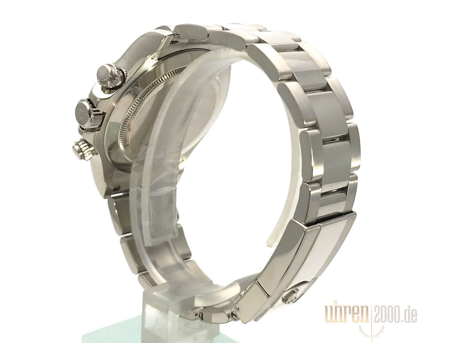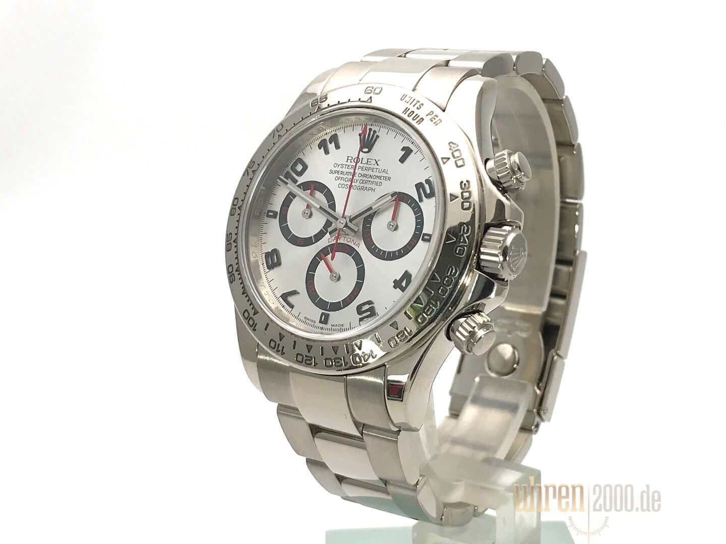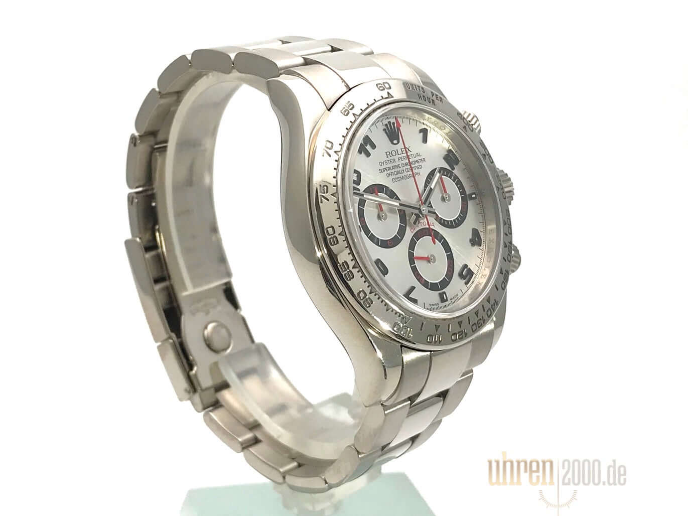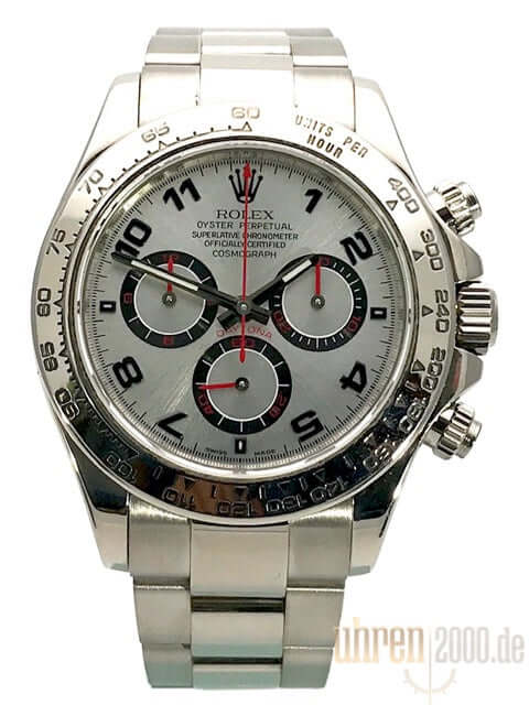 Gehäuse aus 18 kt Weißgold poliert und satiniert, Gehäusedurchmesser 40 mm, Lünette 18 kt Weißgold poliert und feststehende gravierte Tachymeterskala, Oyster 18 kt Weißgold Armband poliert und satiniert mit Faltschließe, silberfarbenes Zifferblatt mit arabischen Zahlen, Automatikwerk, Rolex Manufakturkaliber 4130 mit 44 Steine, Schwingung 28.800 A/h, Chronometer, kratzfestes Saphirglas, verschraubter 18 kt Weißgold Boden, Wasserdicht bis zu 10 bar.