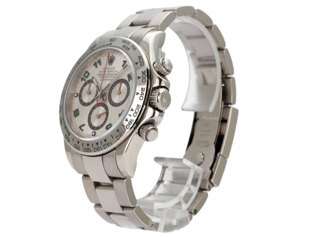 Gehäuse aus 18 kt Weißgold poliert und satiniert, Gehäusedurchmesser 40 mm, Lünette 18 kt Weißgold poliert und feststehende gravierte Tachymeterskala, Oyster 18 kt Weißgold Armband poliert und satiniert mit Faltschließe, silberfarbenes Zifferblatt mit arabischen Zahlen, Automatik, Rolex Manufakturkaliber 4130 mit 44 Steine, Schwingung 28.800 A/h, Chronometer, kratzfestes Saphirglas, verschraubter 18 kt Weißgold Boden, wasserdicht bis zu 10 bar.
