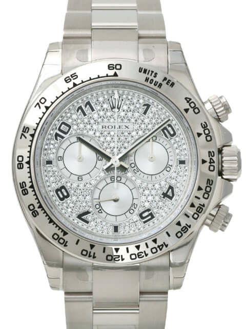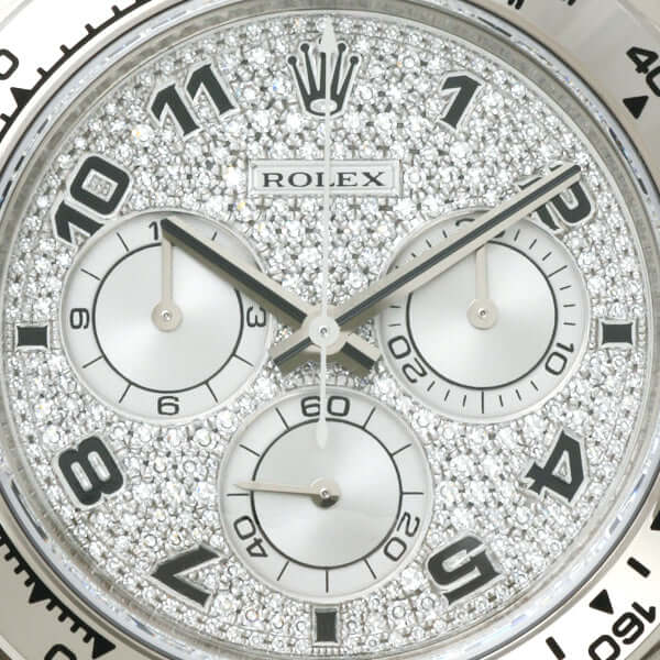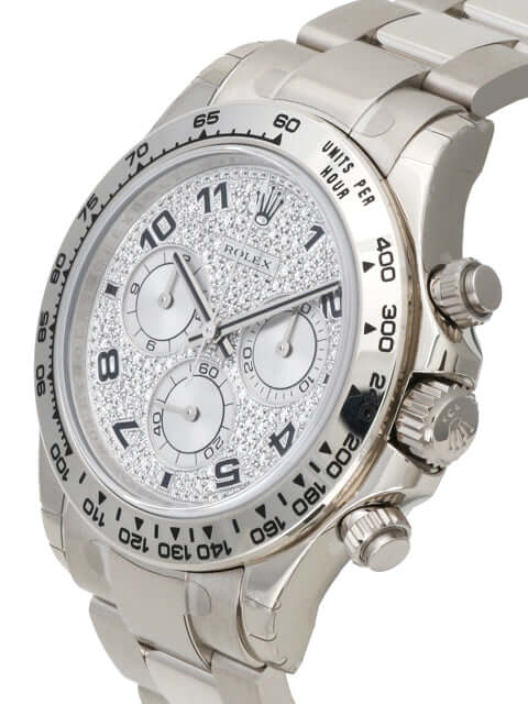 Gehäuse aus 18 kt Weißgold poliert und satiniert, Gehäusedurchmesser 40 mm, Lünette aus 18 kt Weißgold poliert mit gravierter Tachymeterskala, Oyster Armband 18 kt Weißgold poliert und satiniert mit Faltschließe, Diamant Zifferblatt mit arabischen Emailziffern, Automatikwerk, Chronometer mit C.O.S.C. Zertifizierung, Rolex Manufakturkaliber 4130 mit 44 Steine, Schwingung 28.800 A/h, Anzeige von Stunden und Minuten aus der Mitte, kratzfestes Saphirglas, verschraubter Boden 18 kt Weißgold, Wasserdicht bis zu 10 bar.
