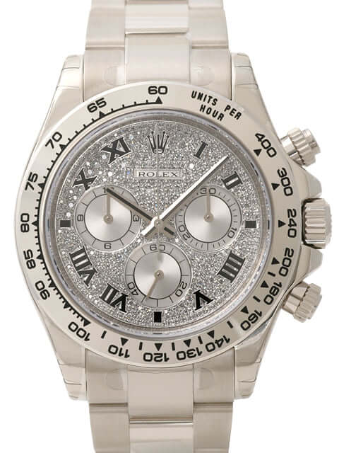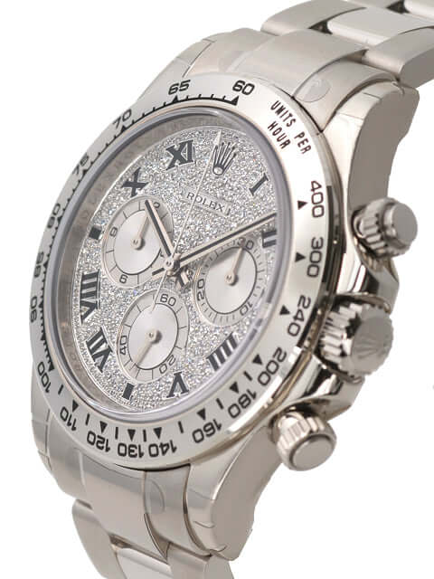 Gehäuse aus 18 kt Weißgold poliert und satiniert, Gehäusedurchmesser 40mm, Lünette aus 18 kt Weißgold poliert mit gravierter Tachymeterskala, Oyster Armband 18 kt Weißgold poliert und satiniert mit Faltschließe, Diamant Zifferblatt mit römischen Emailziffern, Automatikwerk, Chronometer mit C.O.S.C. Zertifizierung, Rolex Manufakturkaliber 4130 mit 44 Steine, Schwingung 28.800 A/h, Anzeige von Stunden und Minuten aus der Mitte, kratzfestes Saphirglas, verschraubter Boden 18 kt Weißgold, Wasserdicht bis zu 10 bar.