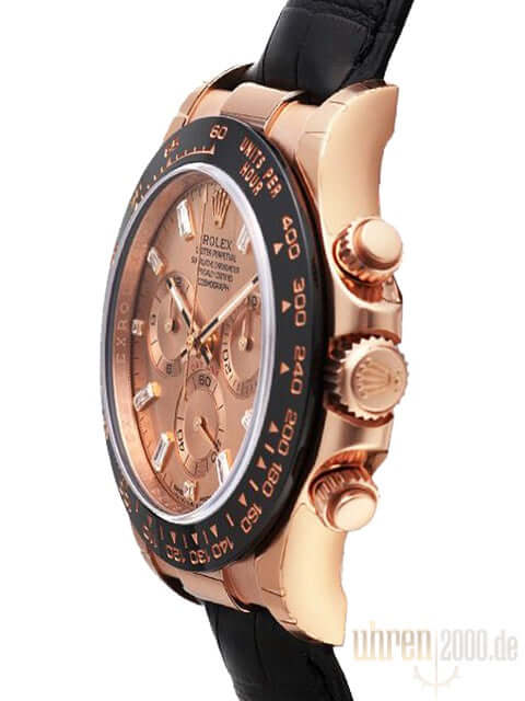 Gehäuse 18 kt Rosegold Everose poliert und satiniert, Gehäusedurchmesser 40 mm, Keramik Lünette graviert, schwarzes Krokoleder Armband mit Faltschließe, Zifferblatt pink mit 11 Diamanten Baguette, Leuchtzeiger aus Rosegold, Automatikwerk, Chronometer, Rolex Manufakturkaliber 4130 mit 44 Steine, Schwingung 28.800 A/h, kleine Sekunde, kratzfestes Saphirglas, verschraubte 18 kt Rosegold Everose Krone mit Flankenschutz, verschraubter 18 kt Rosegold Everose Boden, Wasserdicht bis zu 10 bar.
