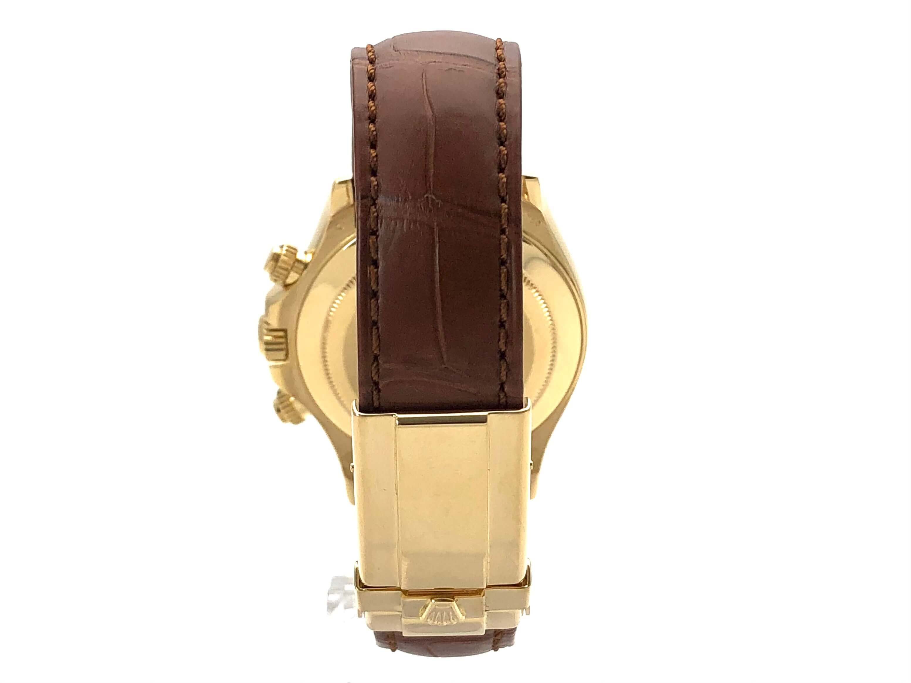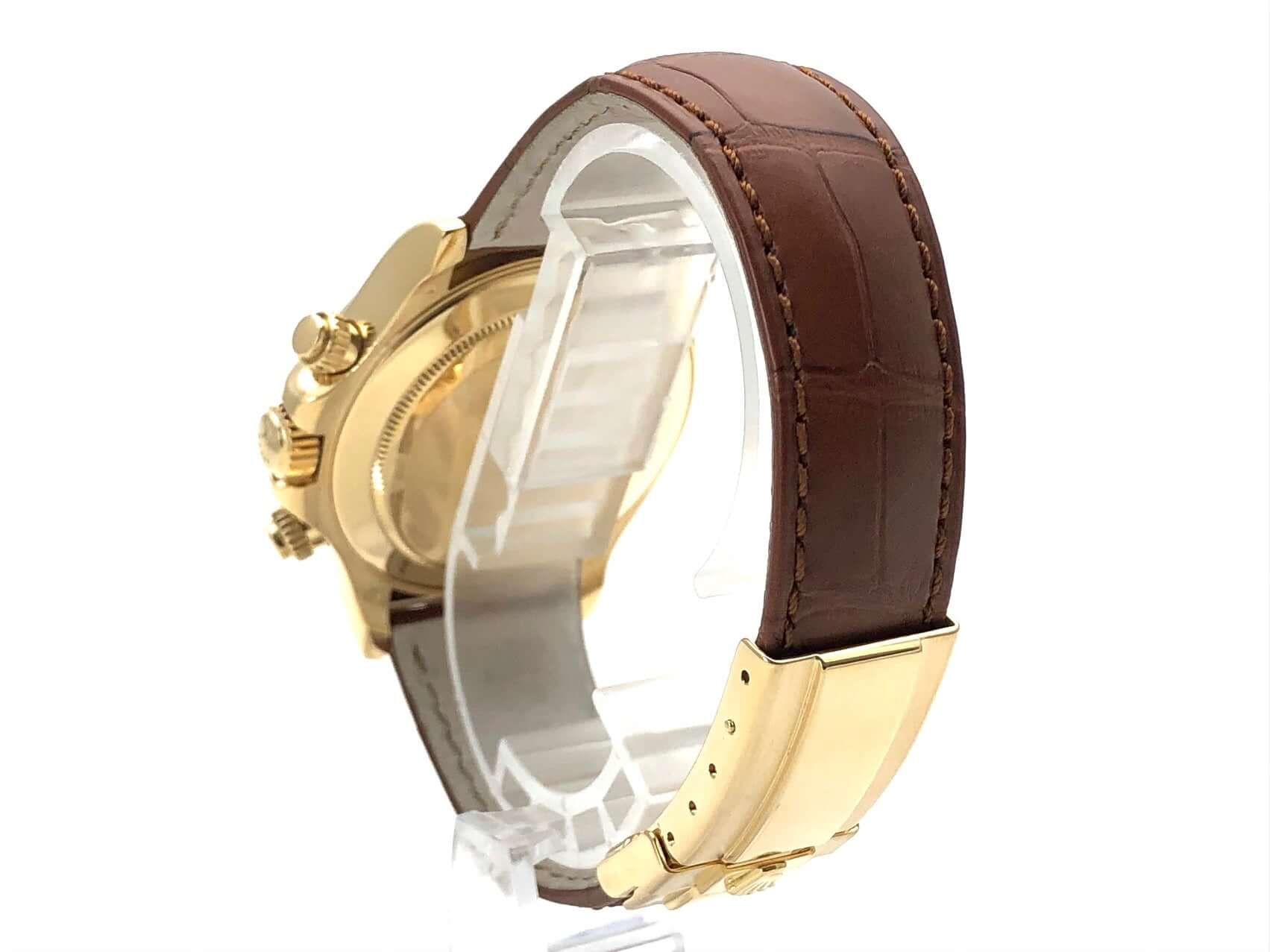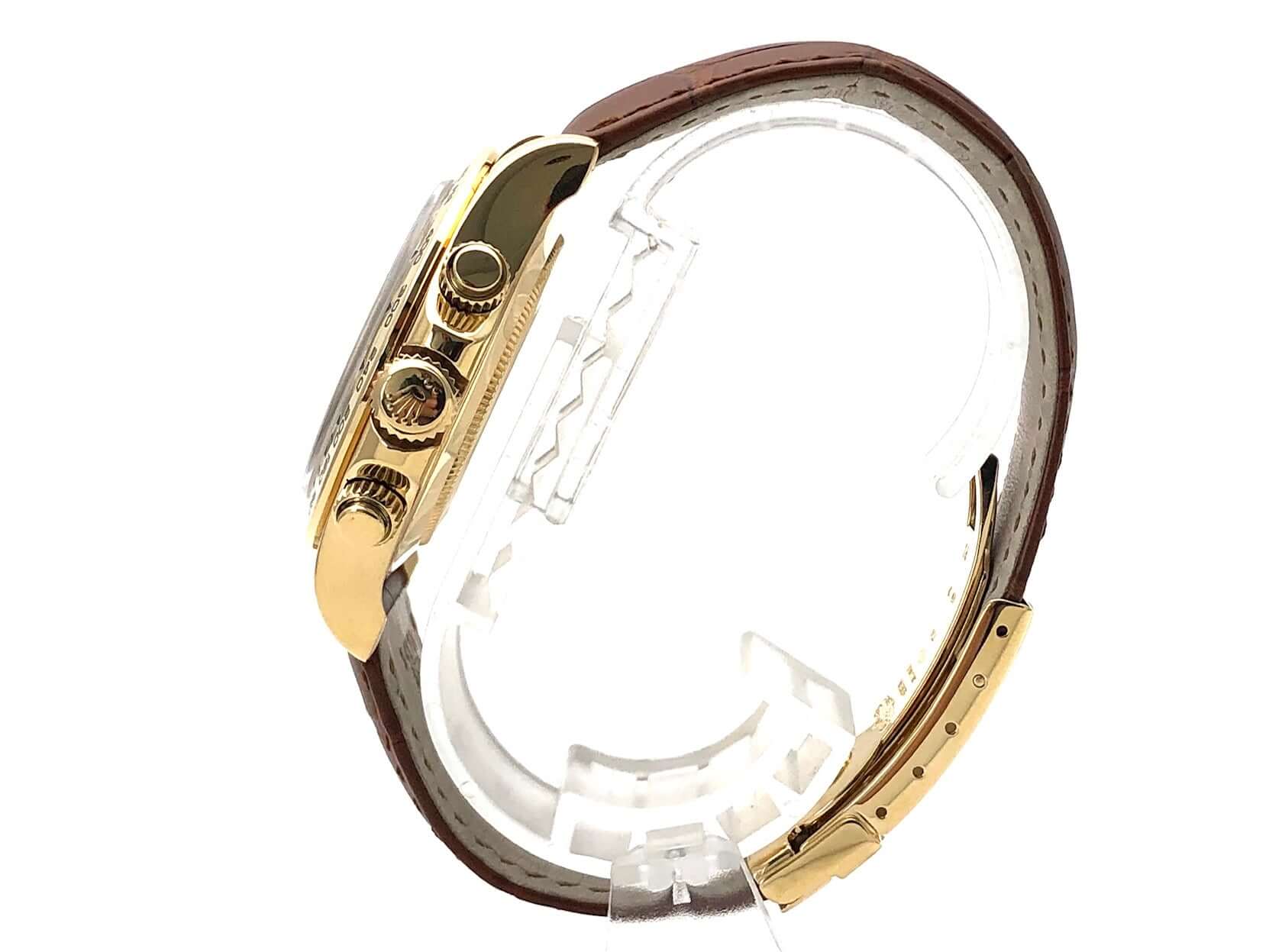 Gehäuse aus 18 kt Gelbgold poliert und satiniert, Gehäusedurchmesser 40mm, Lünette 18 kt Gelbgold poliert und feststehende gravierte Tachymeterskala, braunes Krokoleder mit 18 kt Gelbgold Faltschließe, blaues Zifferblatt mit arabischen Leuchtziffern, Automatikwerk, Rolex Manufakturkaliber 4130 mit 44 Steine, Schwingung 28.800 A/h, Chronometer, kratzfestes Saphirglas, verschraubter Boden aus 18 kt Gelbgold, Wasserdicht bis zu 10 bar.