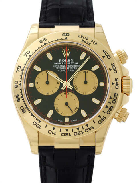 Gehäuse aus 18 kt Gelbgold poliert und satiniert, Gehäusedurchmesser 40 mm, 18 kt Gelbgold Lünette, gravierte Tachymeterlünette poliert und feststehend, Krokoleder Schwarz mit Ziernaht und 18 kt Gelbgold Faltschließe, Zifferblatt schwarz mit Leuchtindex und Totalisatoren champagnerfarben, Automatikwerk, Chronometer mit C.O.S.C. Zertifizierung, Rolex Manufakturkaliber 4130 mit 44 Steine, Anzeige von Stunden und Minuten aus der Mitte, kleine Sekunden Anzeige bei 6 Uhr, kratzfestes Saphirglas, verschraubter 18 kt Gelbgold Boden, Wasserdicht bis zu 10 bar.