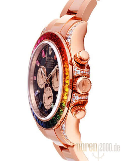 Gehäuse 18 kt Everose-Gold poliert und satiniert, Gehäusedurchmesser 40 mm, Lünette aus 18 kt Everose-Gold besetzt mit 36 Saphiren im Baguetteschliff in den Farben des Regenbogens, Hornbügel mit Diamanten besetzt, Oyster-Armband aus 18 kt Everose-Gold poliert und satiniert mit Faltschließe, schwarzes Zifferblatt mit 11 Saphiren im Baguetteschliff in den Farben des Regenbogens, rosegoldene Leuchtzeiger, Automatikwerk, Chronometer, Rolex Manufakturkaliber 4130 mit 44 Steine, Schwingung 28.800 A/h, kratzfestes Saphirglas, verschraubter Boden aus 18 kt Rosegold Everose, Wasserdicht bis zu 10 bar.