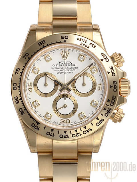 Gehäuse aus 18 kt Gelbgold poliert und satiniert, Gehäusedurchmesser 40 mm, 18 kt Gelbgold Tachymeterlünette, Oyster 18 kt Gelbgold Armband poliert und satiniert mit Faltschließe, weißes Diamantzifferblatt, Automatikwerk, Rolex Manufakturkaliber 4130 mit 44 Steine, Chronometer, Chronograph, kleine Sekunde, kratzfestes Saphirglas, verschraubter 18 kt Gelbgold Boden, Wasserdicht bis zu 10 bar.