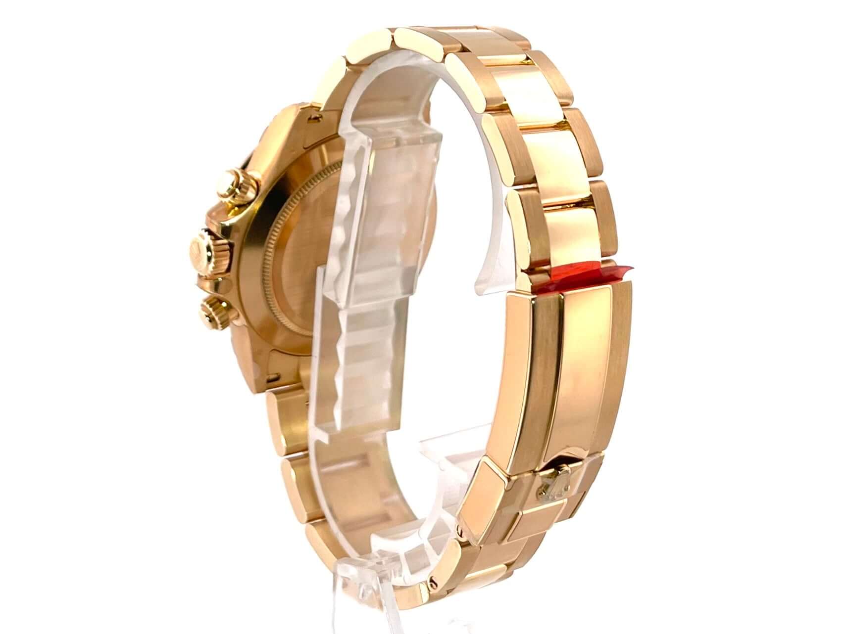 Gehäuse aus 18 kt Gelbgold poliert und satiniert, Gehäusedurchmesser 40 mm, 18 kt Gelbgold Tachymeterlünette, Oyster 18 kt Gelbgold Armband poliert und satiniert mit Faltschließe, grünes Zifferblatt mit Leuchtindizes, Leuchtzeiger, Automatikwerk, Rolex Manufakturkaliber 4130 mit 44 Steine, Chronometer, Chronograph, kleine Sekunde, kratzfestes Saphirglas, verschraubter 18 kt Gelbgold Boden, Wasserdicht bis zu 10 bar.