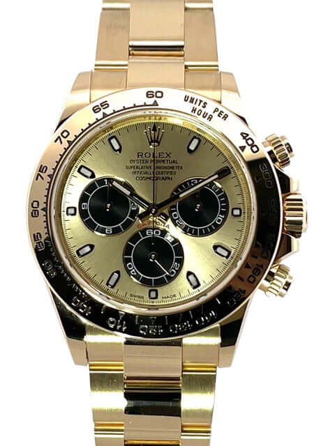 Gehäuse aus 18 kt Gelbgold poliert und satiniert, Gehäusedurchmesser 40 mm, 18 kt Gelbgold Tachymeterlünette, Oyster 18 kt Gelbgold Armband poliert und satiniert mit Faltschließe, Zifferblatt Champagnerfarben mit Leuchtindizes, Leuchtzeiger, Totalisatoren Schwarz, Automatikwerk, Rolex Manufakturkaliber 4130 mit 44 Steine, Chronometer, Chronograph, kleine Sekunde, kratzfestes Saphirglas, verschraubter 18 kt Gelbgold Boden, Wasserdicht bis zu 10 bar.