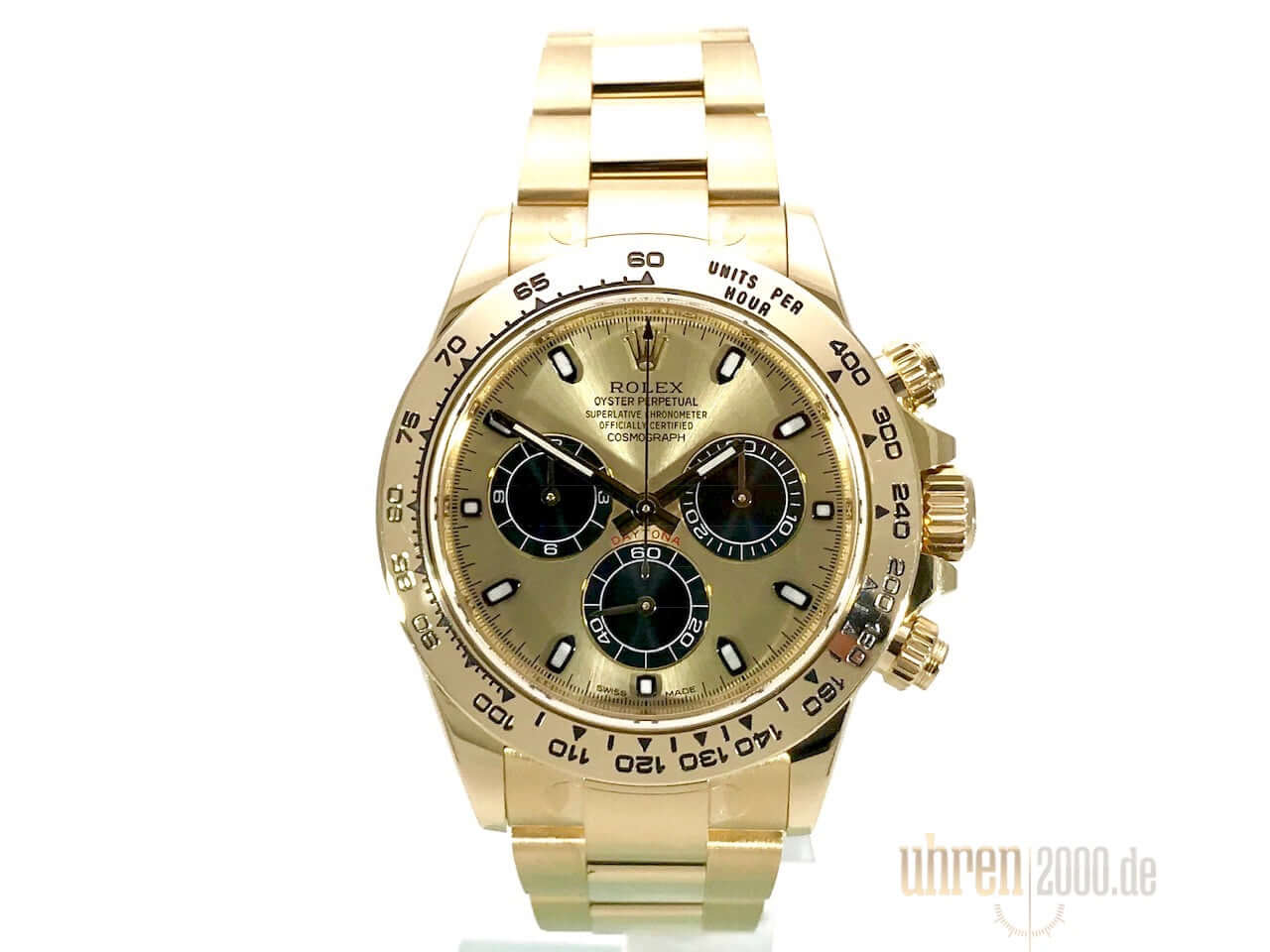 Gehäuse aus 18 kt Gelbgold poliert und satiniert, Gehäusedurchmesser 40 mm, 18 kt Gelbgold Tachymeterlünette, Oyster 18 kt Gelbgold Armband poliert und satiniert mit Faltschließe, Zifferblatt Champagnerfarben mit Leuchtindex, Leuchtzeiger, Totalisatoren Schwarz, Automatikwerk, Rolex Manufakturkaliber 4130 mit 44 Steine, Chronometer, Chronograph, kleine Sekunde, kratzfestes Saphirglas, verschraubter 18 kt Gelbgold Boden, Wasserdicht bis zu 10 bar.