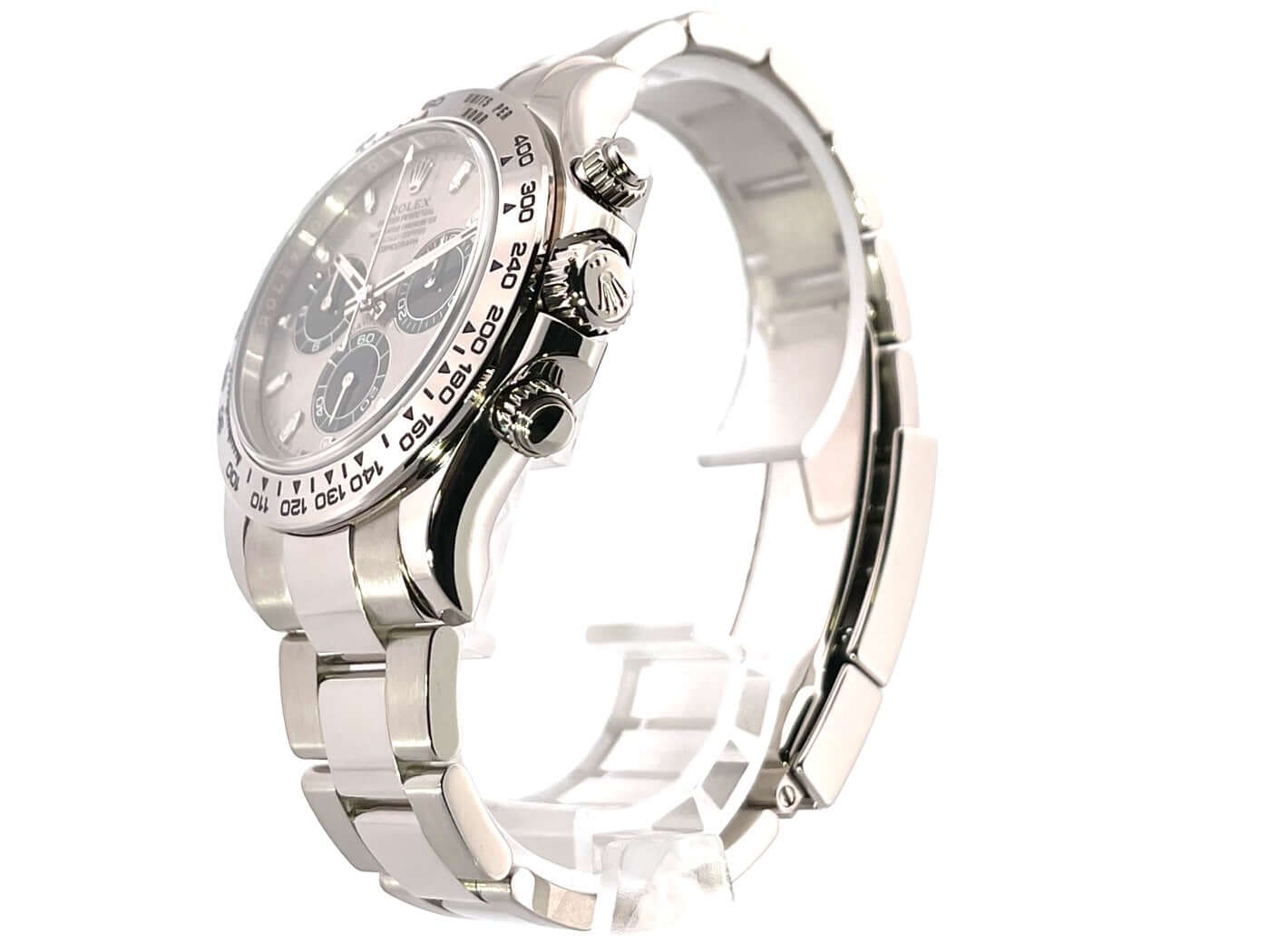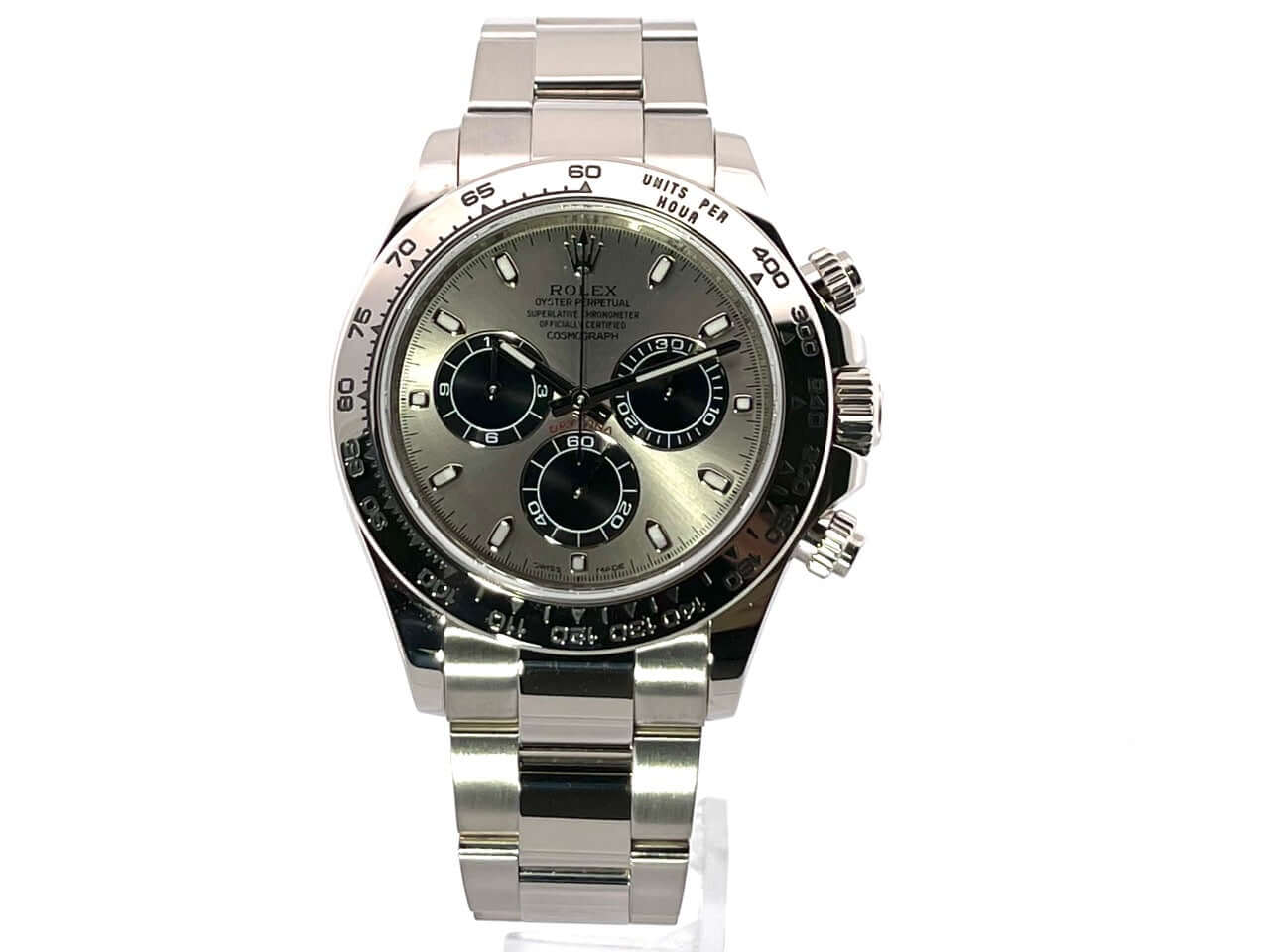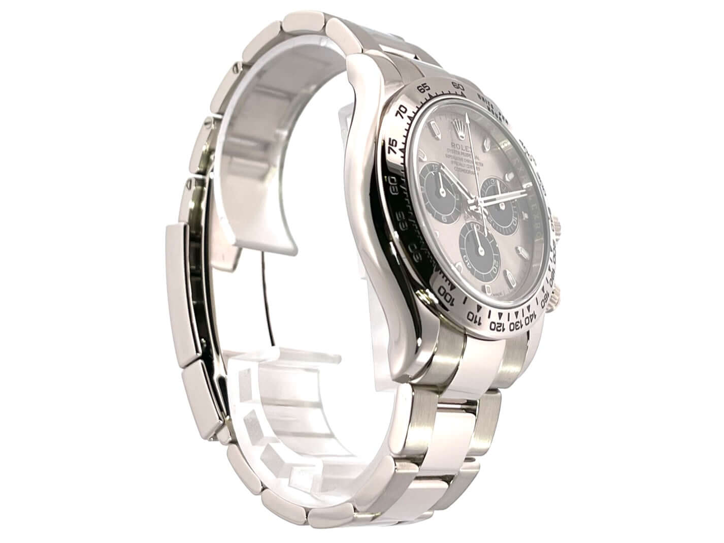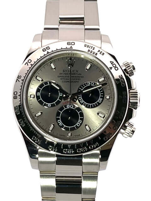 Gehäuse aus 18 kt Weißgold poliert und satiniert, Gehäusedurchmesser 40 mm, Lünette aus 18 kt Weißgold poliert mit Tachymeterskala, Oyster 18 kt Weißgold Armband poliert und satiniert mit Faltschließe, graues Zifferblatt mit Leuchtindizes, Leuchtzeiger, Automatik, Rolex Manufakturkaliber 4130 mit 44 Steine, Schwingung 28.800 A/h, 72 Stunden Gangreserve, Chronometer, kratzfestes Saphirglas, verschraubter Boden aus 18 kt Weißgold, Wasserdicht bis zu 10 bar.